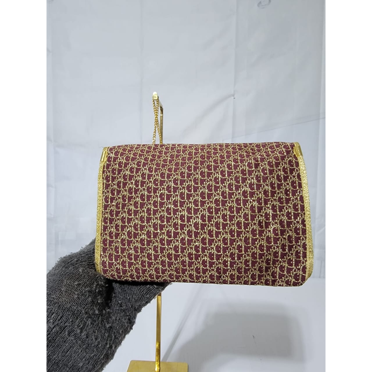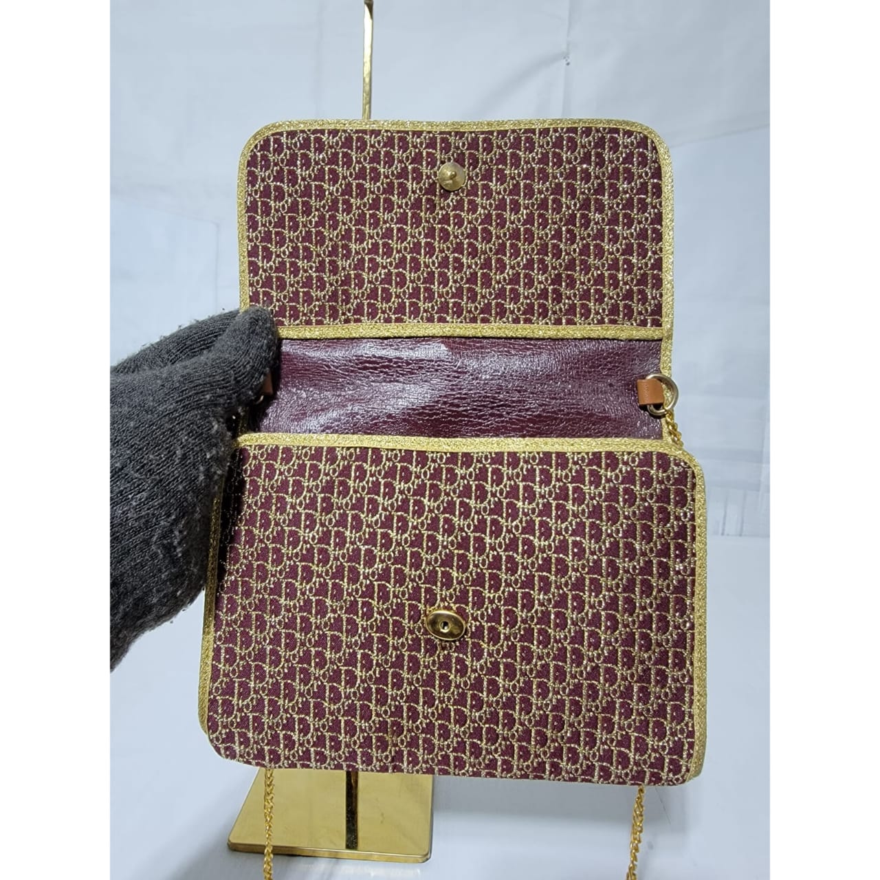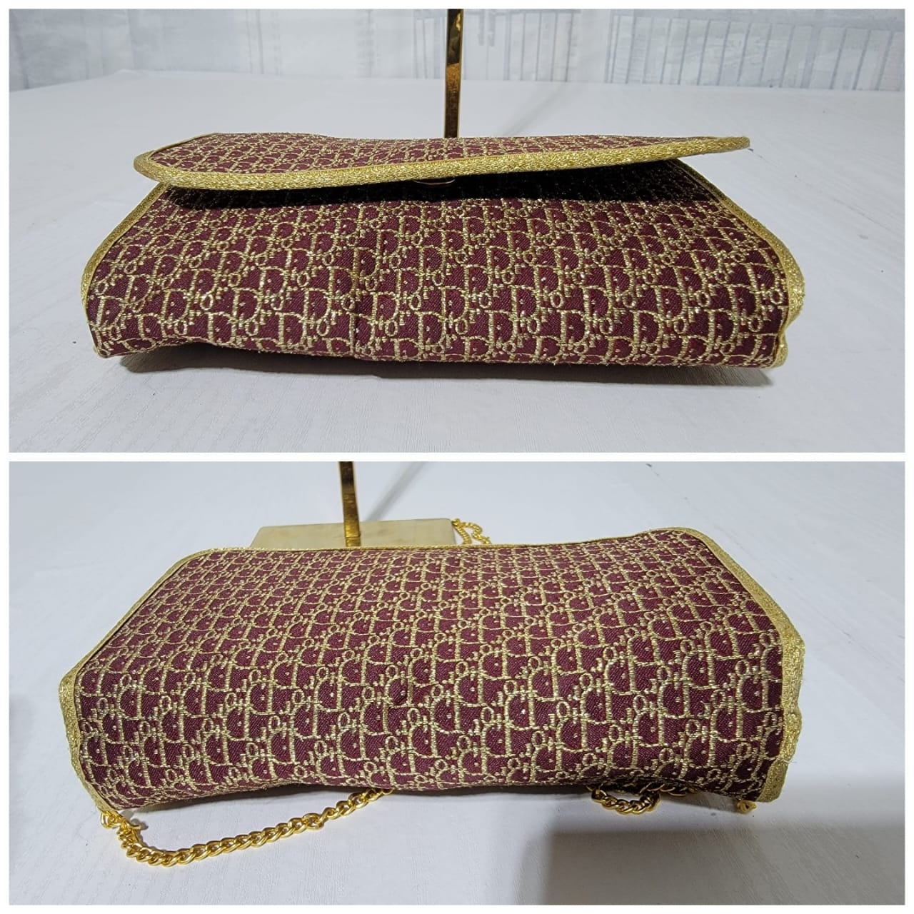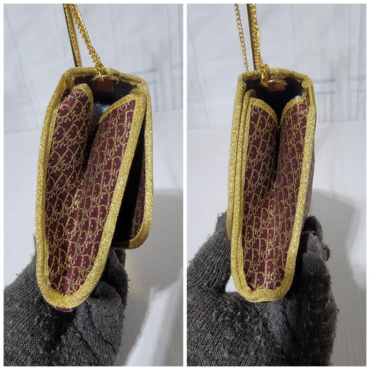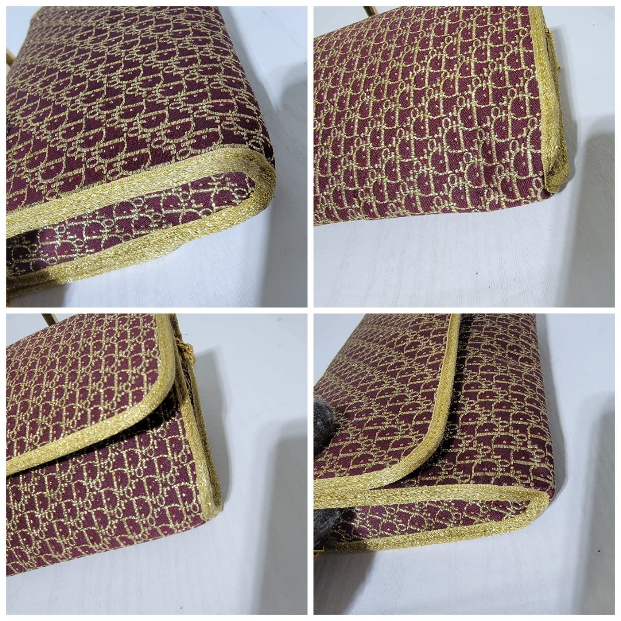 This authentic 1970s Christian Dior Vintage Bordeaux Oblique Monogram and Gold Lurex Canvas Logo Shoulder Bag Burgundy/Gold is in it’s good pre-owned condition. The exterior is clean and beautiful. Interior is clean, it is in it’s vintage condition. It has a gold trim around it.