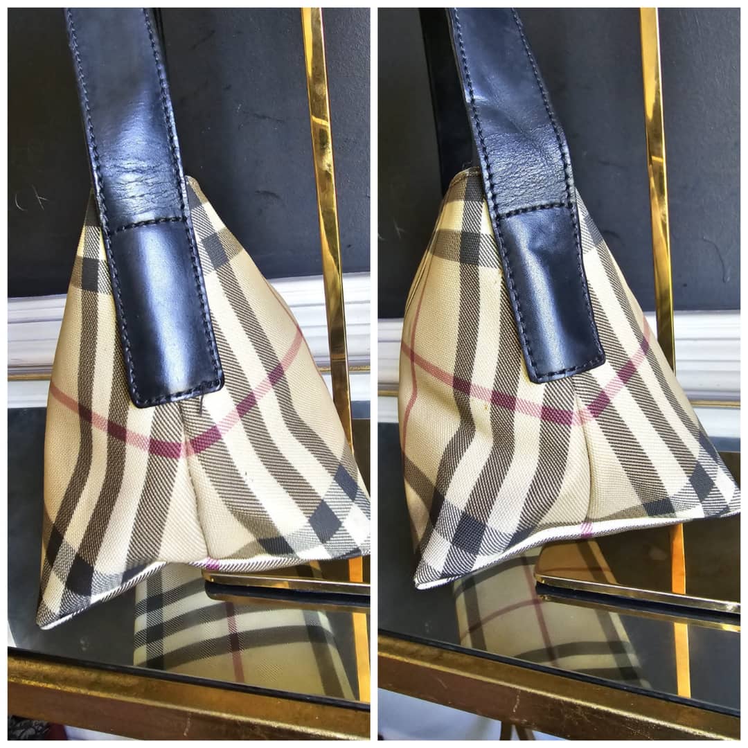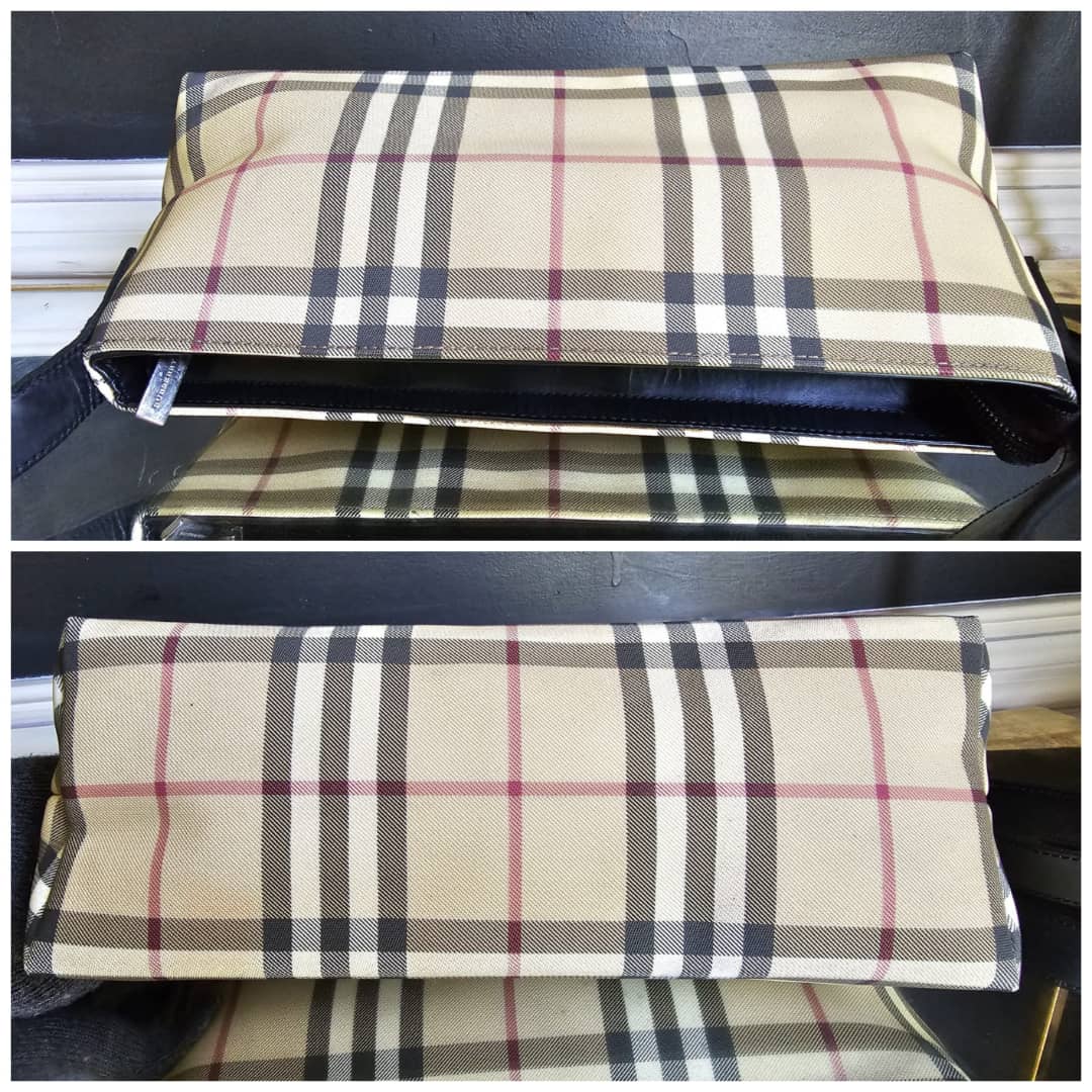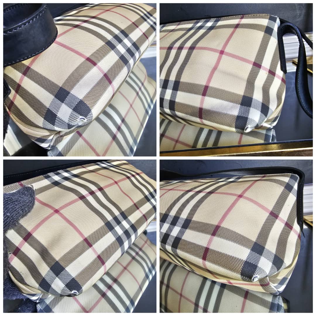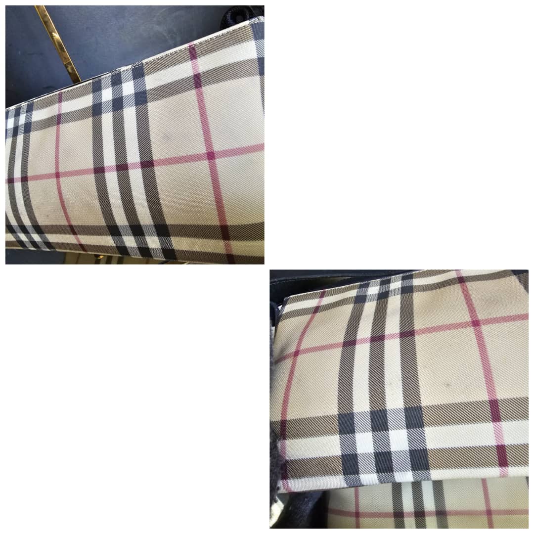 This authentic BURBERRY BAGUETTE BAG BEIGE/BLACK is in it’s good pre-owned condition. The exterior is clean and beautiful. The exterior back shows some little spotted stains, not so obvious (Kindly review pictures above). Interior is clean. Black leather trim and handle is clean.