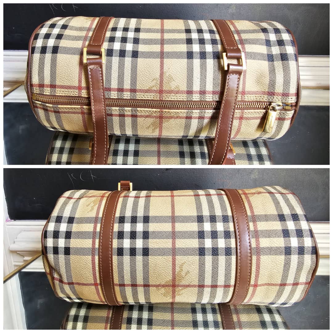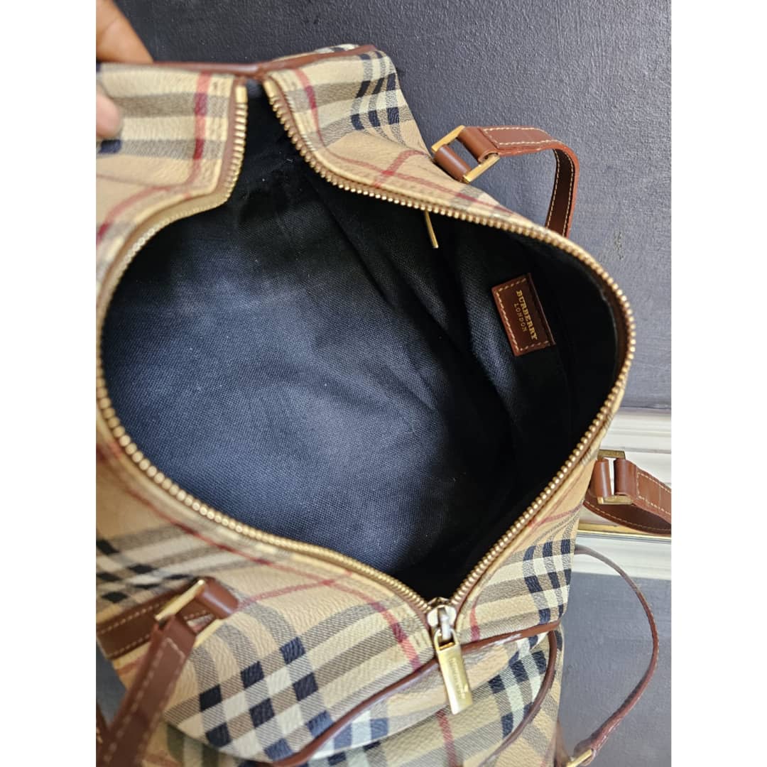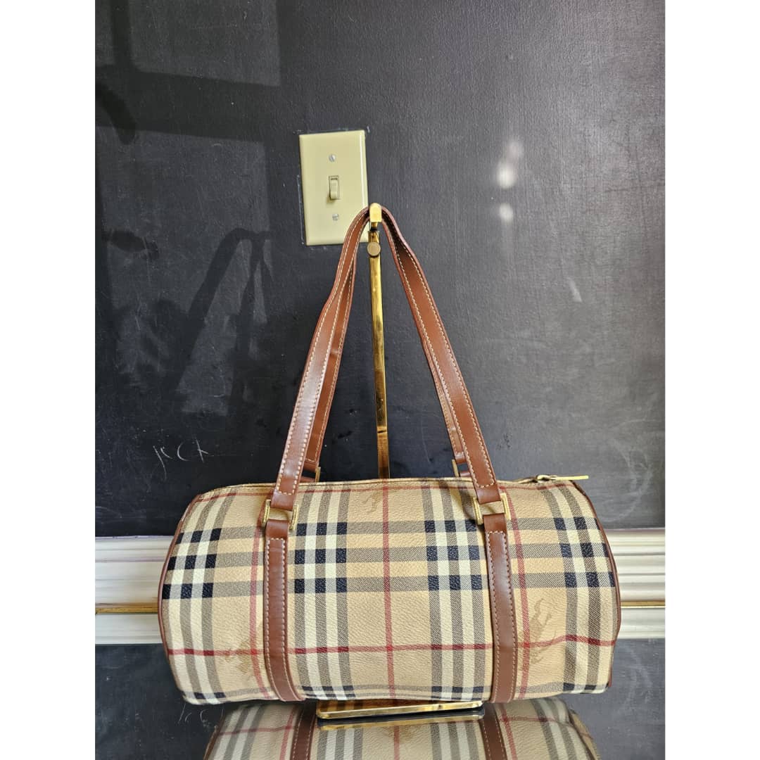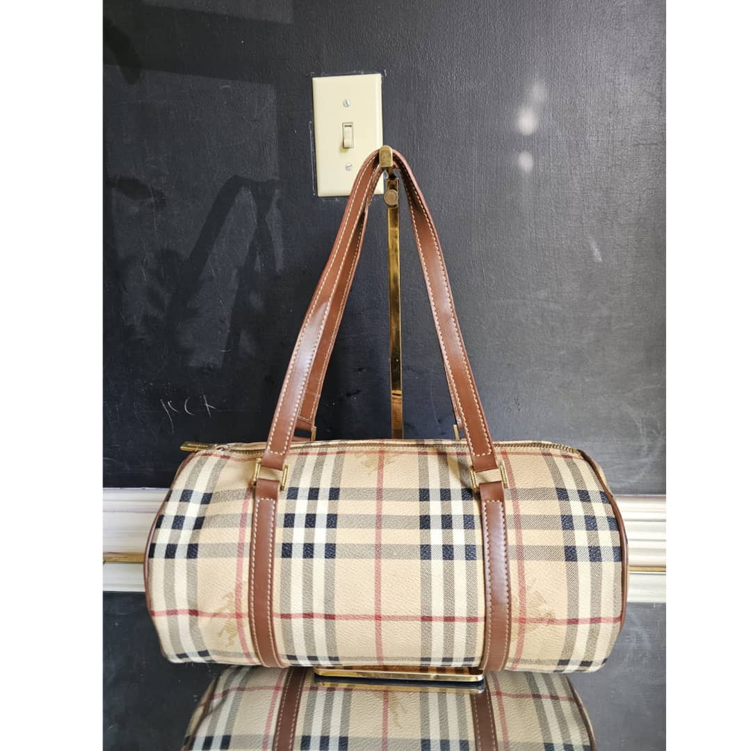 This authentic Burberry Barrel Leather Handbag is in itβs good pre-owned condition. The exterior canvas is clean and beautiful. Interior is clean. The brown leather trim that runs across the bag and handle is clean. Gold hardware.