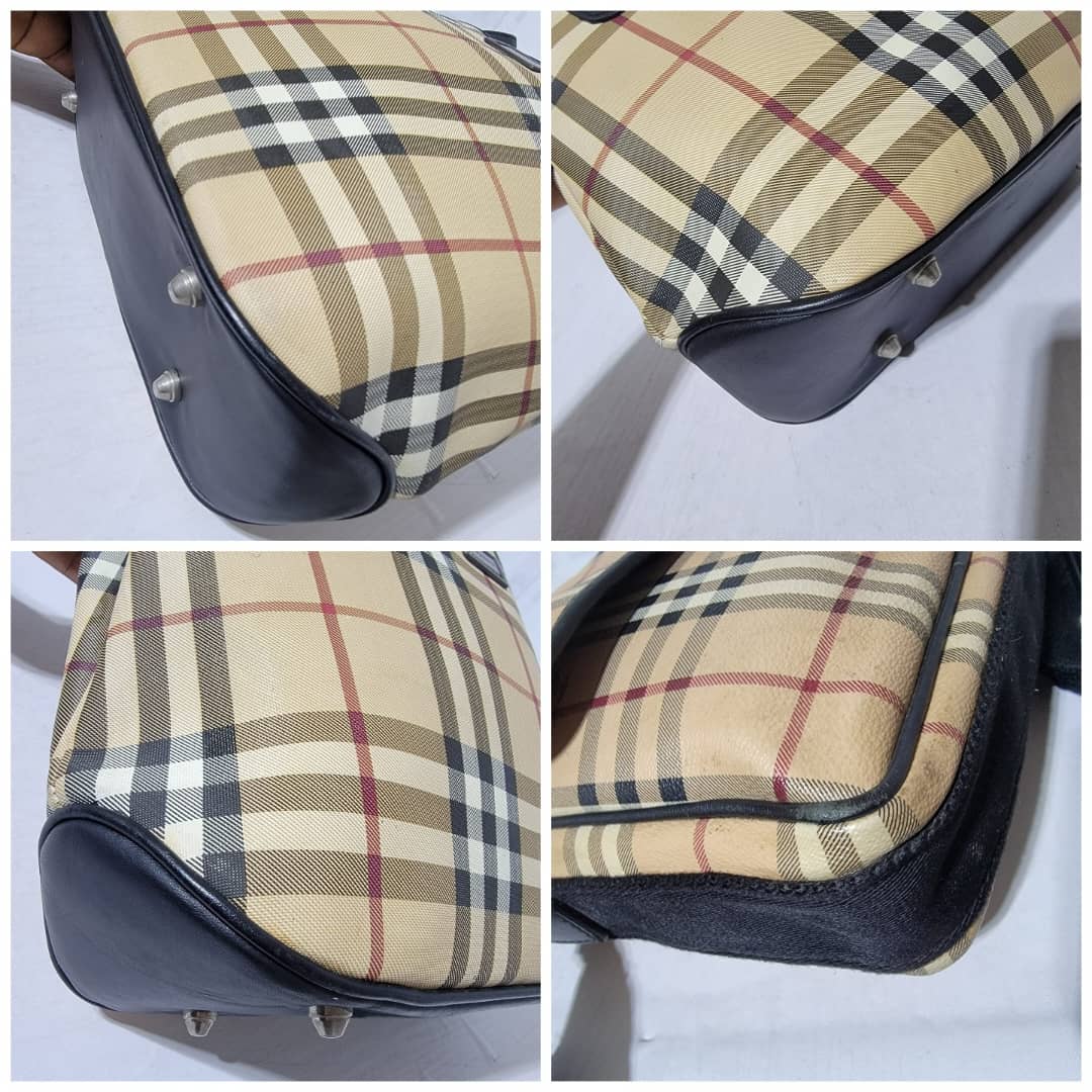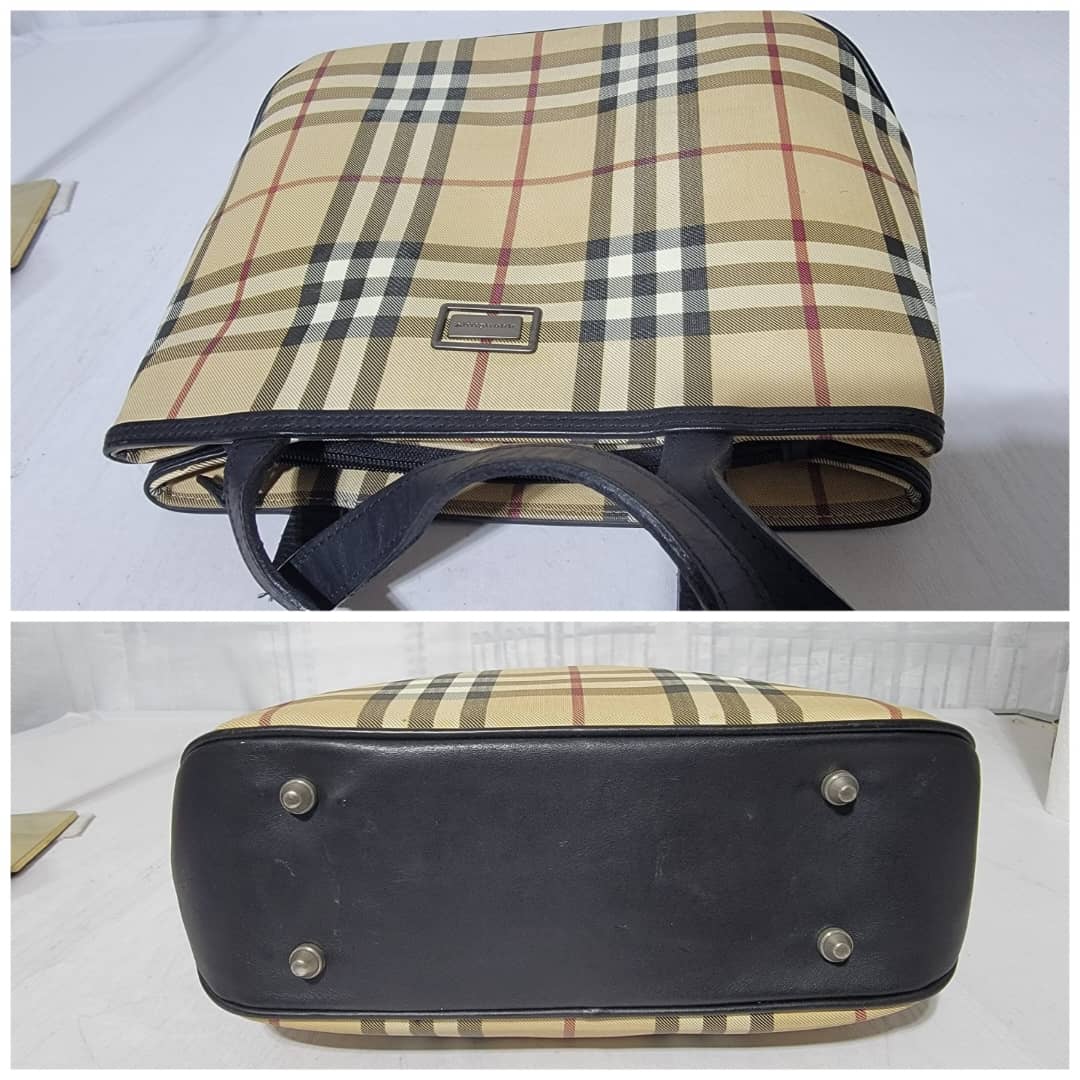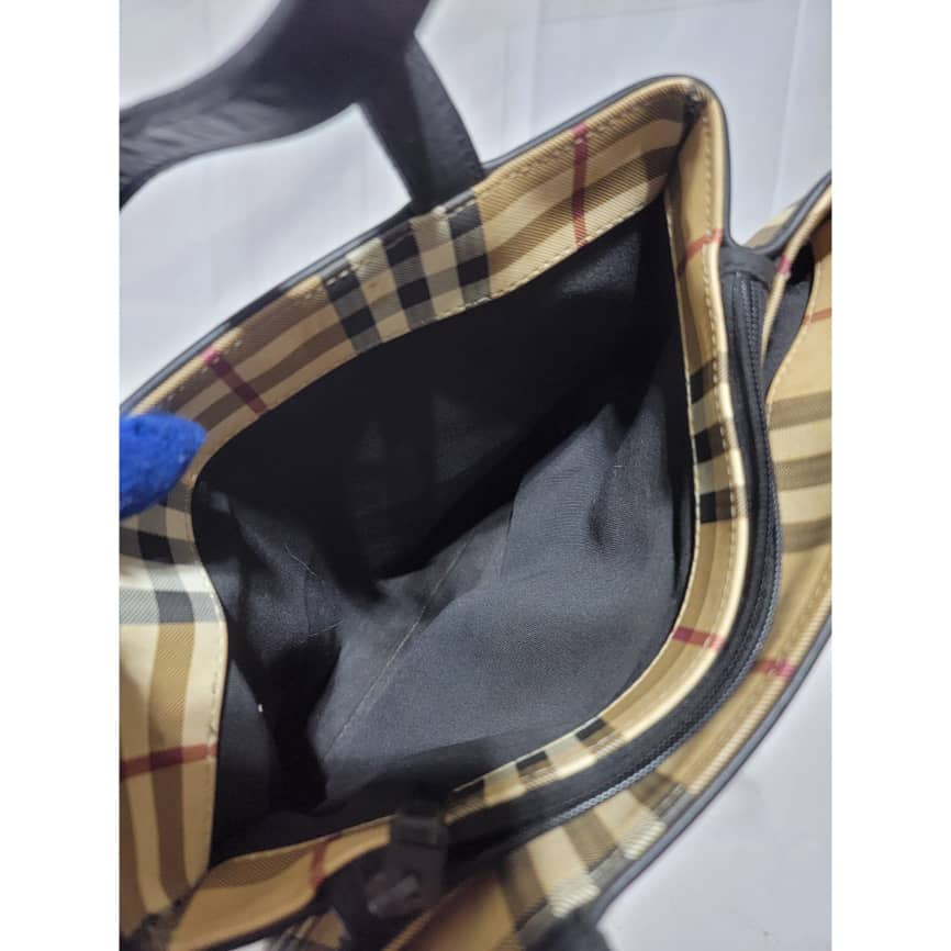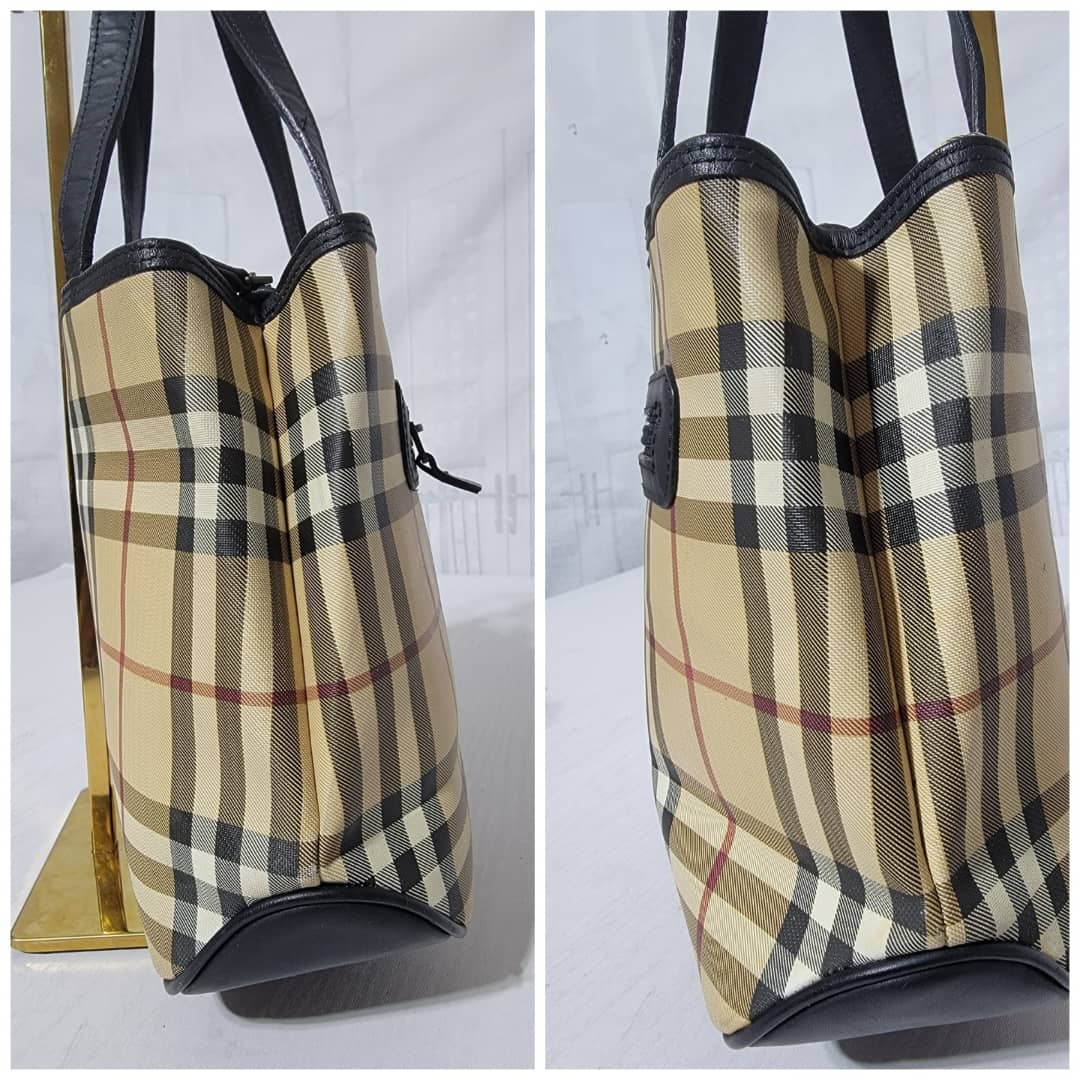 This authentic Burberry Beige/Black Nova Check PVC and Patent Leather Tote is in it’s pre-owned condition. The exterior is clean. Interior is clean. In it’s vintage condition. Date code is missing.