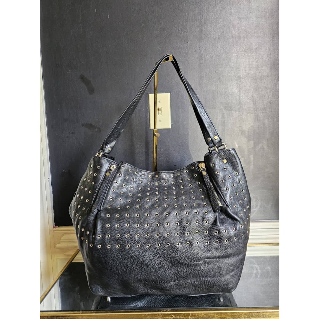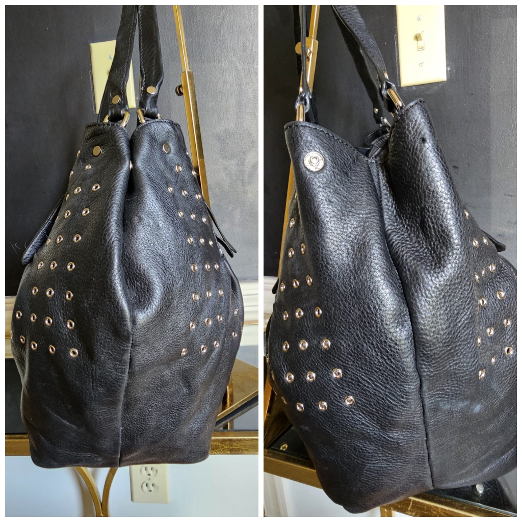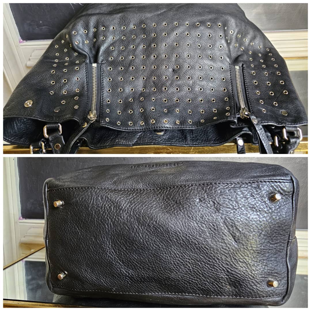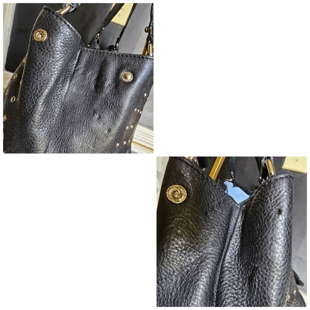 This authentic BURBERRY Calfskin Grommet Medium Maidstone Shoulder Bag Black is in it’s good pre-owned condition. The exterior leather is clean and beautiful. It has some studded perforated holes around the bag as the design, has the Burberry logo below the bag. One of the snap by the side of the bag is missing. Interior is clean.