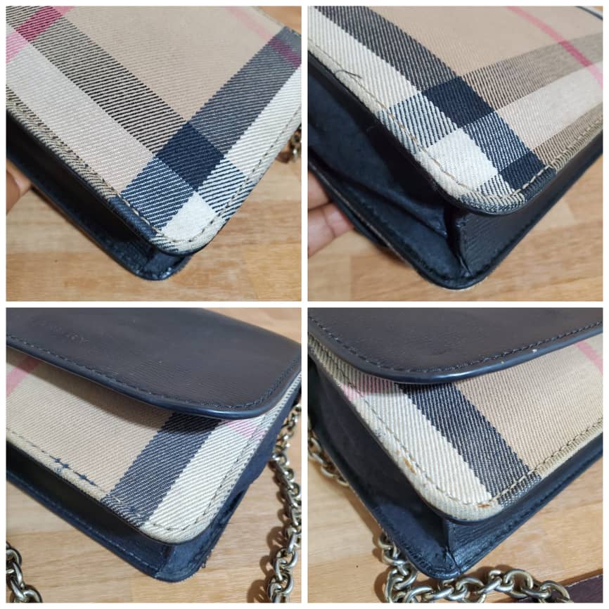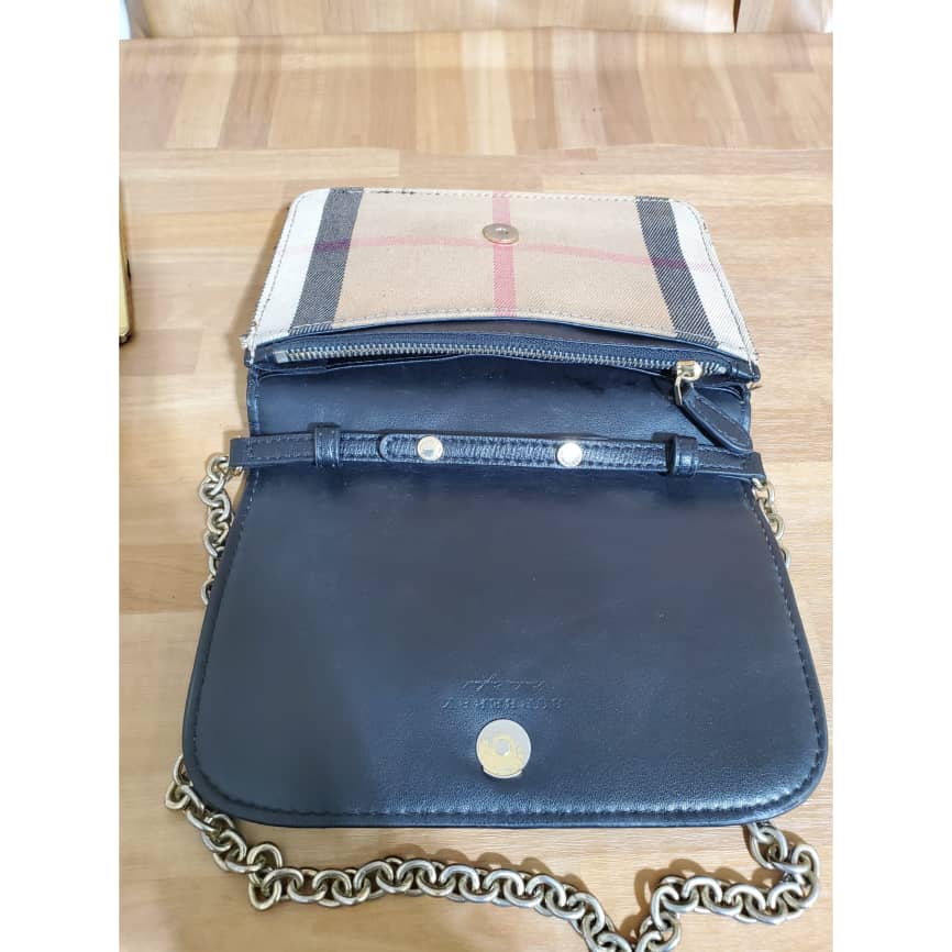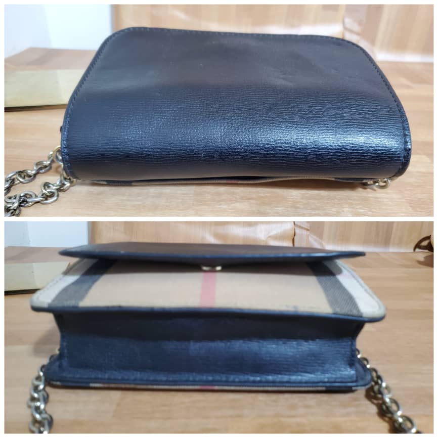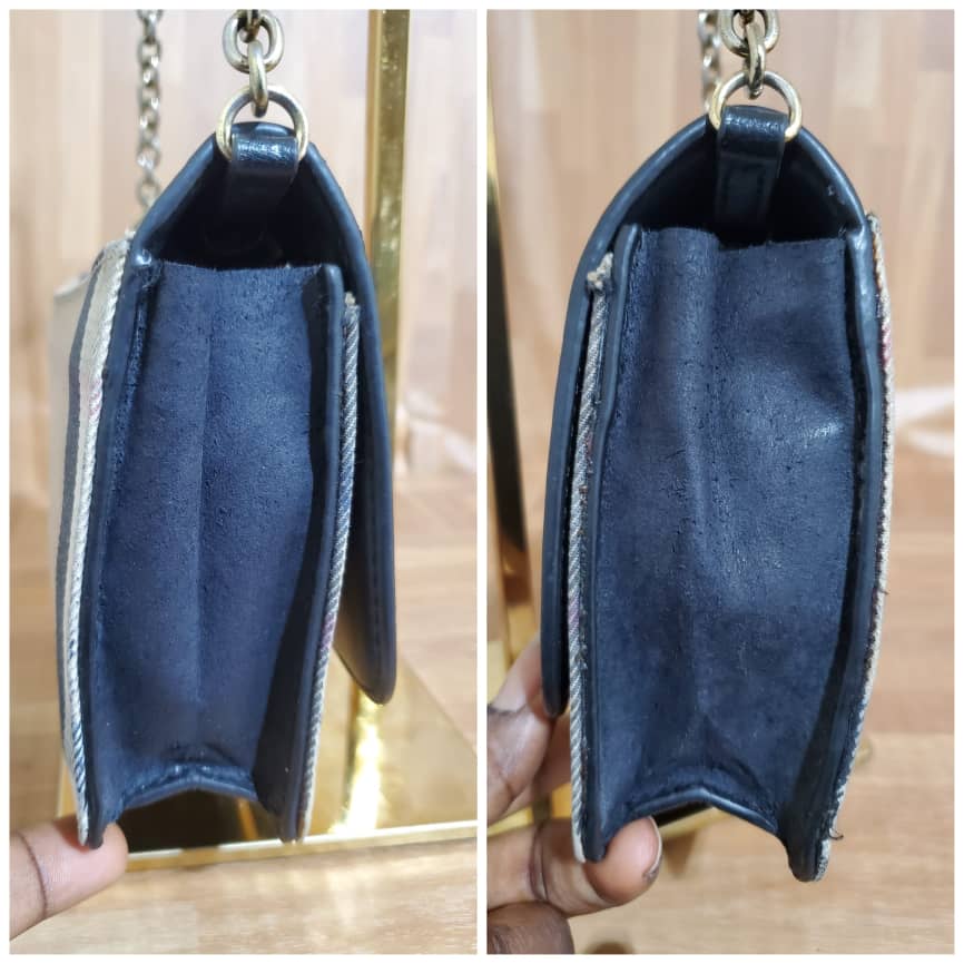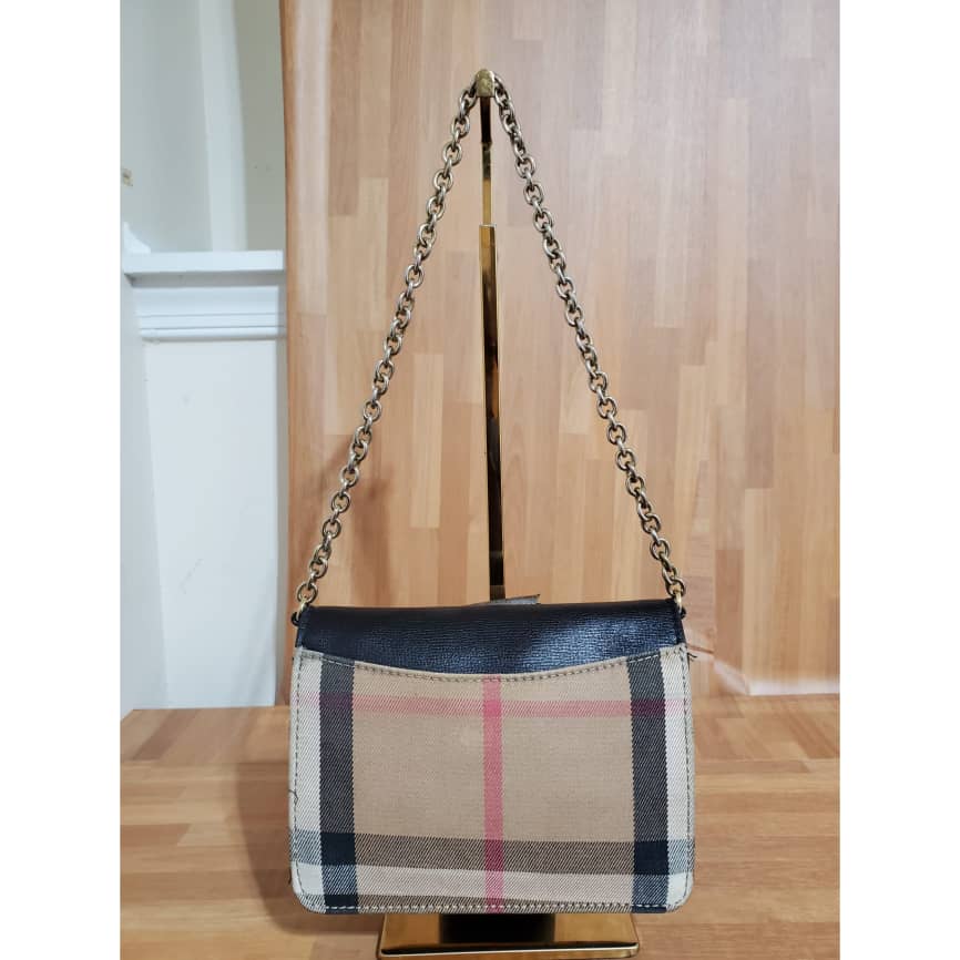 This authentic Burberry Hamsphire Check Small Shoulder Bag is in it’s pre-owned good condition shows sign of use. The exterior leather is clean. The Burberry logo design in front is faded out. The canvas Check is clean shows sign of use. Interior is clean. Long strap is missing.