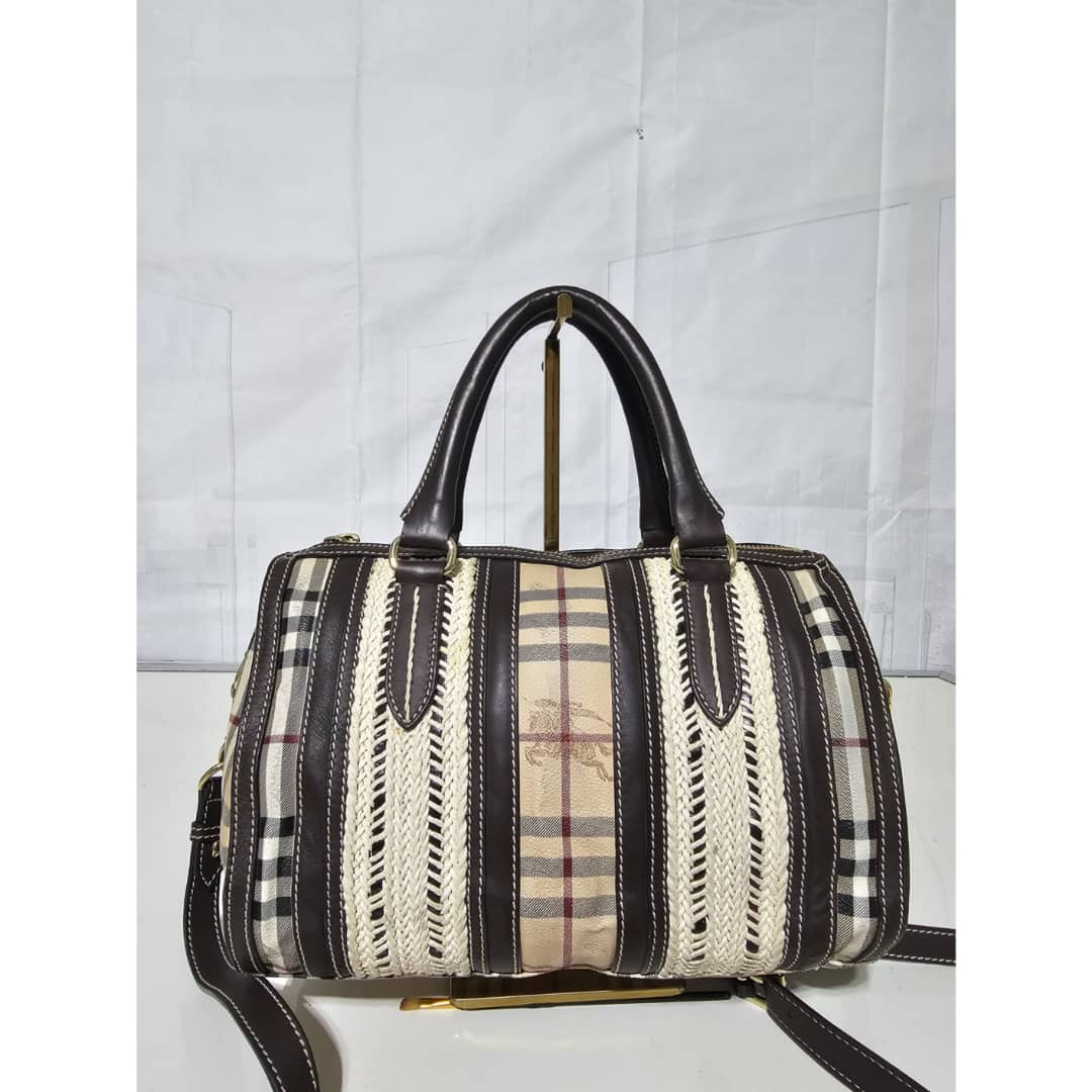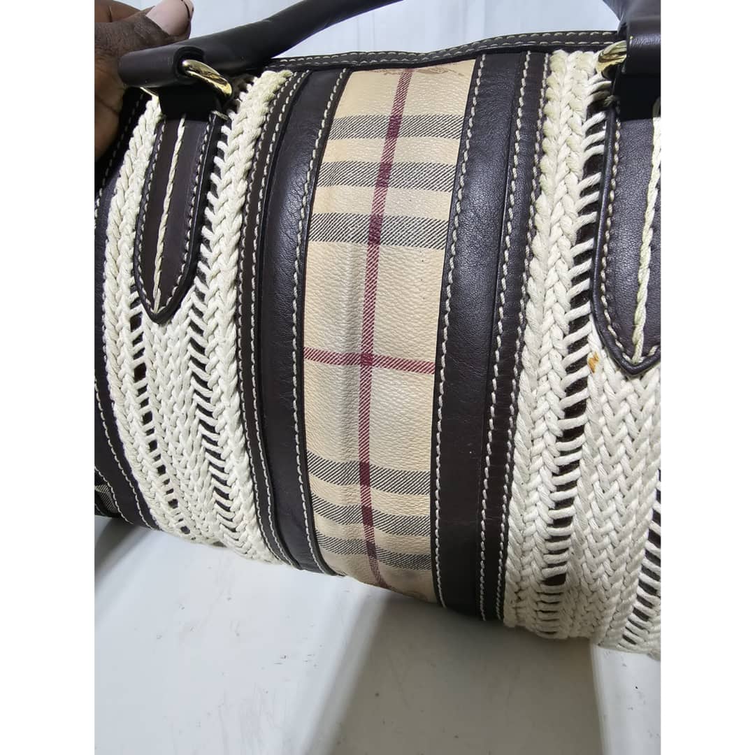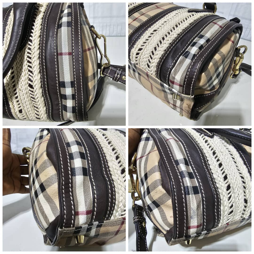 This authentic BURBERRY Haymarket Crochet Tote Deep Brown is in it’s good pre-owned condition. The exterior canvas and leather is clean and beautiful. Slightly wear on the checked. Interior is clean.It is a limited edition. Can be worn as a handbag, crossbody or shoulder bag. Gold hardware.