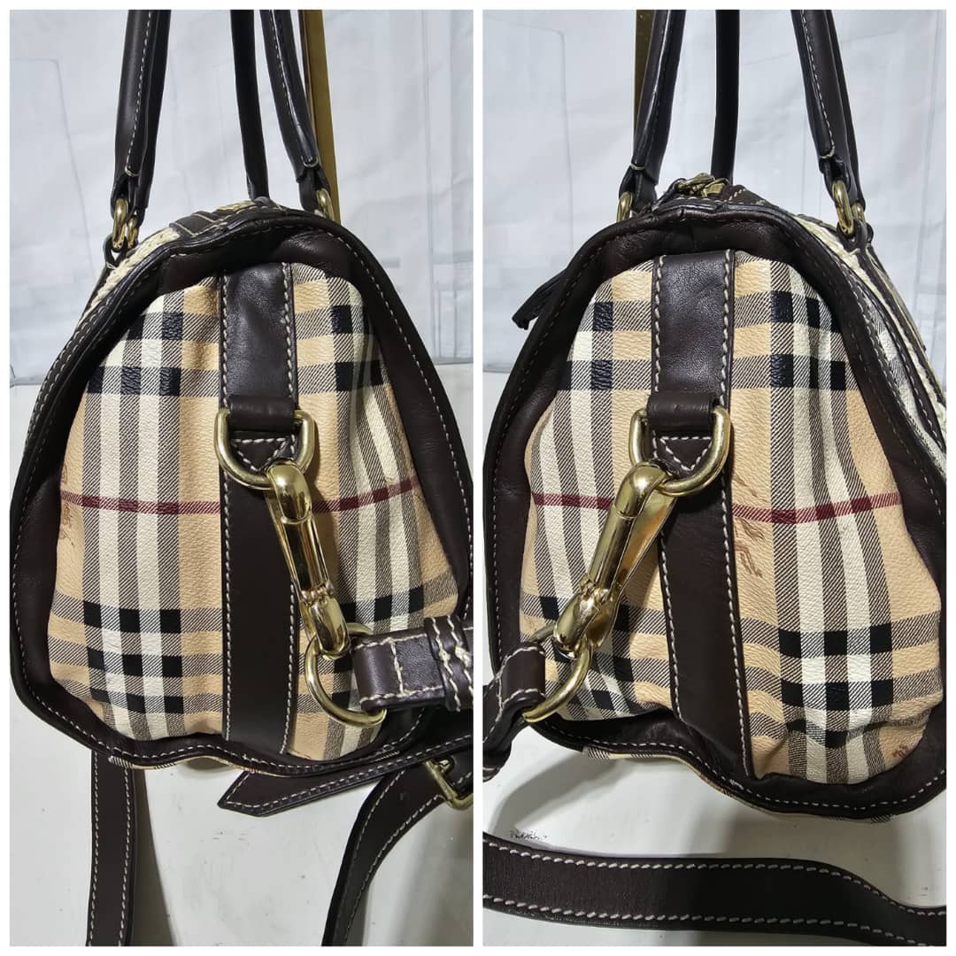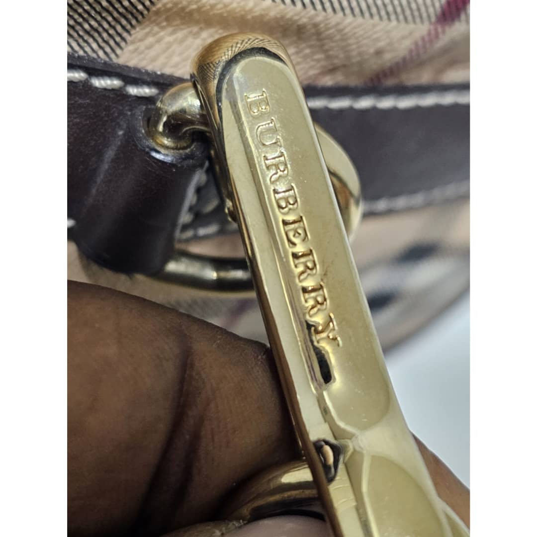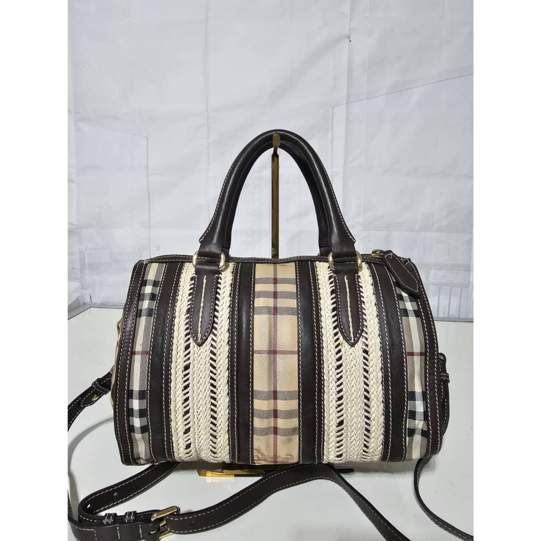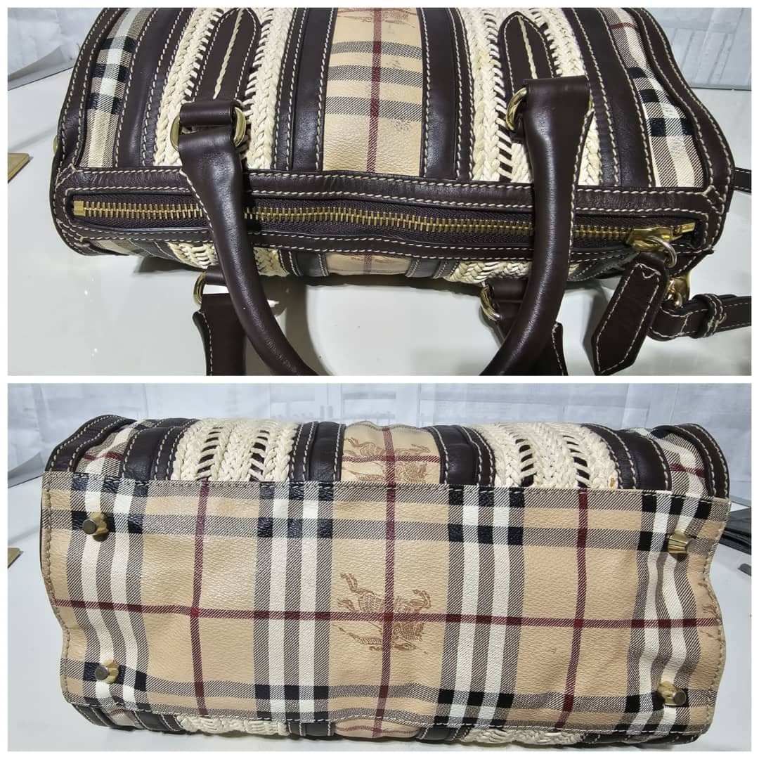 This authentic BURBERRY Haymarket Crochet Tote Deep Brown is in it’s good pre-owned condition. The exterior canvas and leather is clean and beautiful. Slightly wear on the checked. Interior is clean.It is a limited edition. Can be worn as a handbag, crossbody or shoulder bag. Gold hardware.