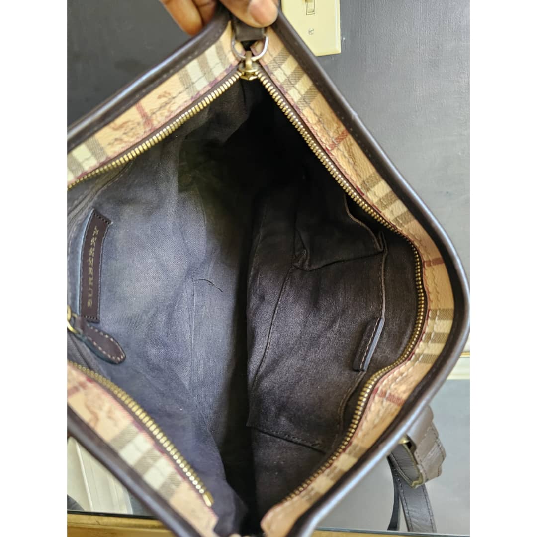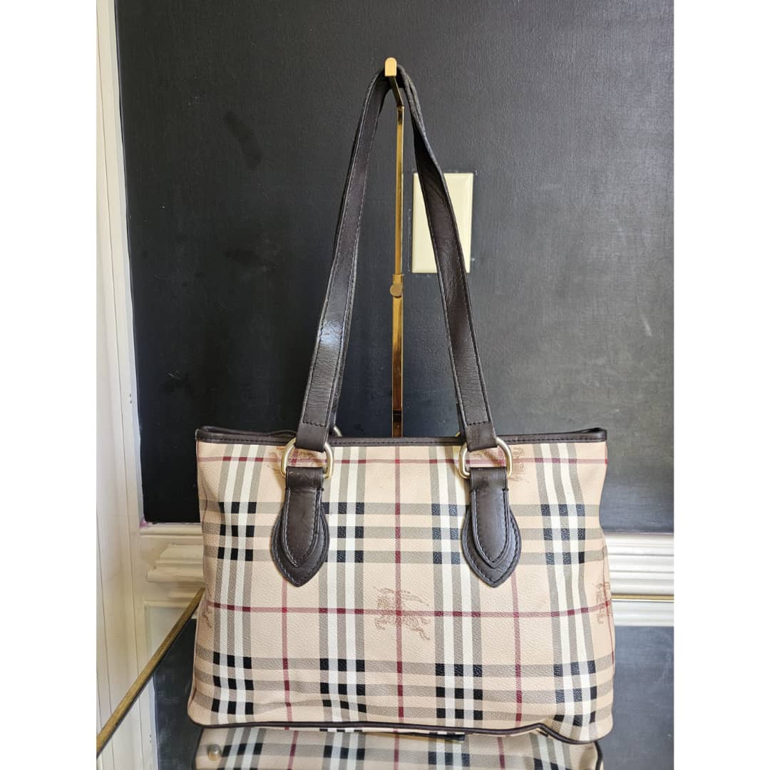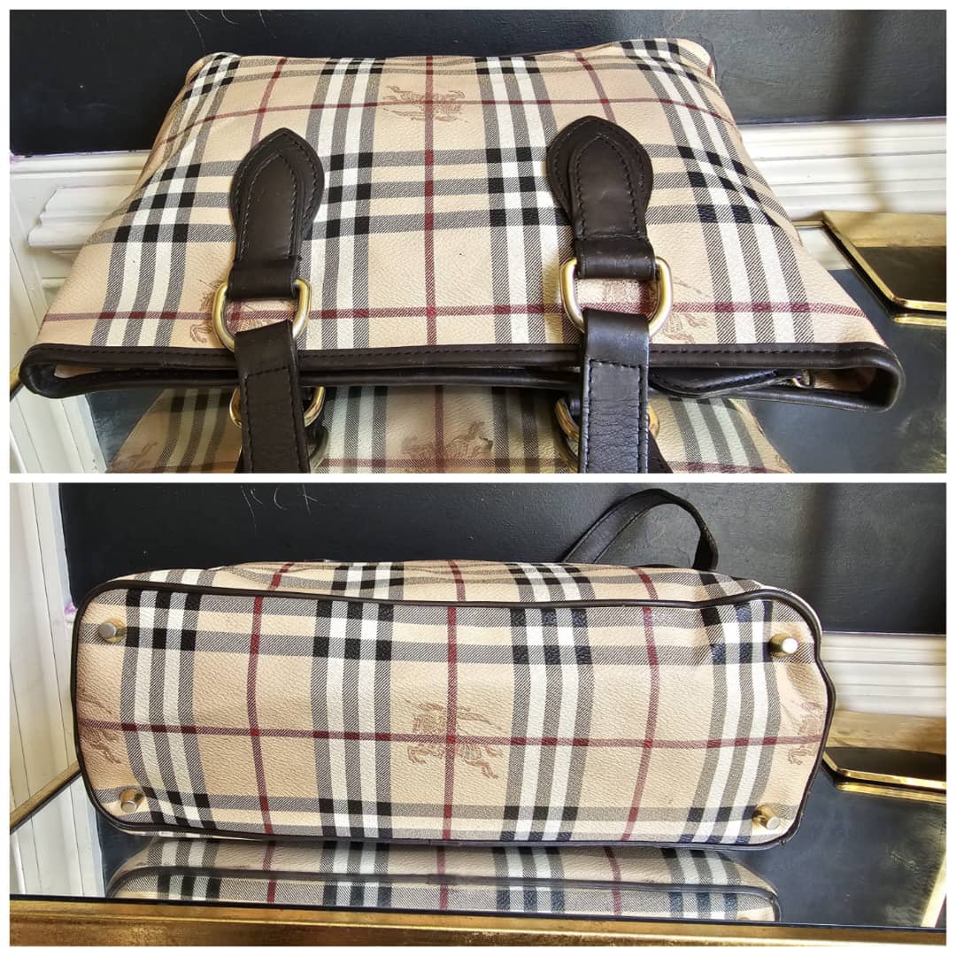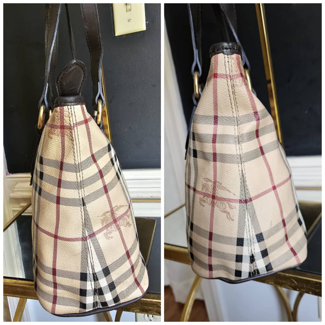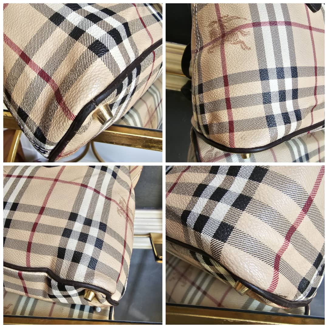 This authentic BURBERRY HAYMARKET CHECK MEDIUM REGENT TOTE BAG BEIGE/BROWN is in it’s good pre-owned condition. The exterior canvas is clean and beautiful. The back exterior shows a tiny little cut that is not obvious (Kindly review pictures above). Interior is clean. Gold hardware.
