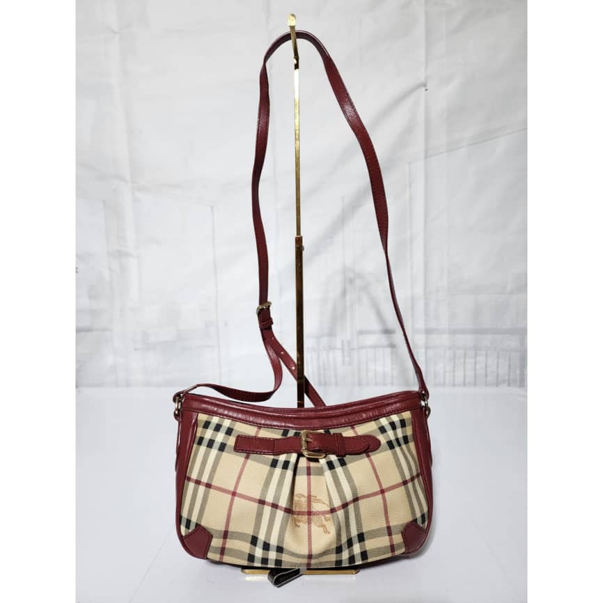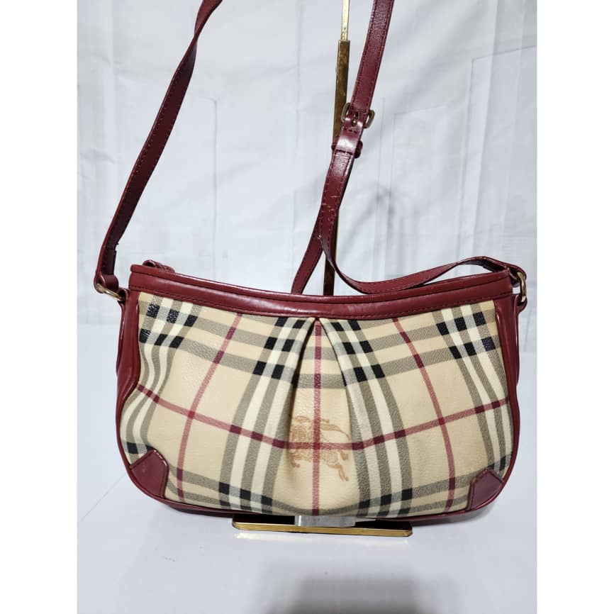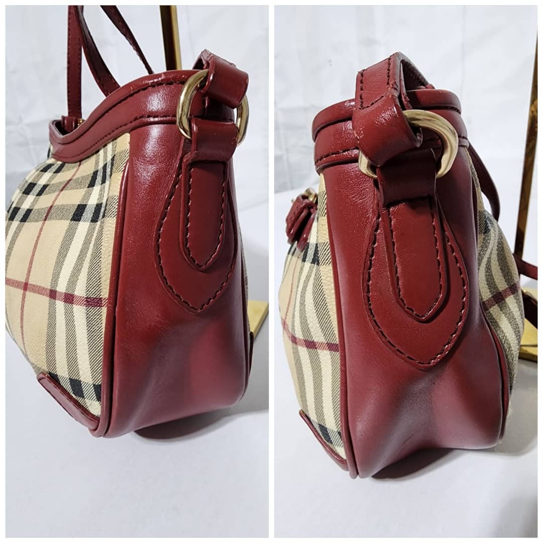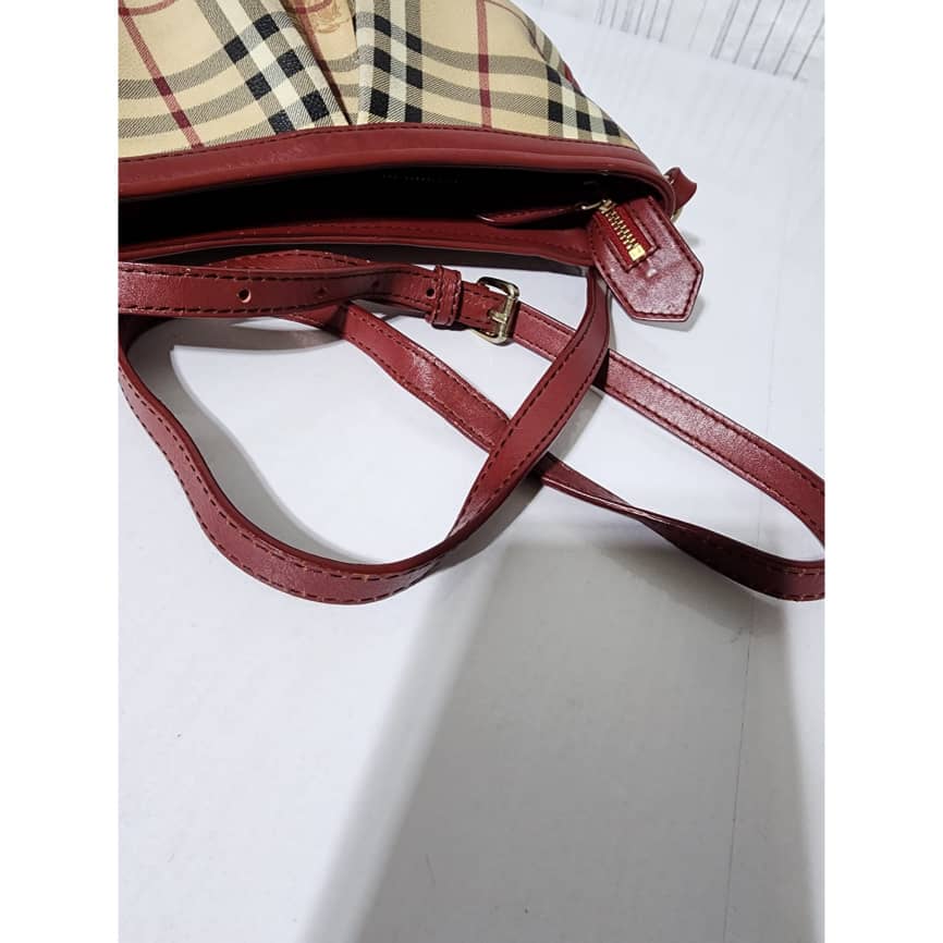 This authentic Burberry Haymarket Check Smithfield Crossbody Beige/Burgundy is in it’s good pre-owned condition. The exterior is clean and beautiful. Interior is clean. The long strap is adjustable.