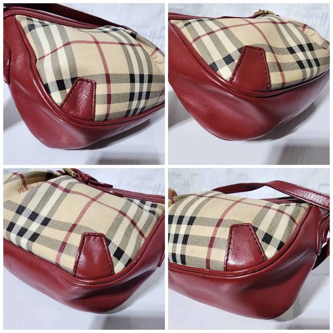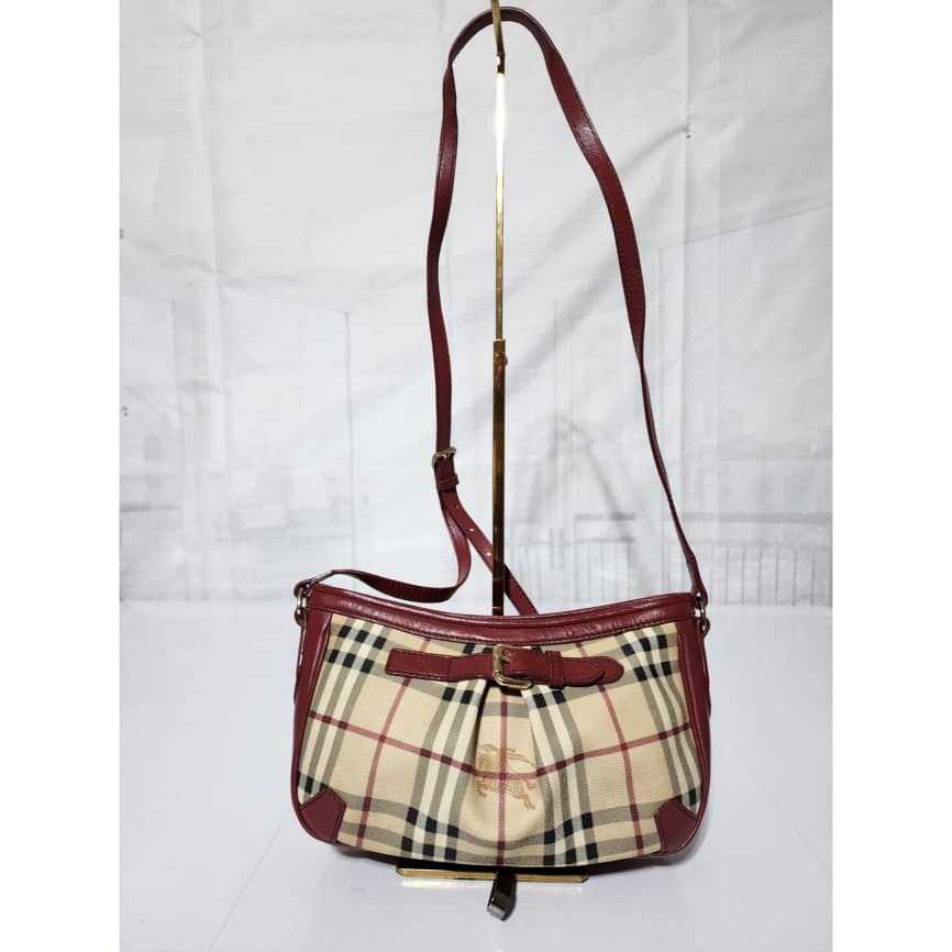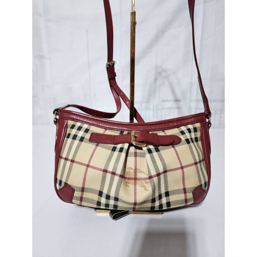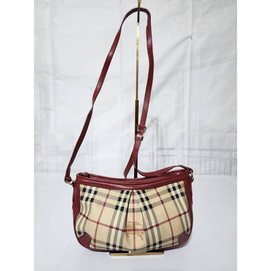 This authentic Burberry Haymarket Check Smithfield Crossbody Beige/Burgundy is in it’s good pre-owned condition. The exterior is clean and beautiful. Interior is clean. The long strap is adjustable.