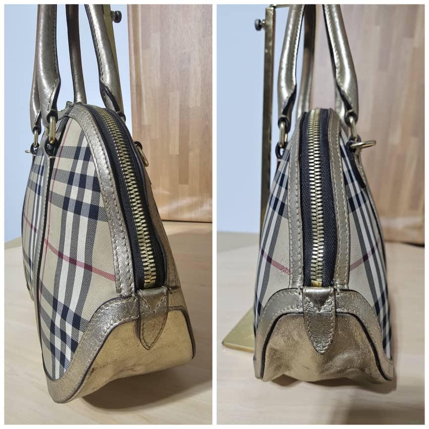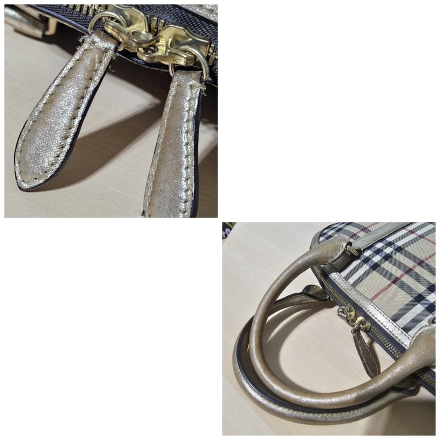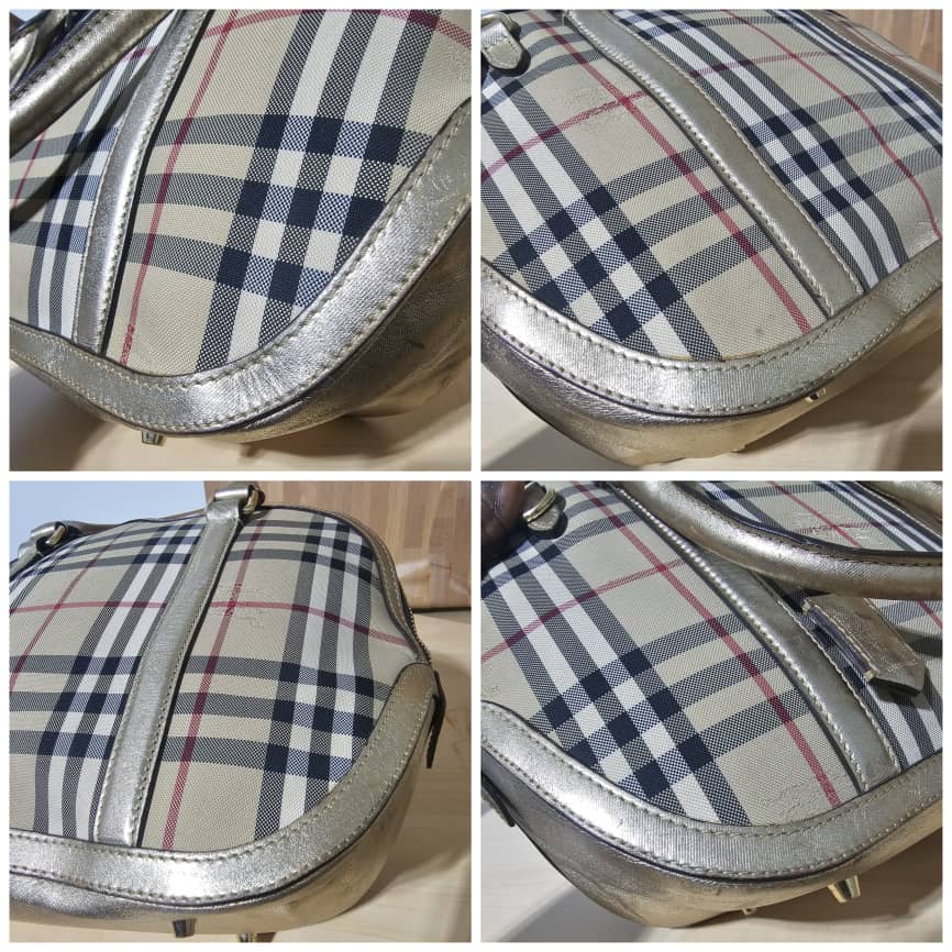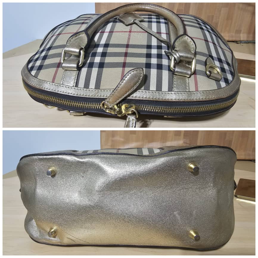 This authentic Burberry Haymarket Checks Orchard Bowling Bag Gold is in its good pre-owned condition. The exterior is clean. The gold shimmers on the handle and zipper pull is faded (Kindly refer to pictures above). The interior is clean. Can be worn as a shoulder bag. I will include a black Burberry strap