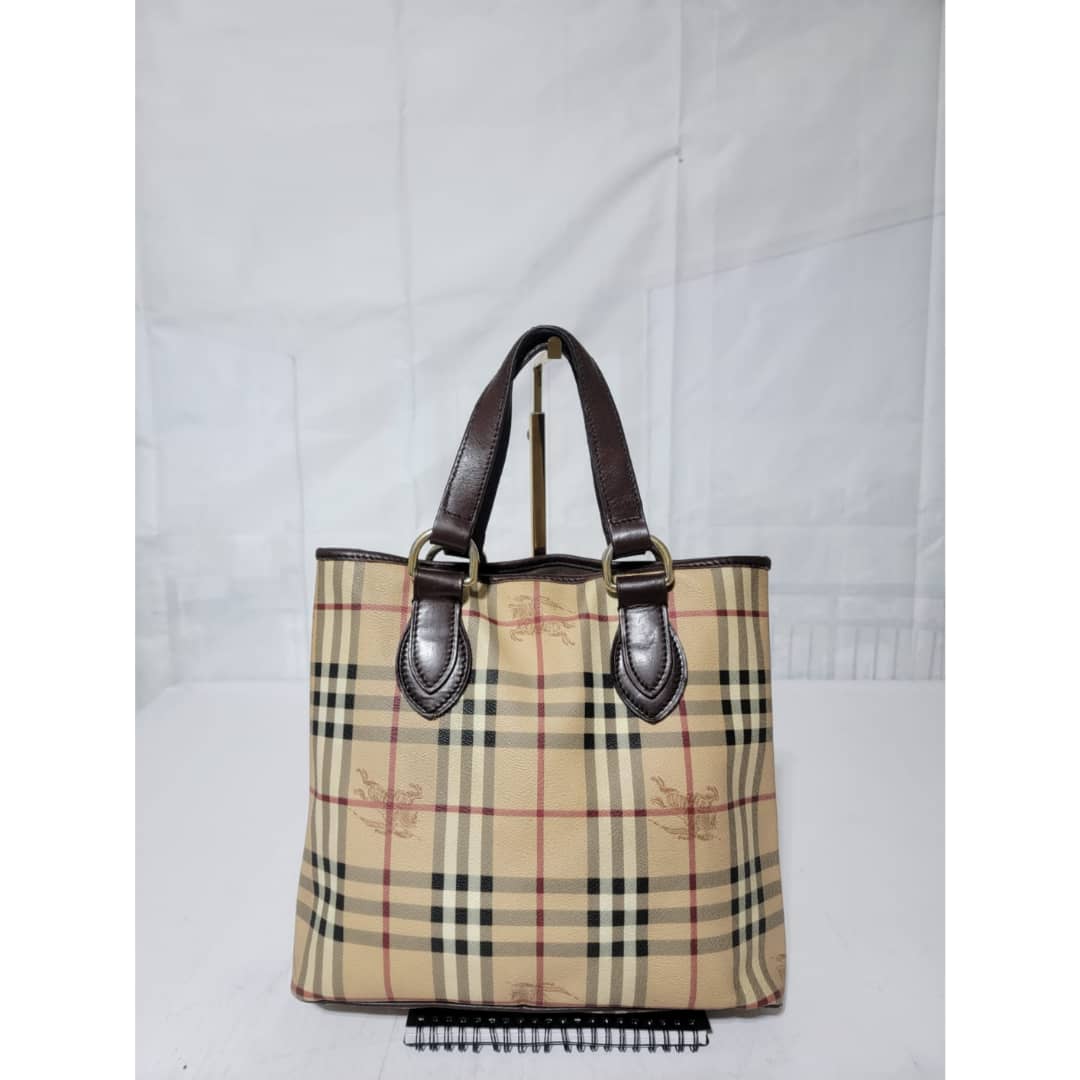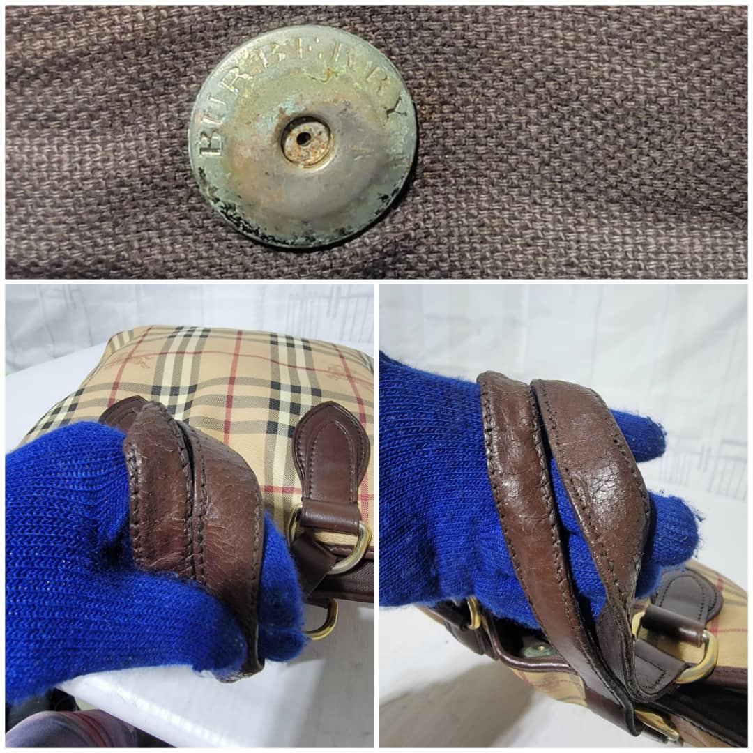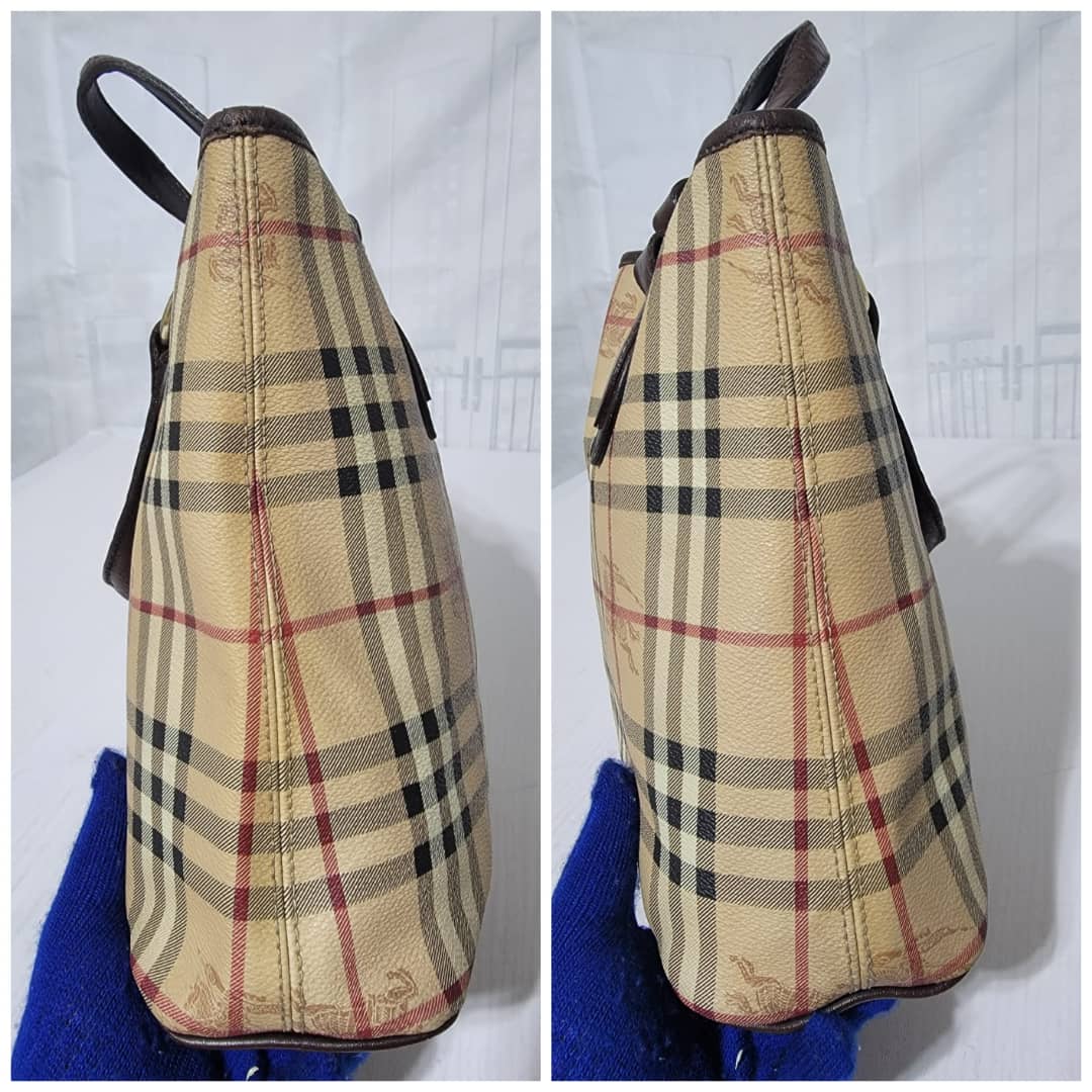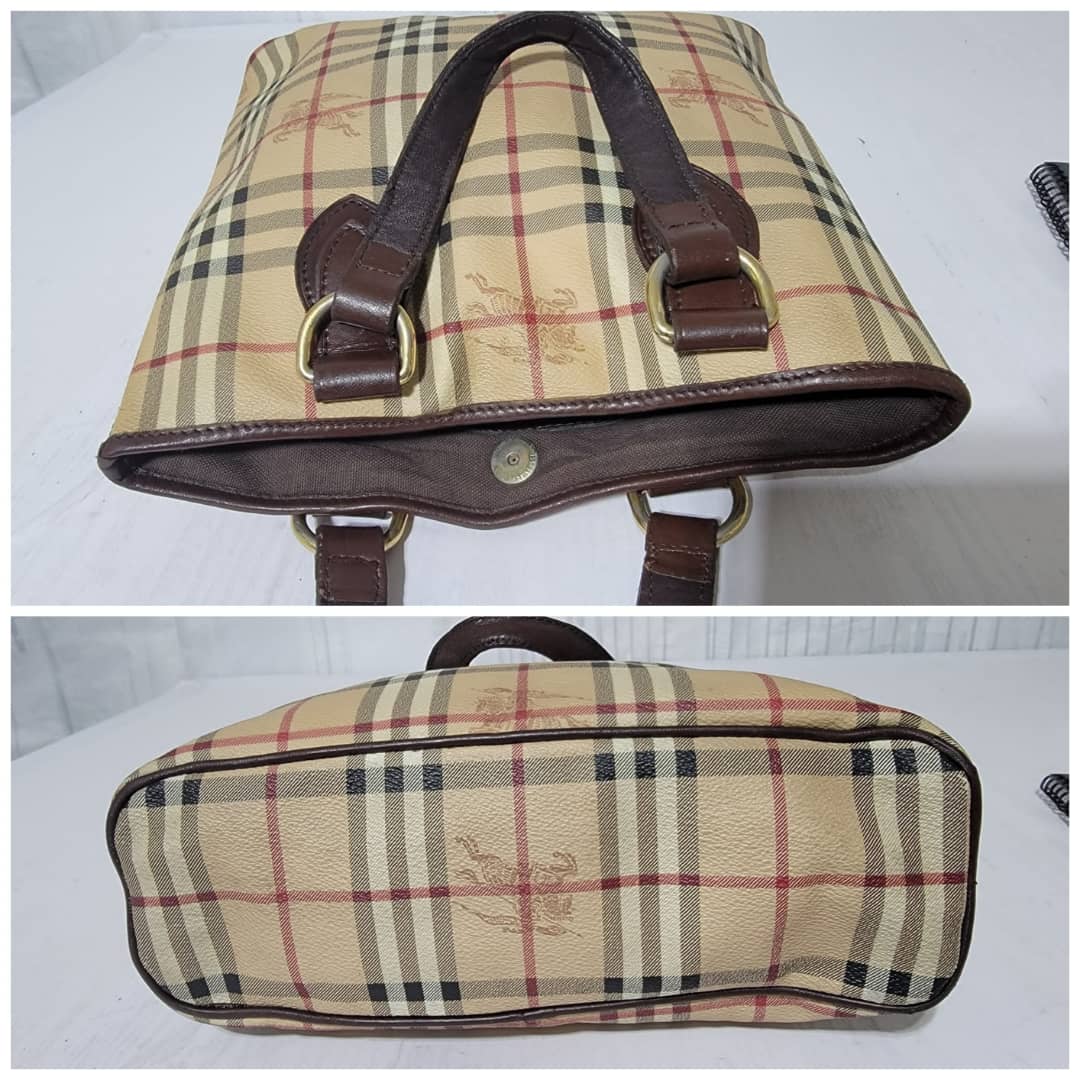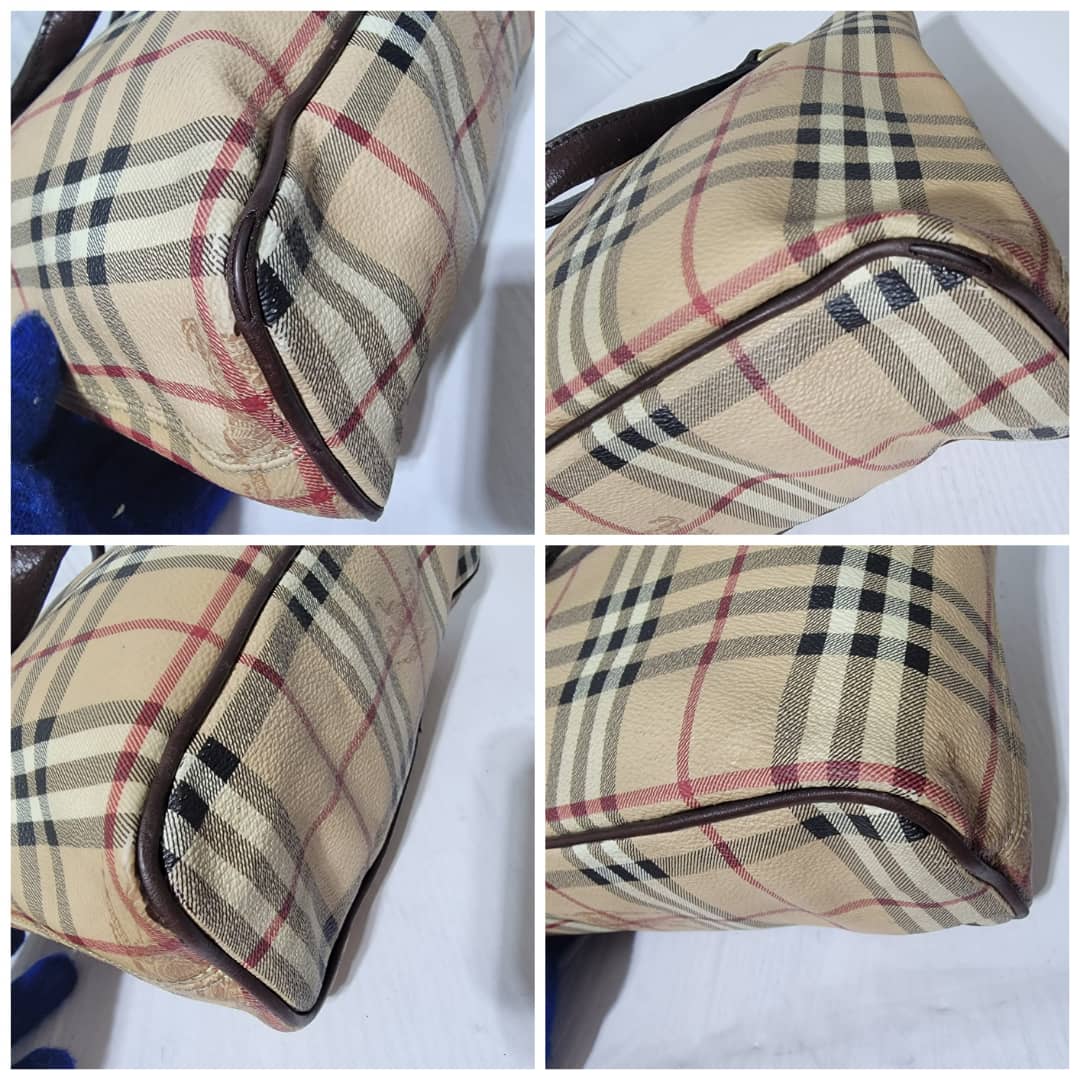 This authentic Burberry Haymarket Coated Canvas and Leather Regent Tote Bag Beige/Brown is in it’s good pre-owned condition. The exterior coated canvas is clean and beautiful, it has little sign of wear. Interior is clean, interior lining shows sign of wear. The snap button is missing (Kindly look at pictures above). The edges shows some sign of scuffing and scratches. The brown leather handle shows some sign of cracking.