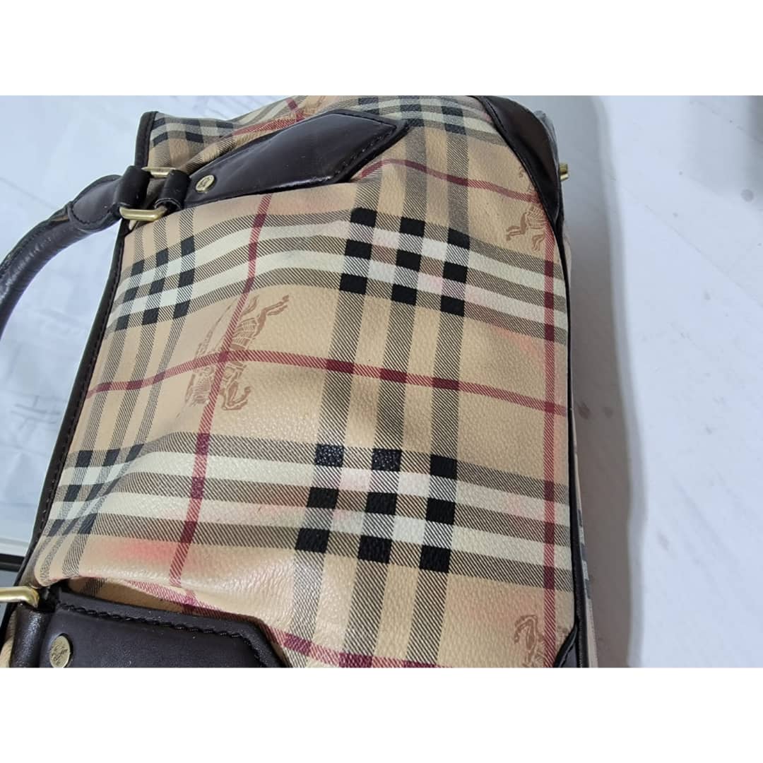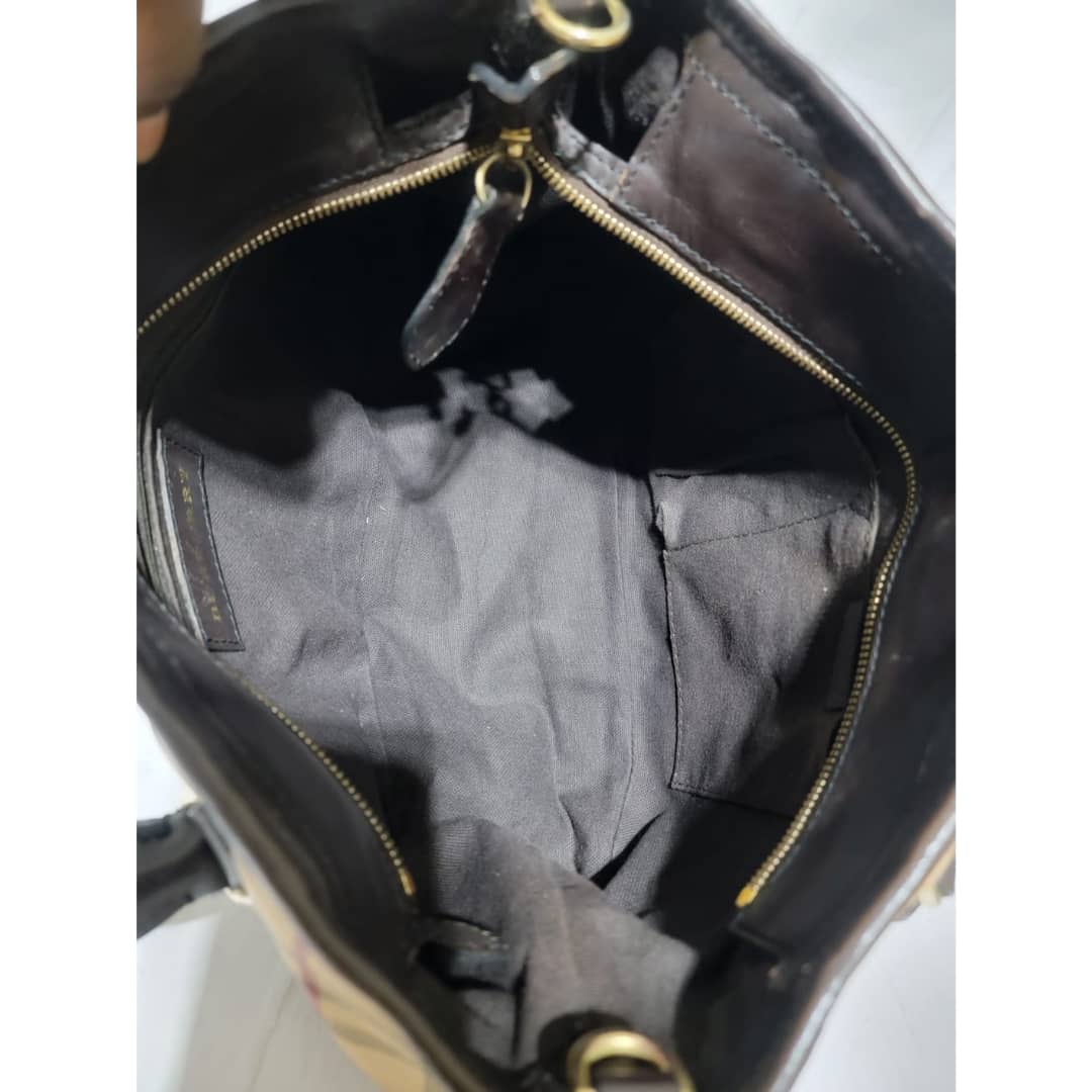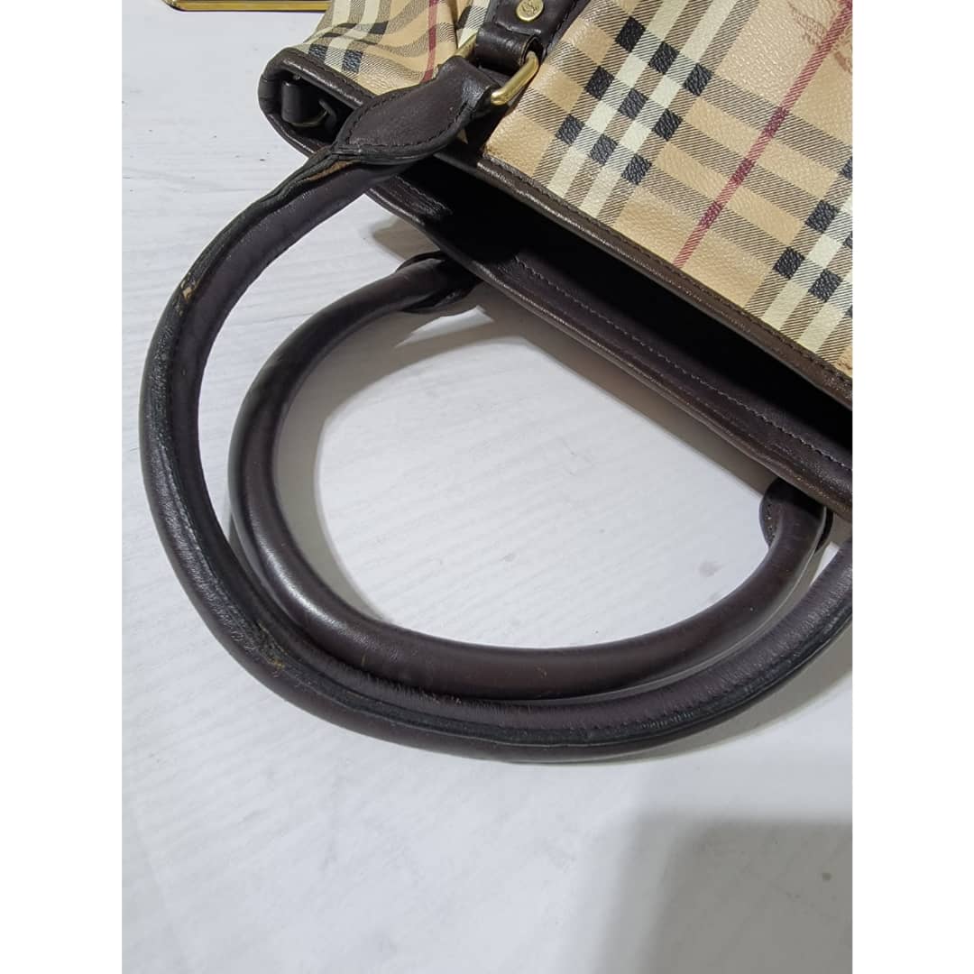 This authentic Burberry Haymarket Medium Landscape Heathcliff Tote Bag Brown/Beige is in it’s good pre-owned condition. The exterior is clean but shows sign of pink color transfer. The brown leather trim shows little bit of scratches (Kindly look at pictures above). Interior is clean. No long strap.
