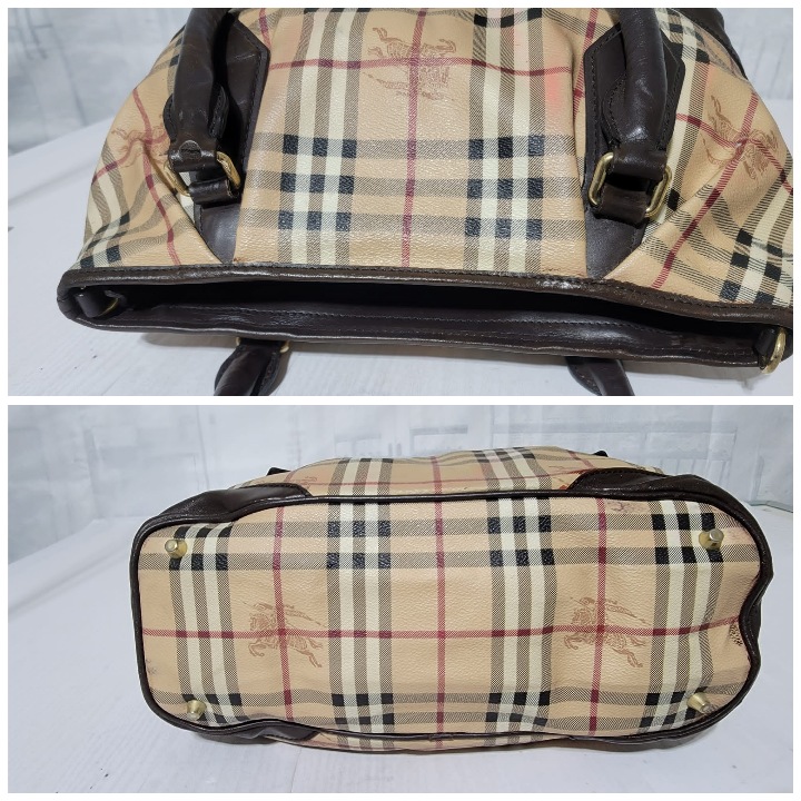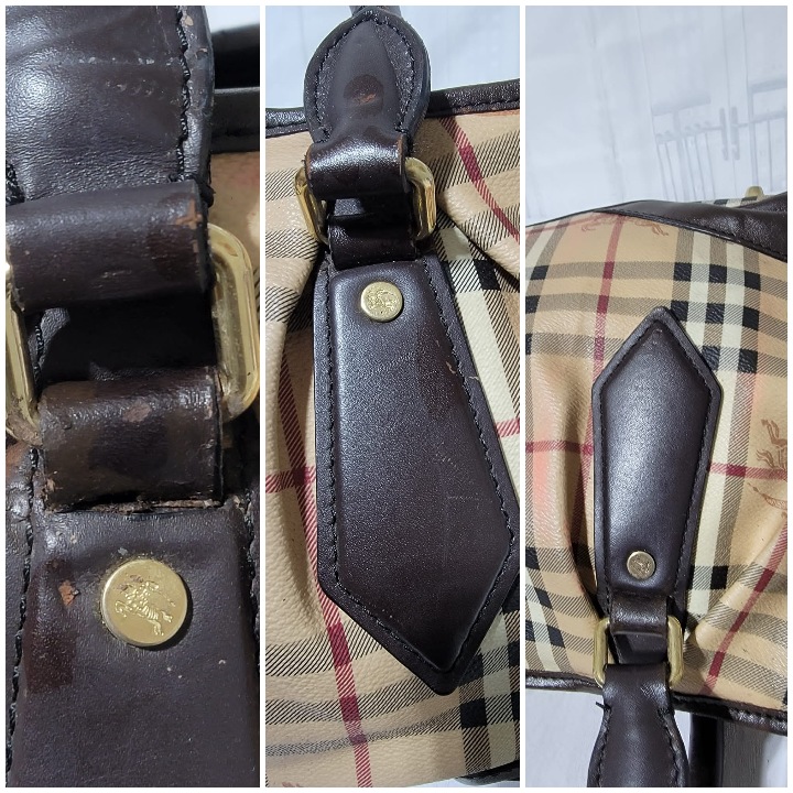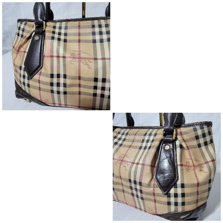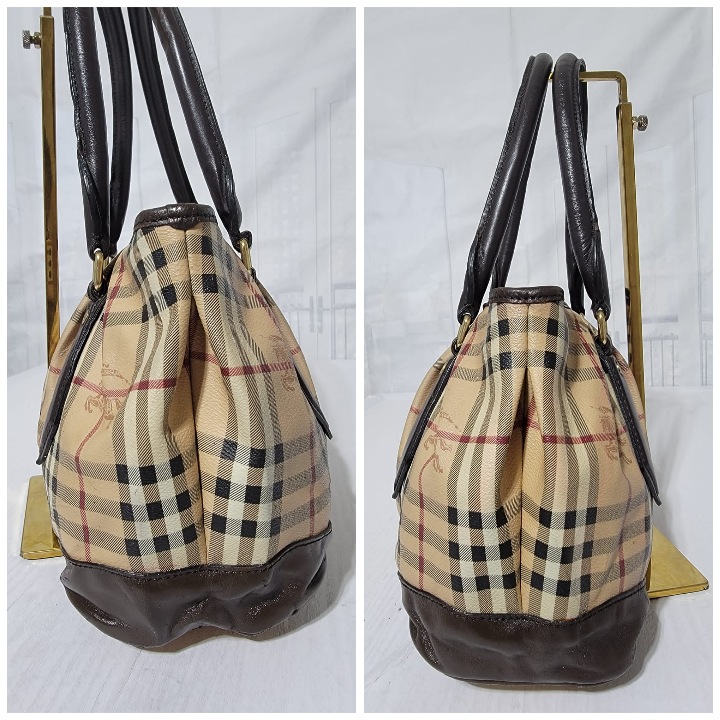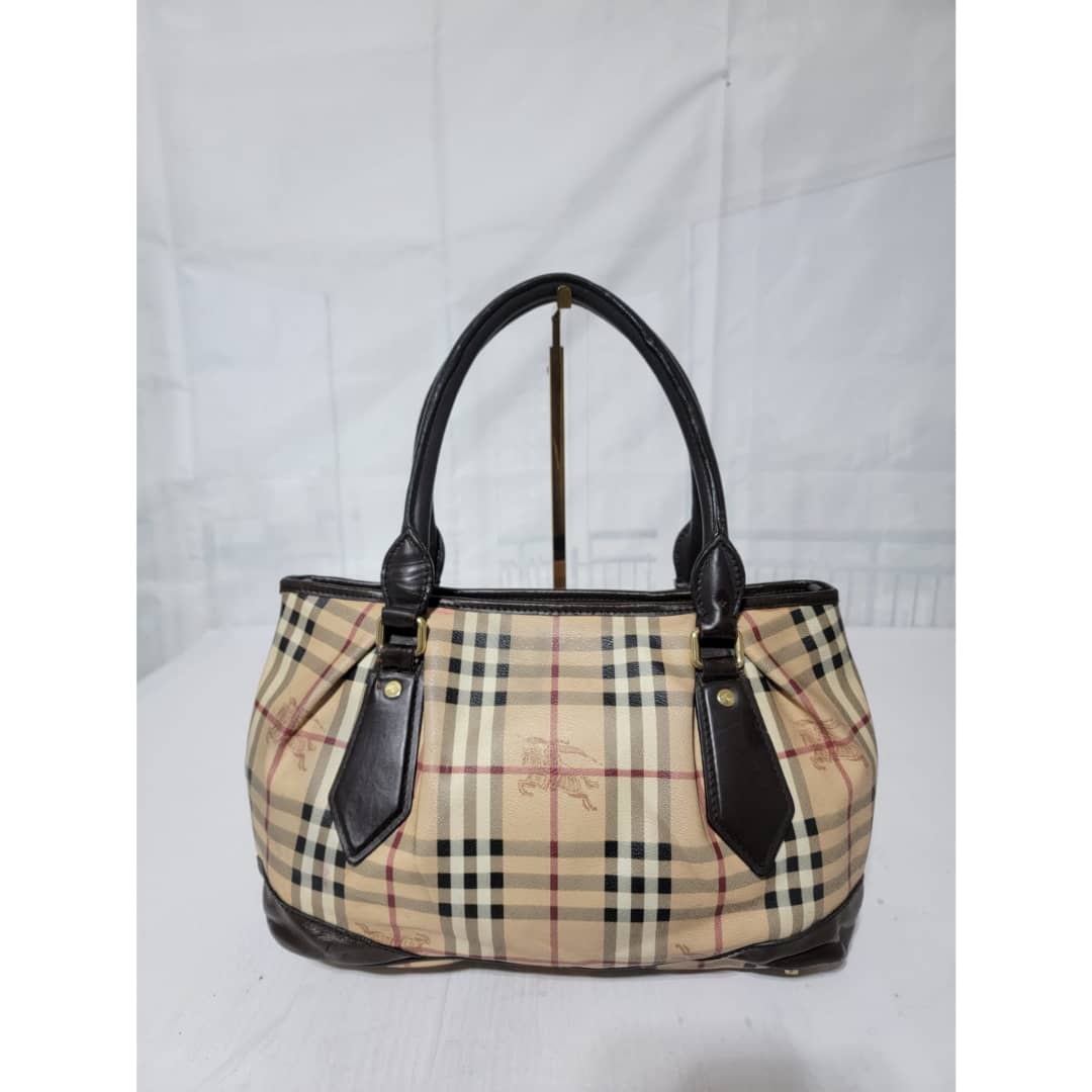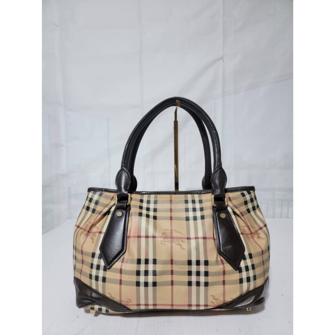 This authentic Burberry Haymarket Medium Landscape Heathcliff Tote Bag Brown/Beige is in it’s good pre-owned condition. The exterior is clean but shows sign of pink color transfer. The brown leather trim shows little bit of scratches (Kindly look at pictures above). Interior is clean. No long strap.