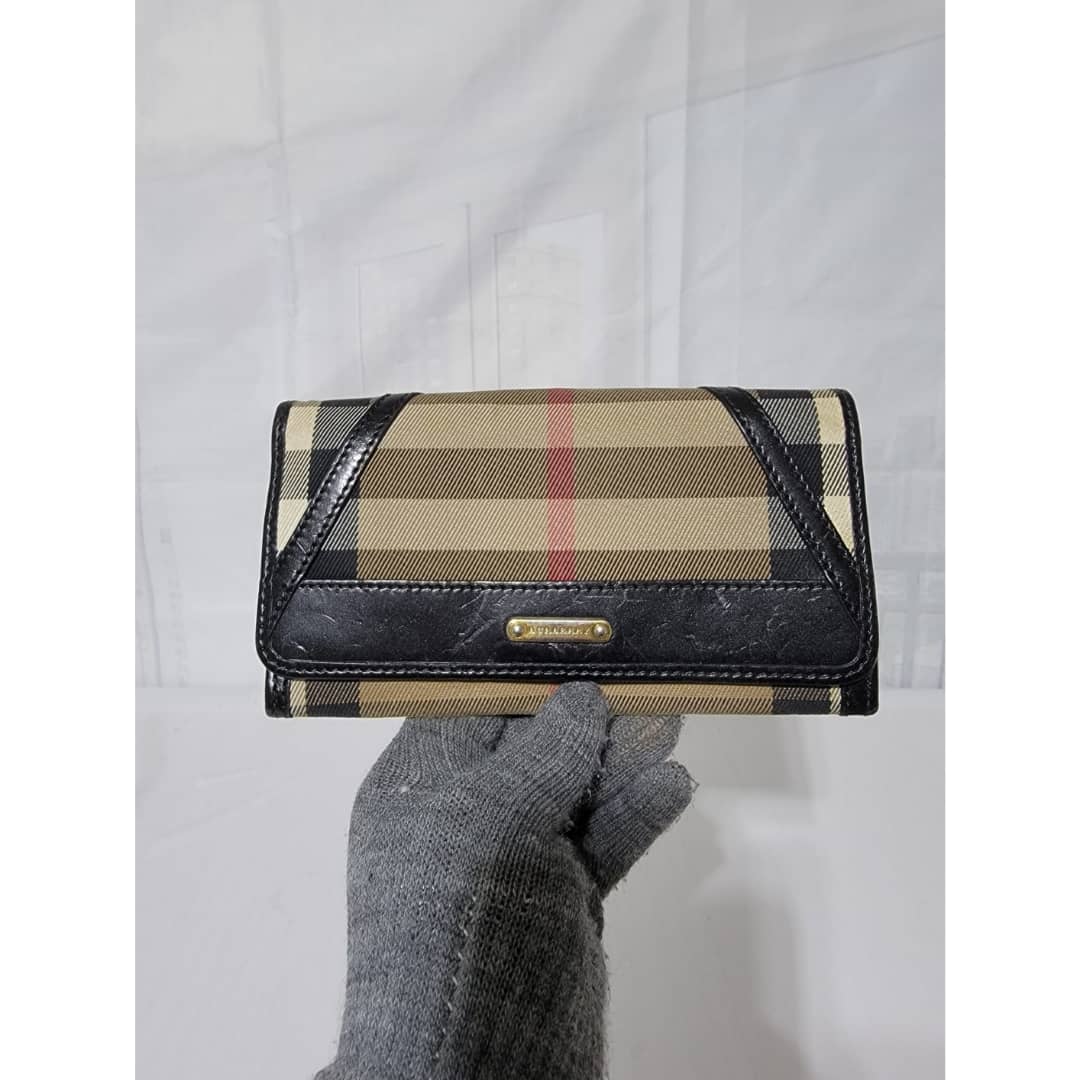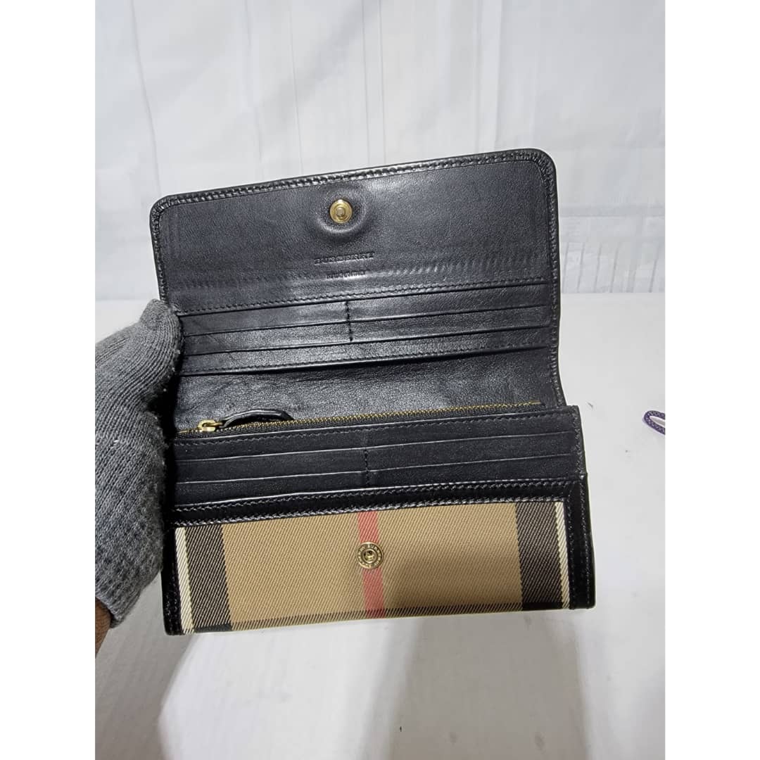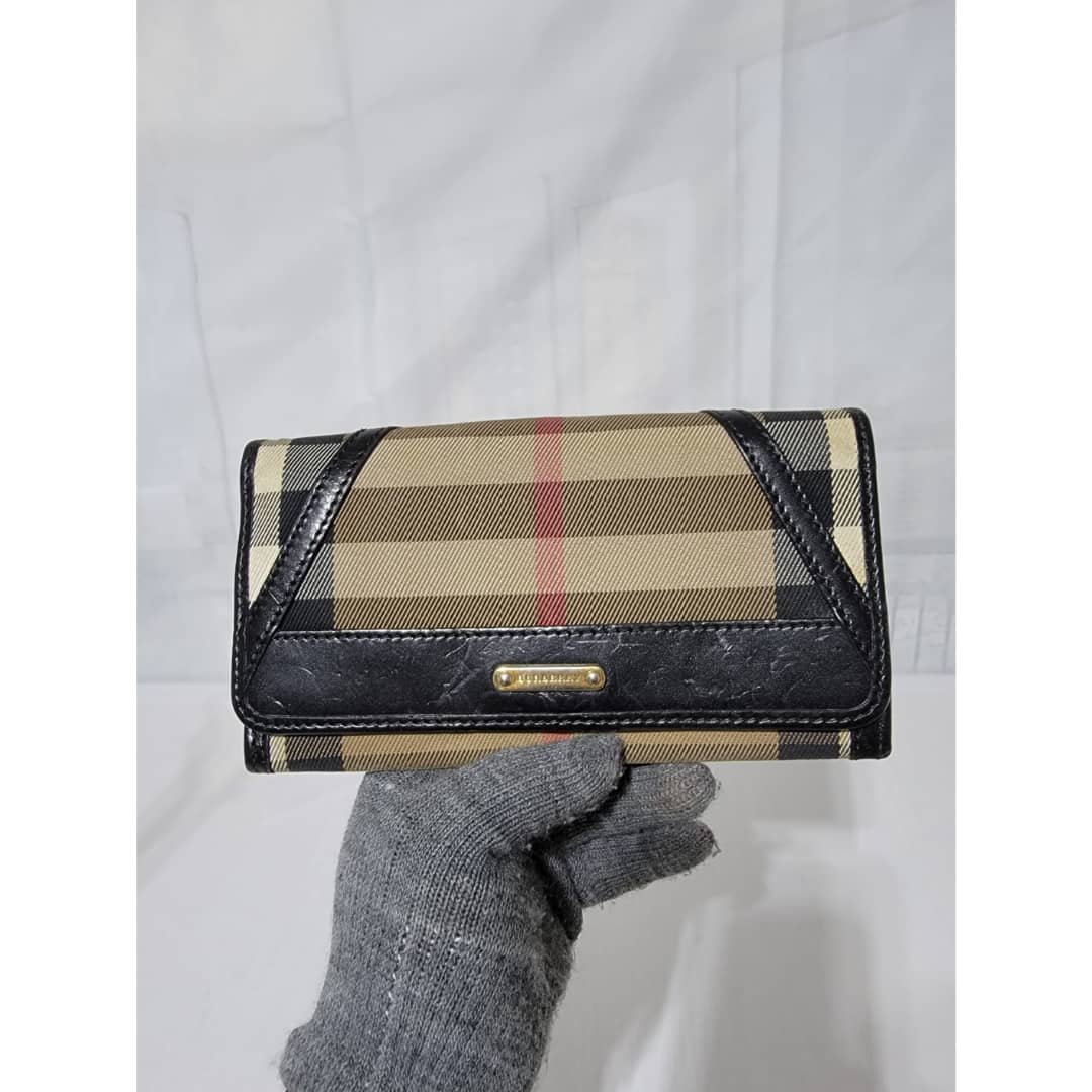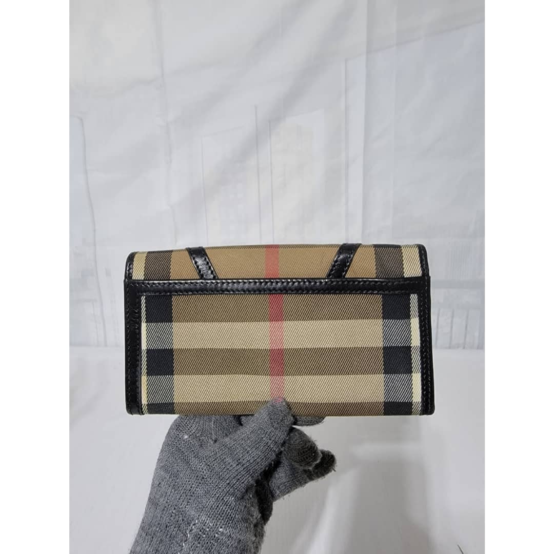 This authentic Burberry House Check Fabric and Leather Leighton Continental Wallet Beige/Black is in it’s good pre-owned condition. The exterior is clean and beautiful. The interior is clean. Gold hardware.