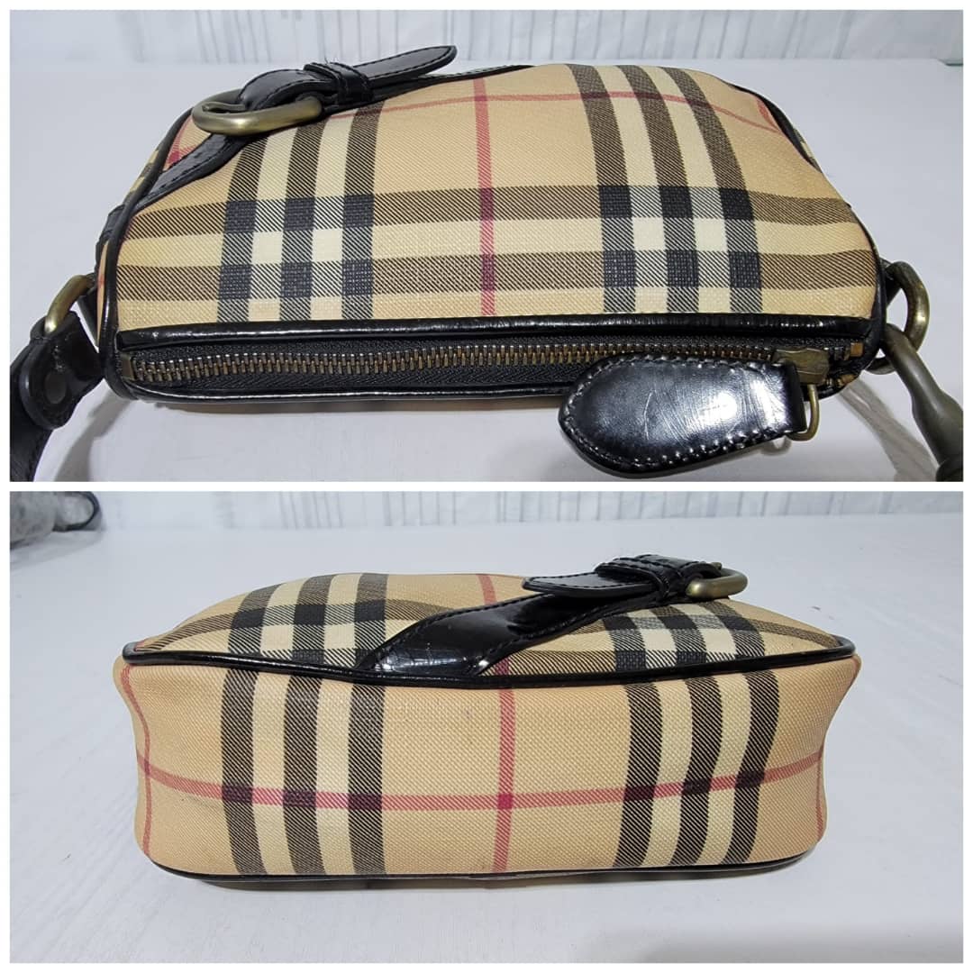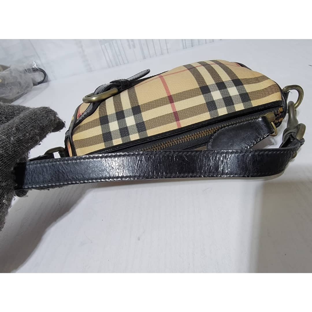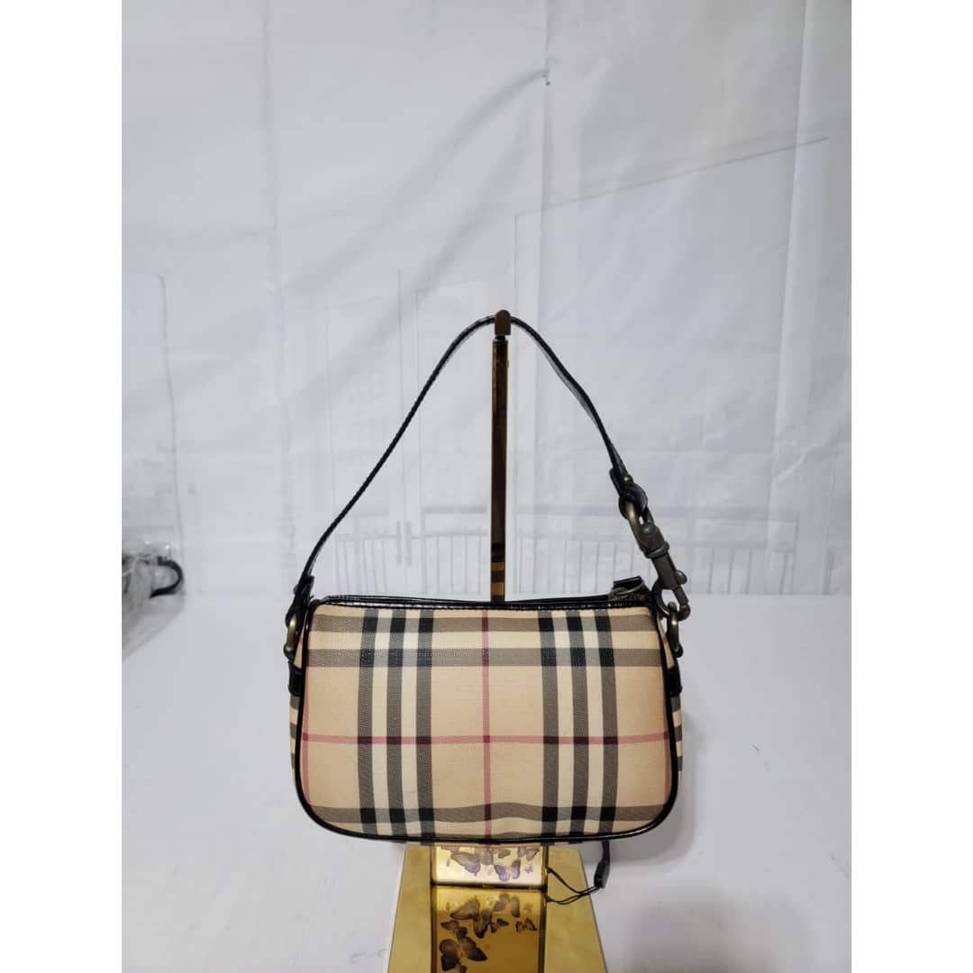 This authentic BURBERRY House Check Pochette Beige/Black is in it’s good pre-owned condition. The exterior coated canvas is clean and beautiful. Interior is clean. Black patent leather around the trim and handle is clean.