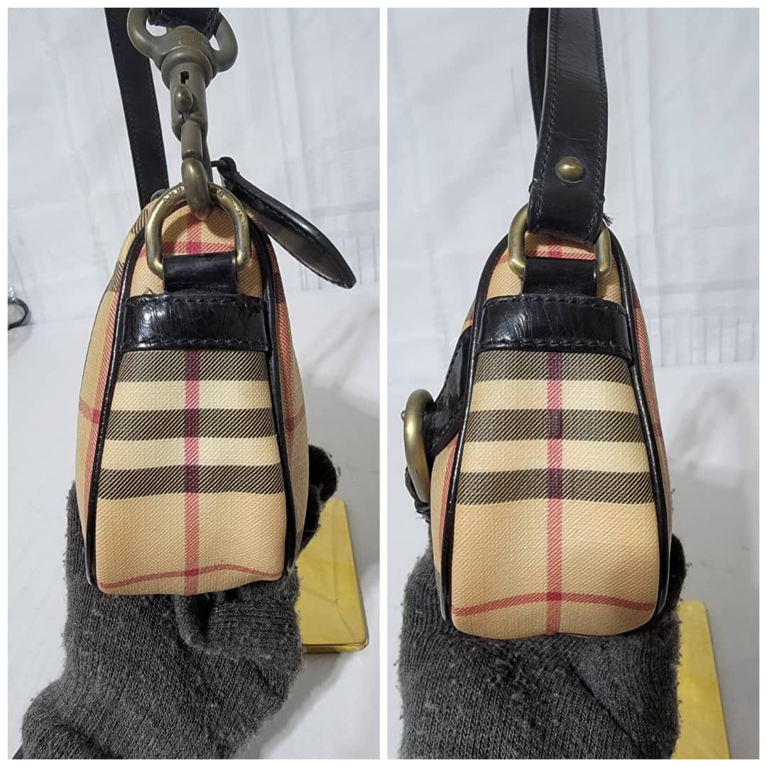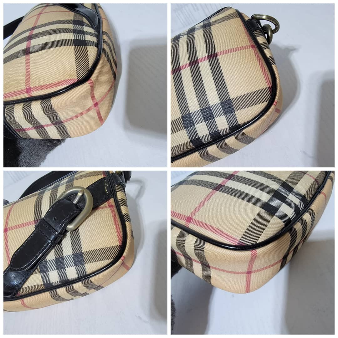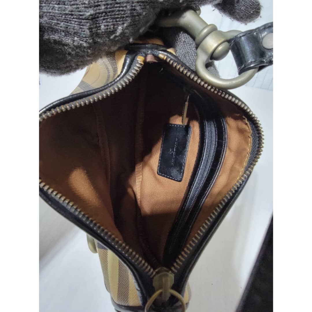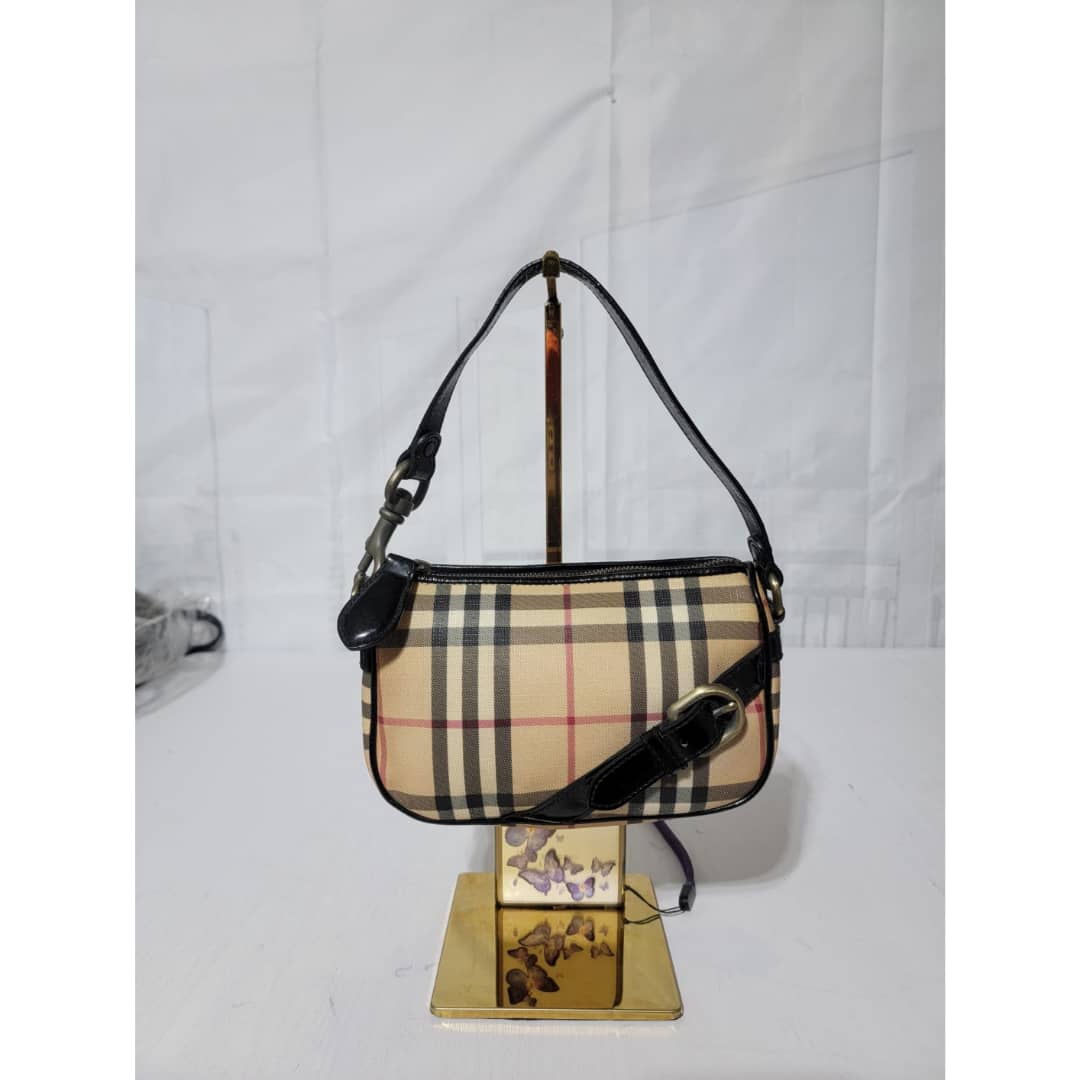 This authentic BURBERRY House Check Pochette Beige/Black is in it’s good pre-owned condition. The exterior coated canvas is clean and beautiful. Interior is clean. Black patent leather around the trim and handle is clean.