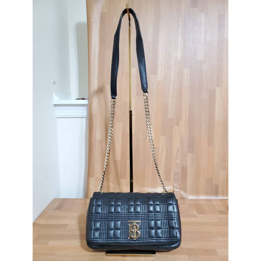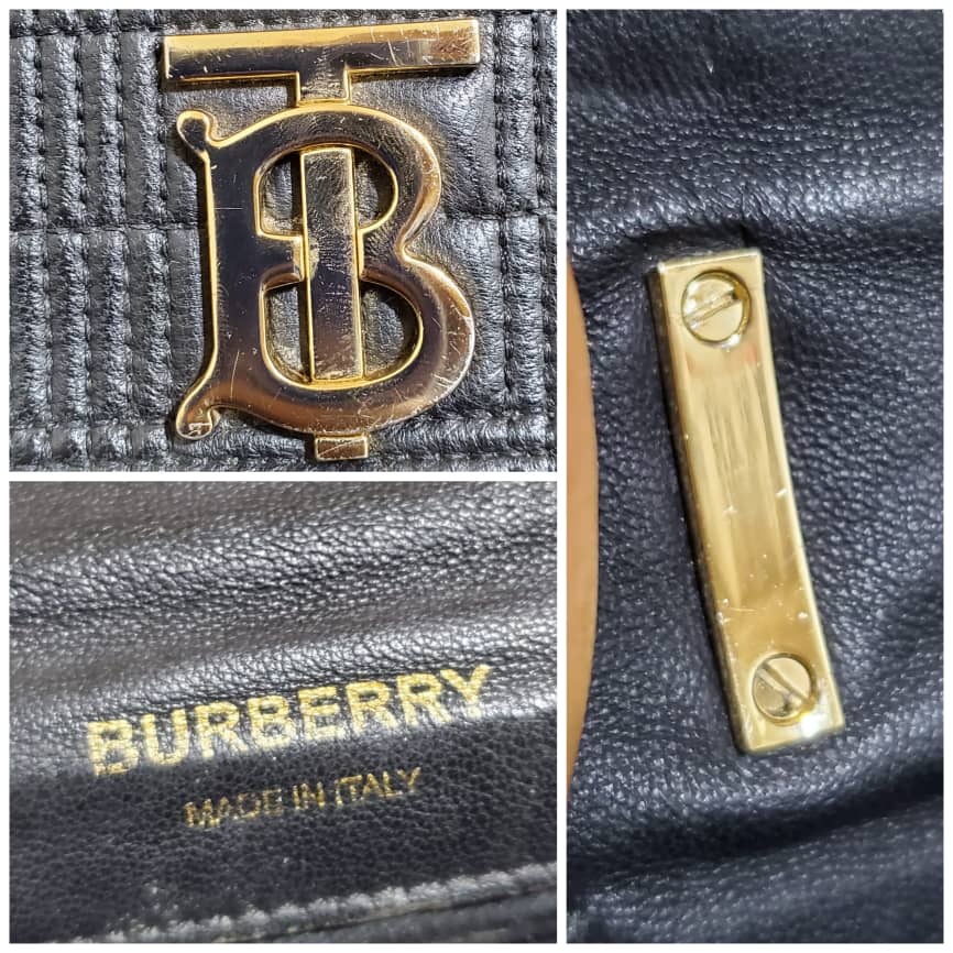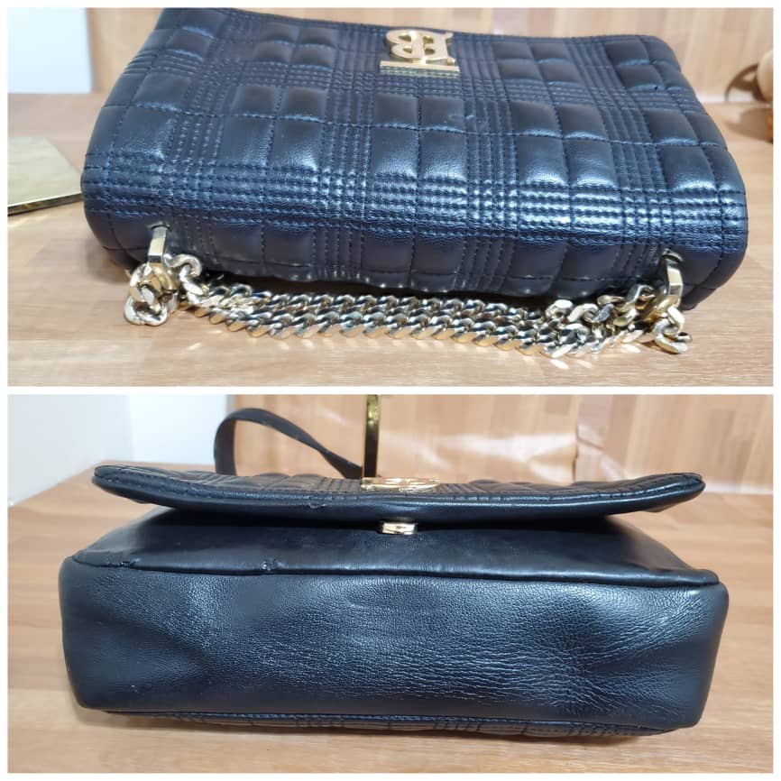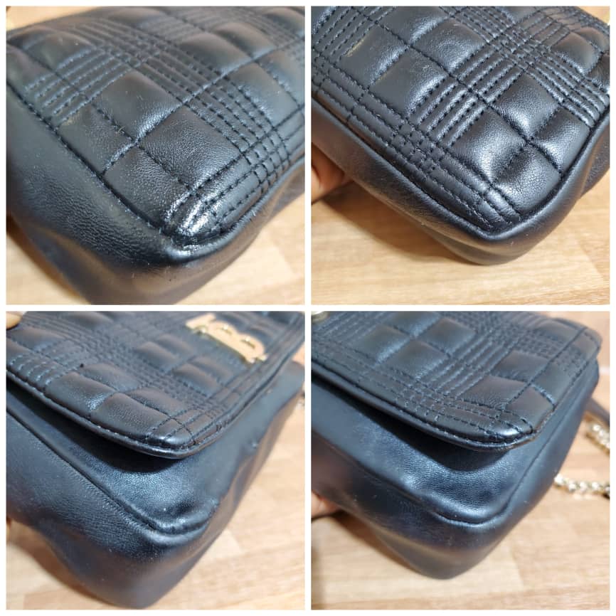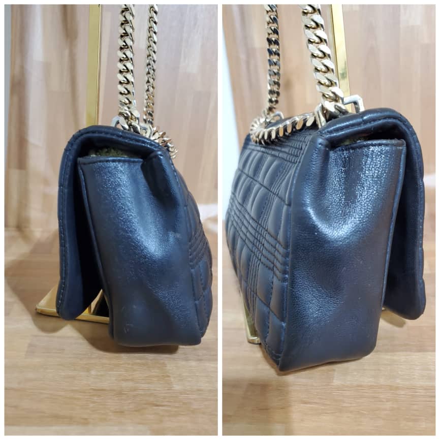 This authentic BURBERRY Lambskin Quilted Small Lola Bag Black is in it’s pre-owned condition.has sign of use. The exterior leather is clean. Interior is clean . The left base shows light little scuff. Gold hardware bright and crispy