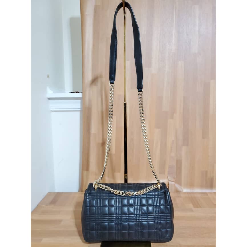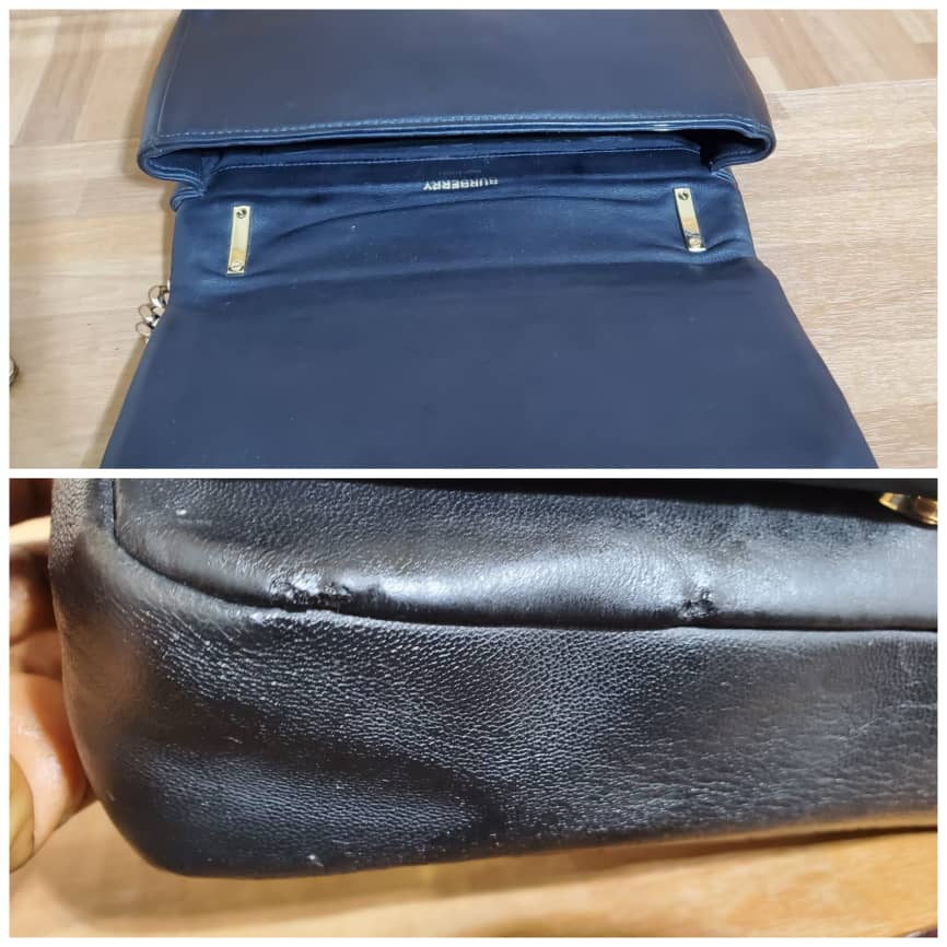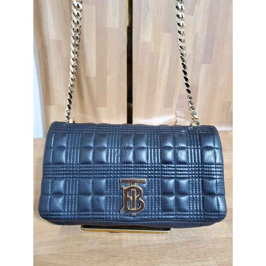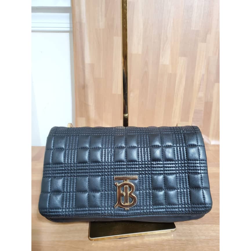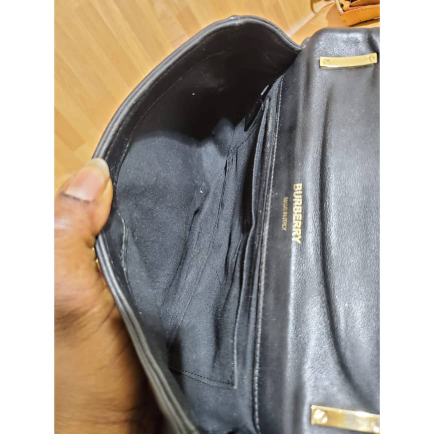 This authentic BURBERRY Lambskin Quilted Small Lola Bag Black is in it’s pre-owned condition.has sign of use. The exterior leather is clean. Interior is clean . The left base shows light little scuff. Gold hardware bright and crispy