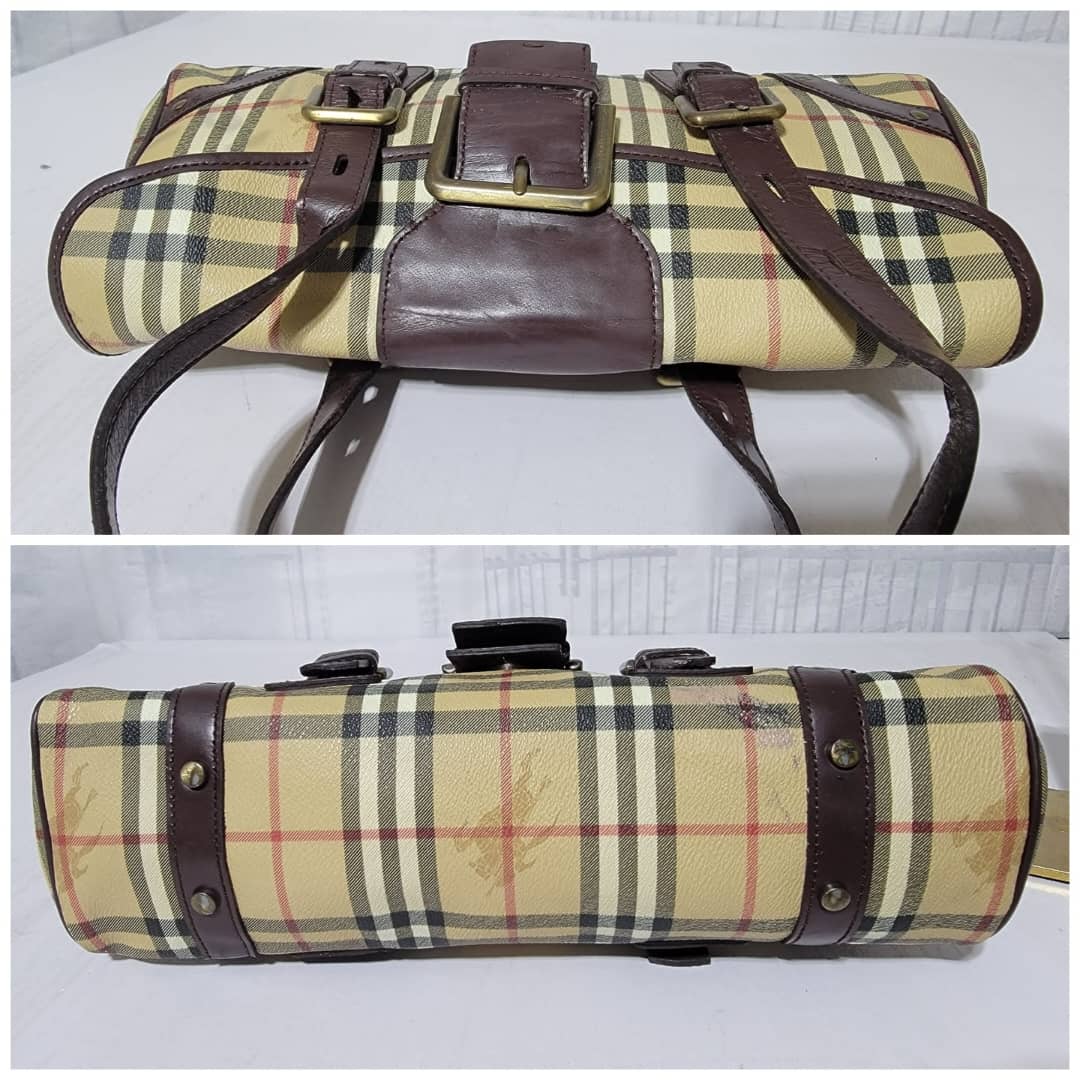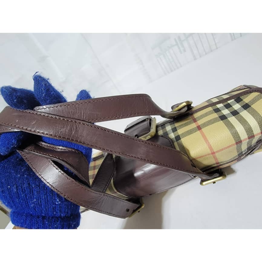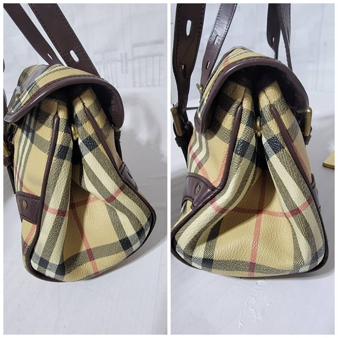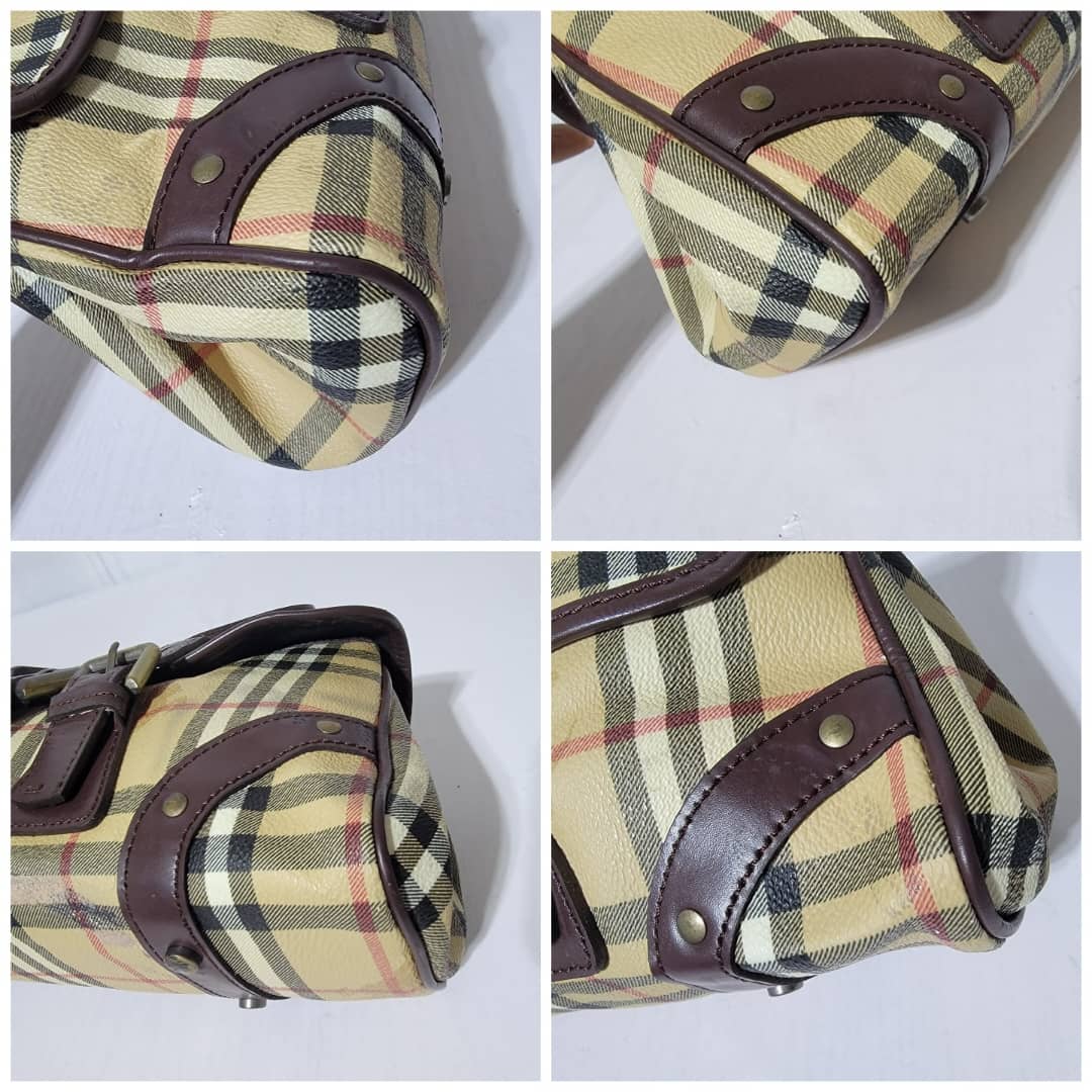 Leather Trimmed Haymarket Check Shoulder Bag is in it’s pre-owned condition. The right side of exterior shows little color transfer stain. Interior is clean. Code tag missing however it comes with a certificate of authenticity. Kindly look at pictures above