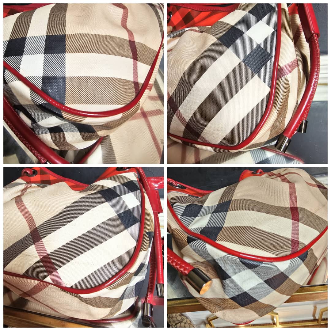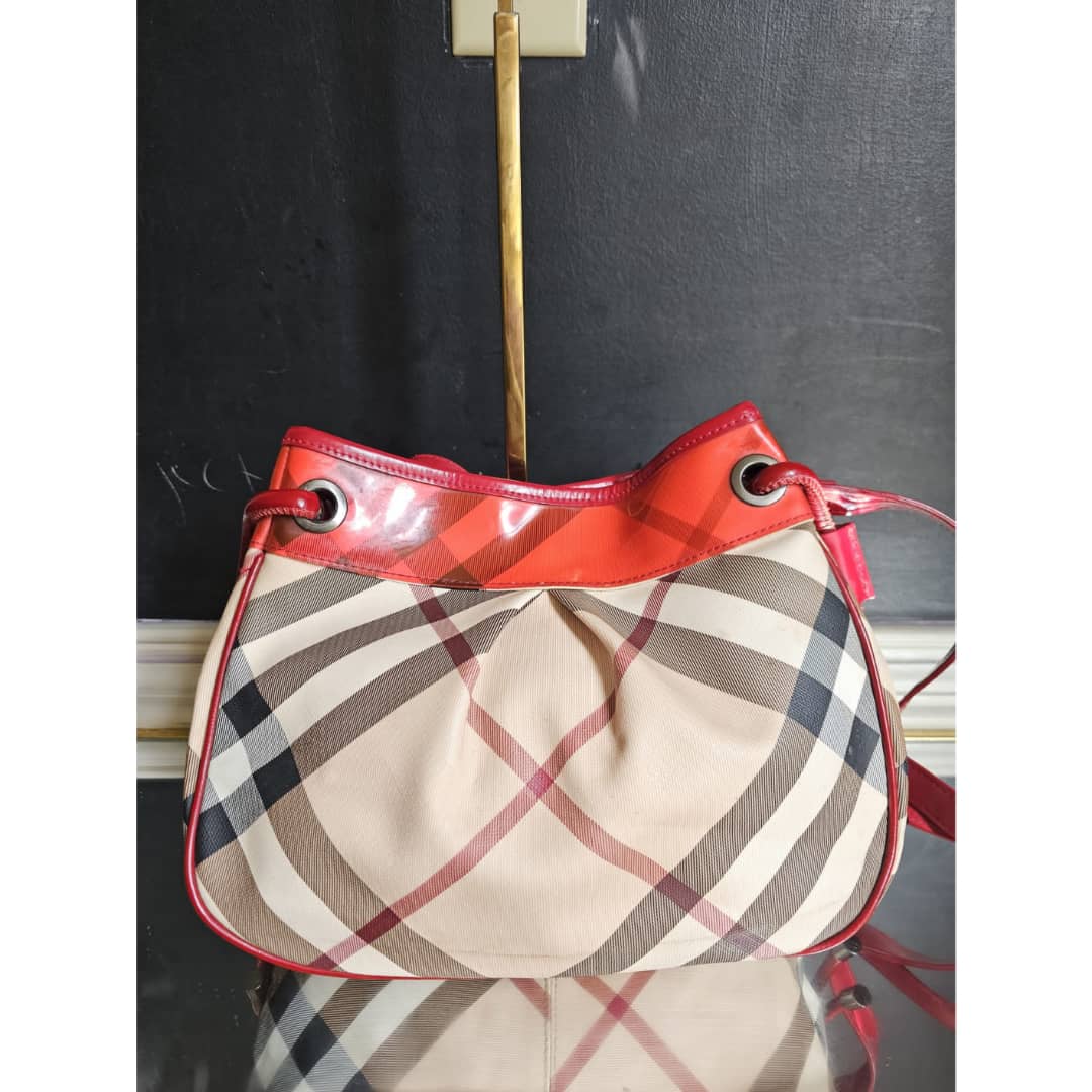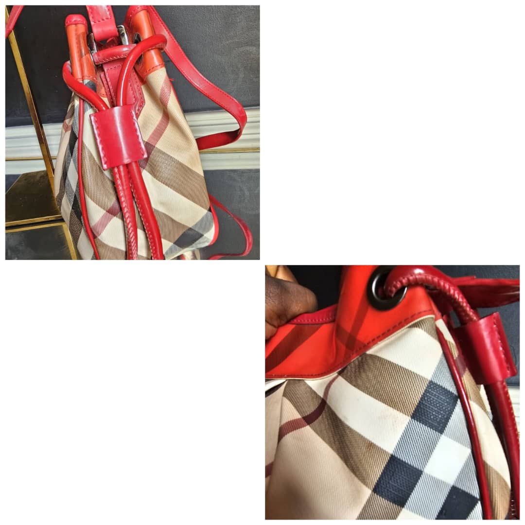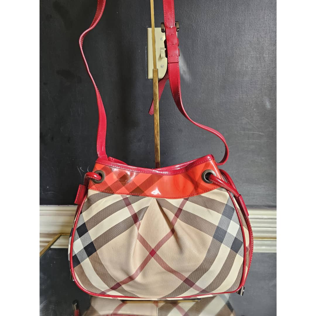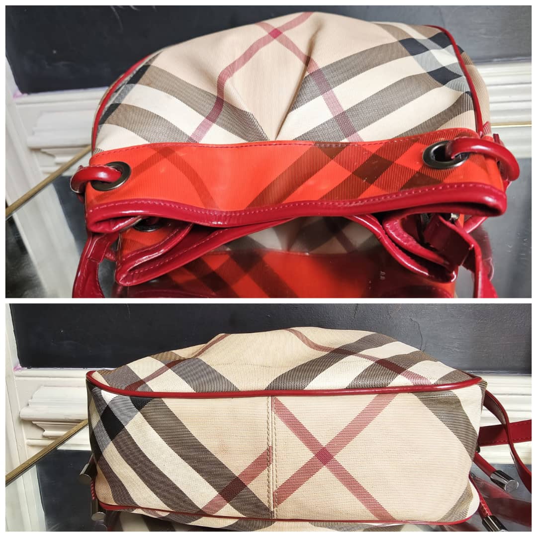 This authentic Burberry nova check bucket bag beige/red is in it’s good pre-owned condition. The exterior beige leather and red top patent leather is clean and beautiful. Interior is clean. Leather strap is clean. Gun metal.