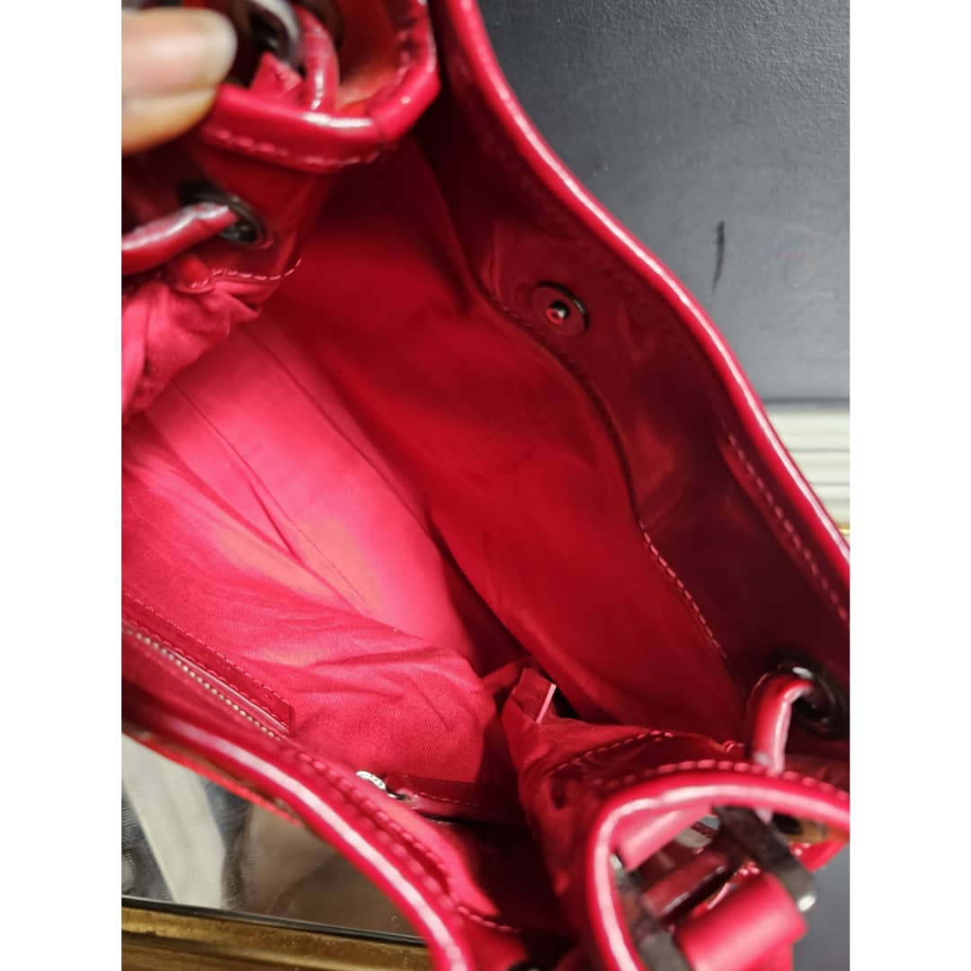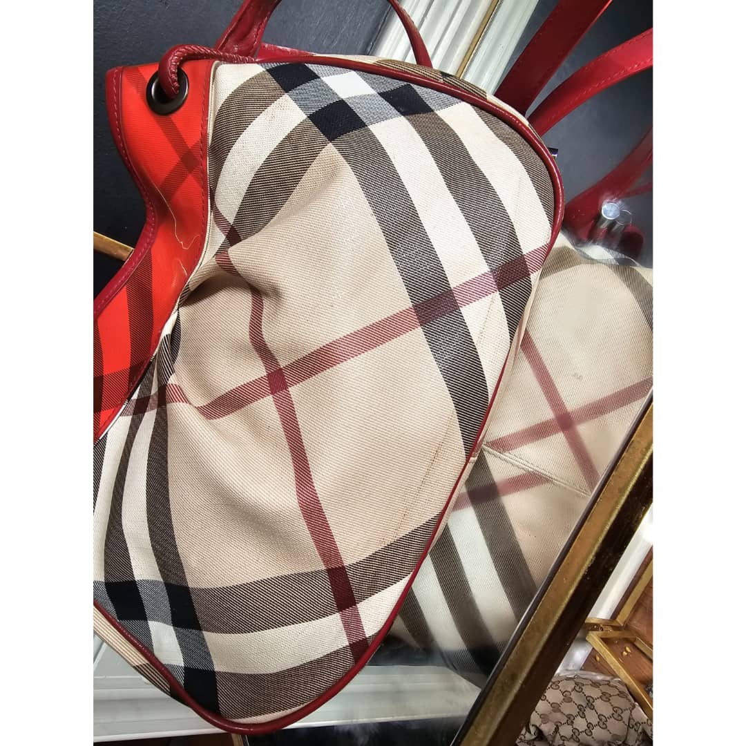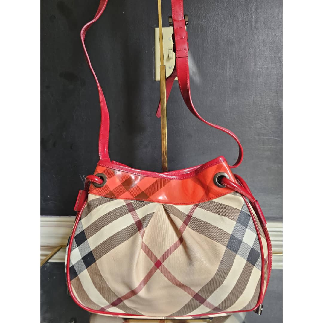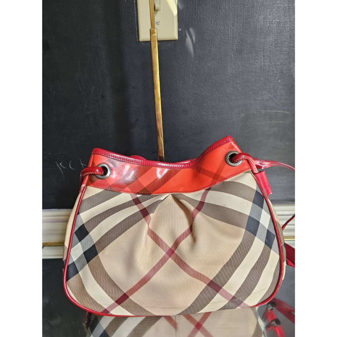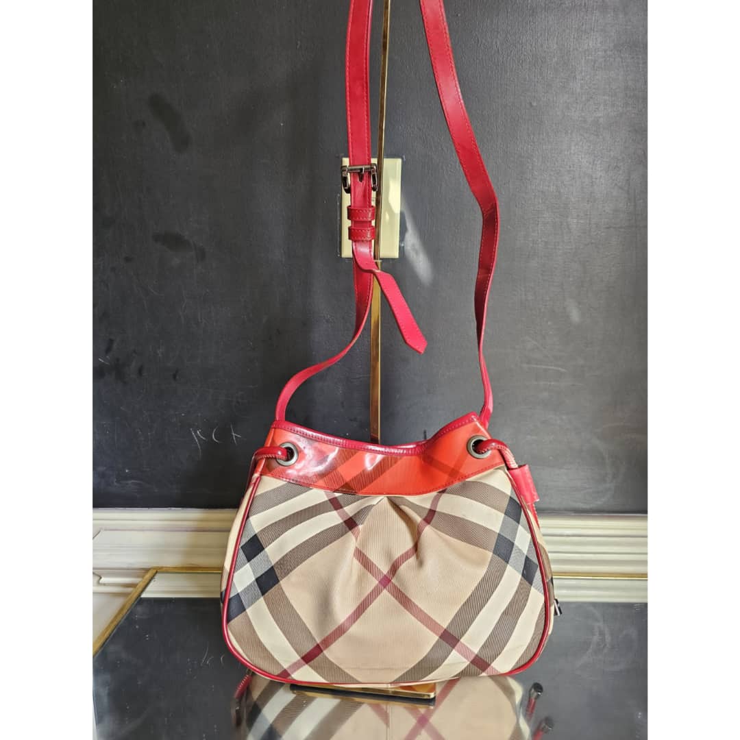 This authentic Burberry nova check bucket bag beige/red is in it’s good pre-owned condition. The exterior beige leather and red top patent leather is clean and beautiful. Interior is clean. Leather strap is clean. Gun metal.