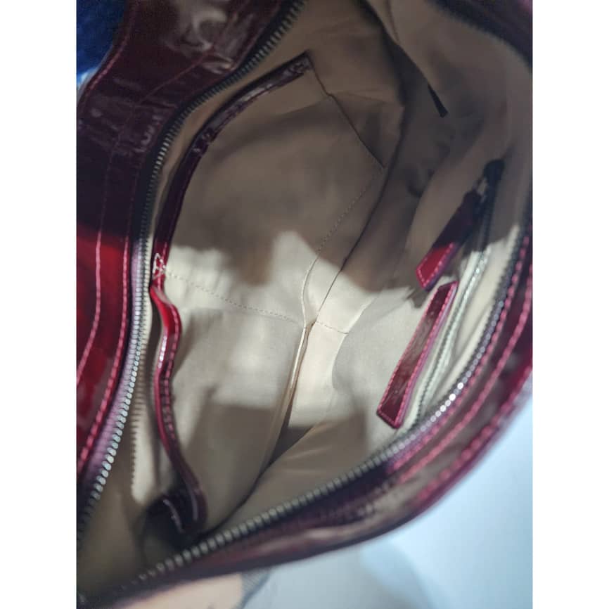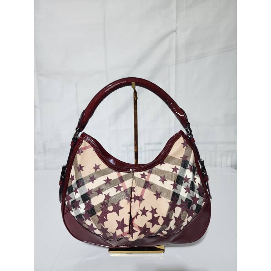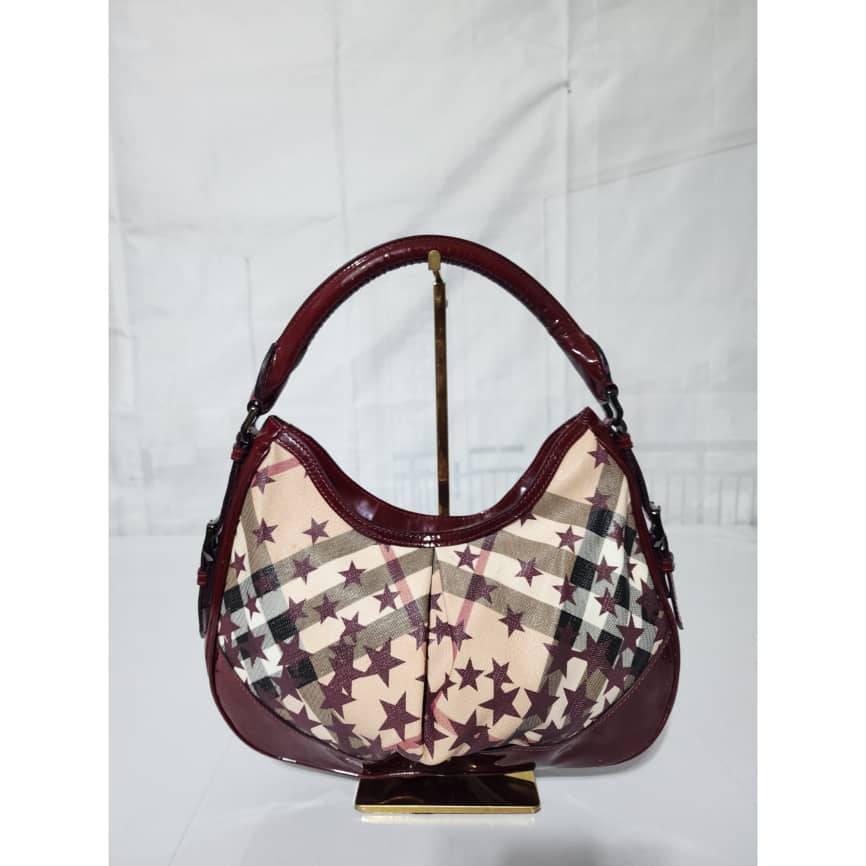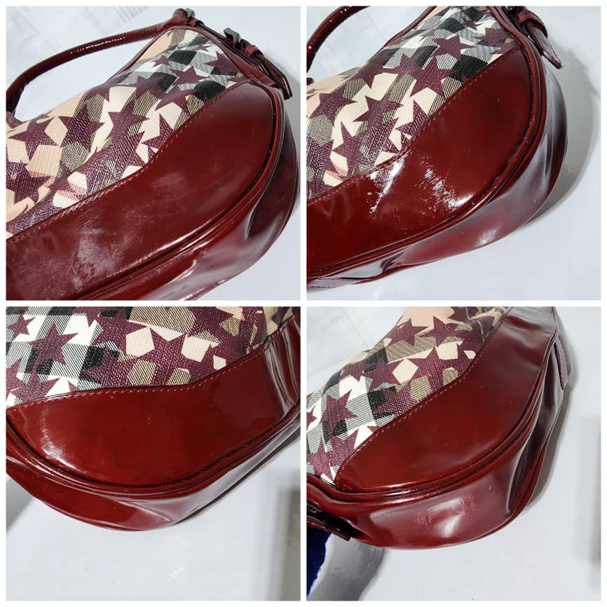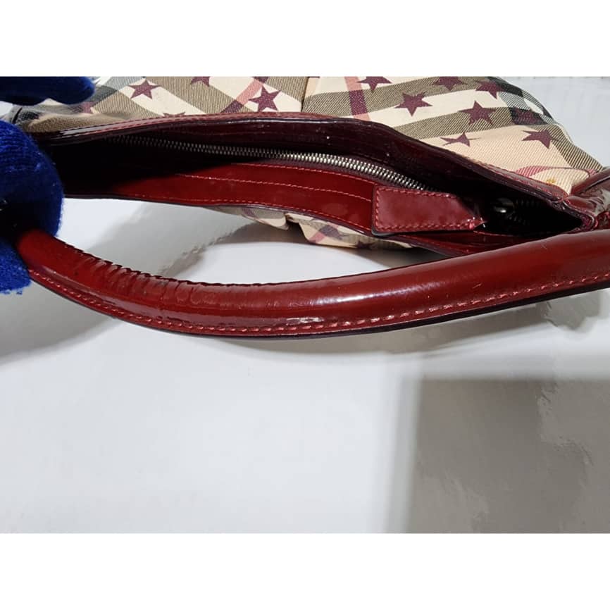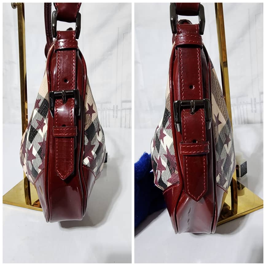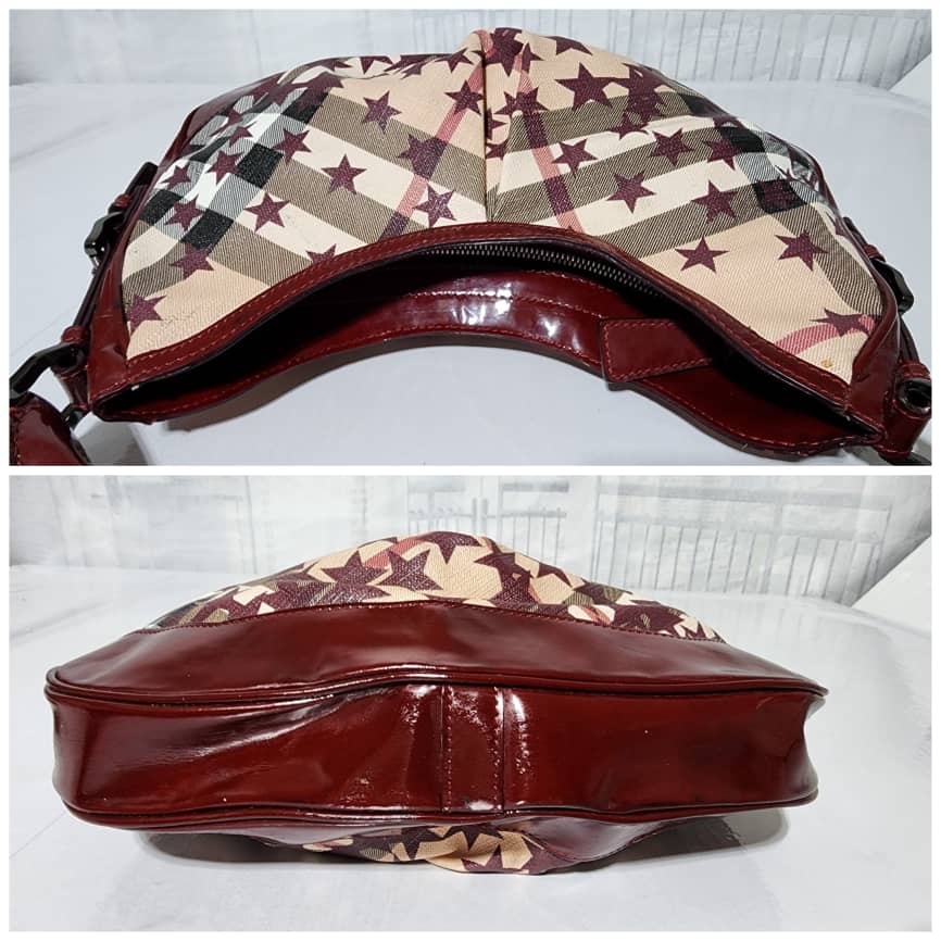 This authentic Burberry Nova Check Berry Red Star Small Hernville Hobo Bag Burgundy/Beige is in it’s good pre-owned condition. The exterior is clean and beautiful. Interior is clean. There is little scratches on the burgundy patent leather by the base edge of the bag. Handle shows rubbing.