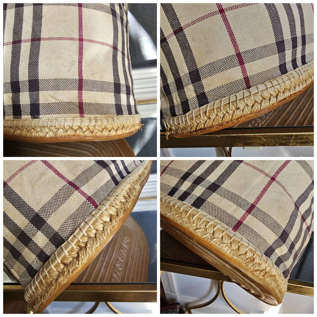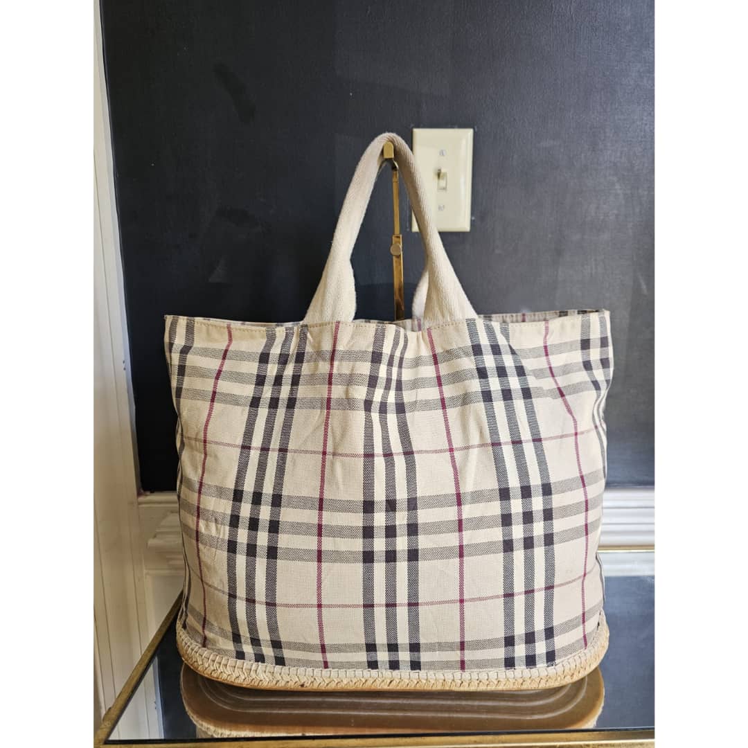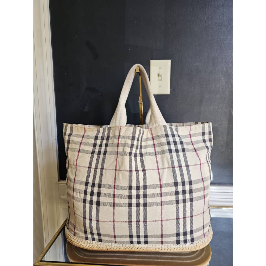 This authentic Burberry Nova check espadrille canvas tote bag Beige is in it’s good pre-owned condition. The exterior canvas is clean and beautiful. Interior is clean. There is a Burberry logo under the bag. It is a very beautiful bag.