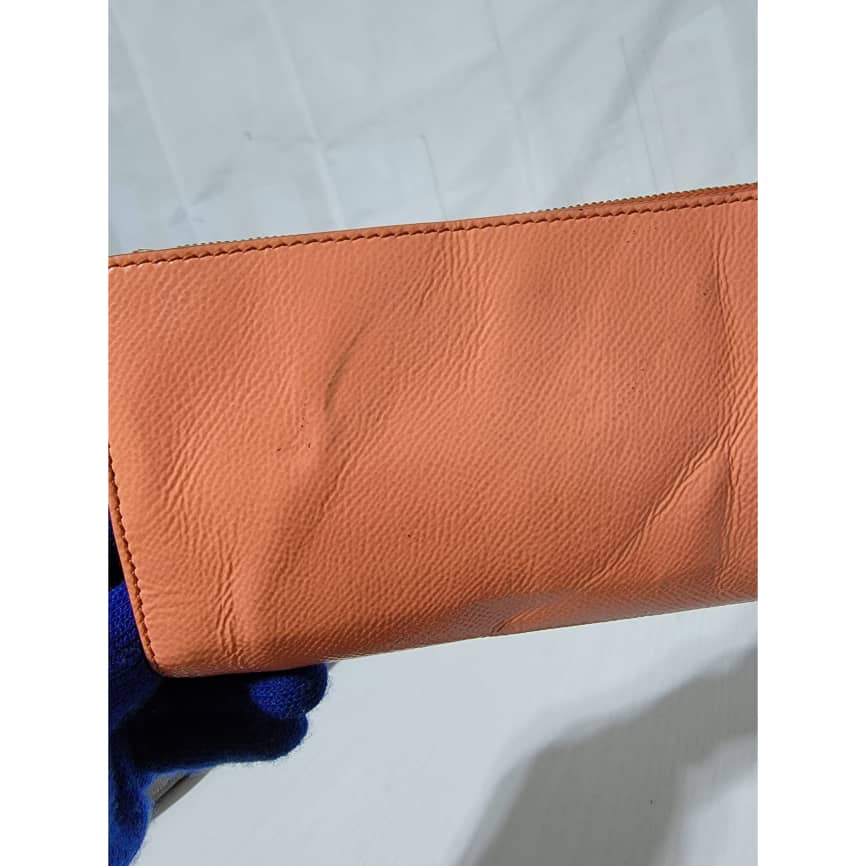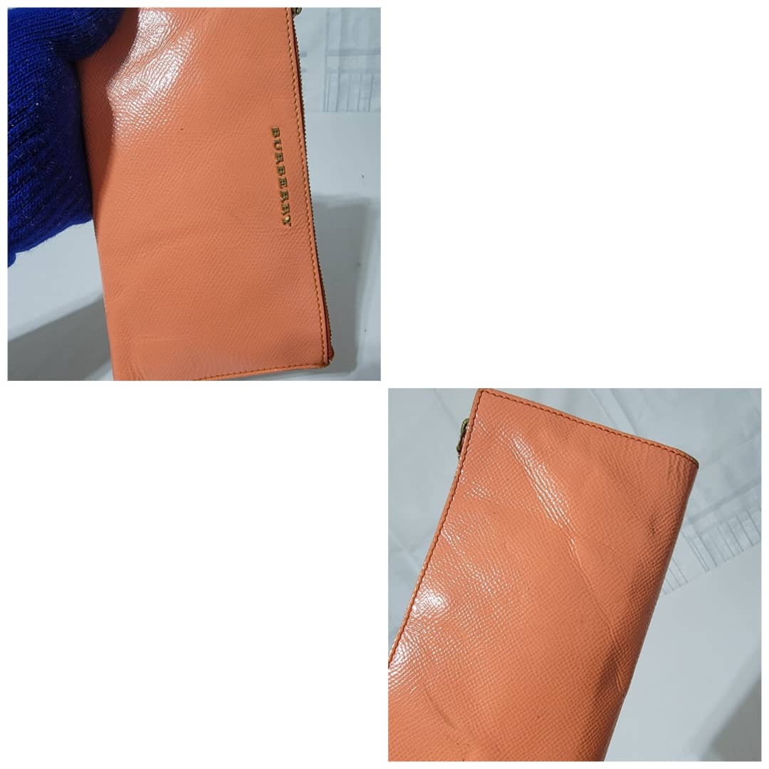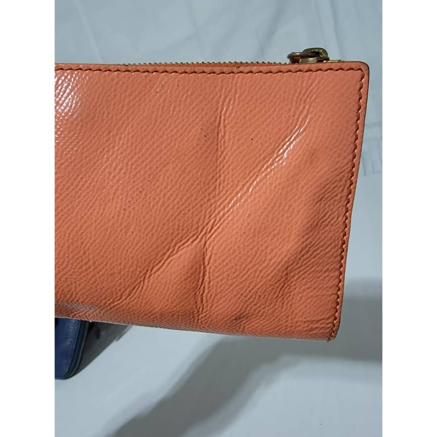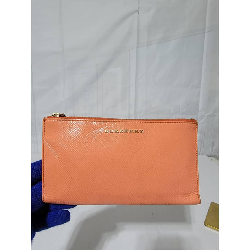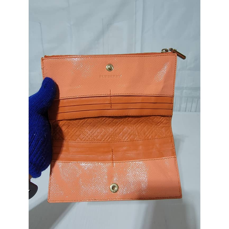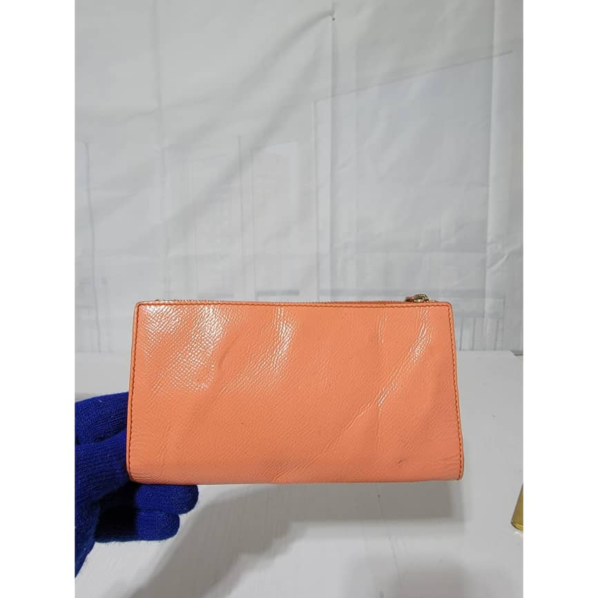 This authentic BURBERRY Patent Constantine Continental Wallet Peach is in it’s pre-owned condition. The exterior is clean however, it shows little dotted color transfer. Kindly look at pictures above, all little stains will be included. It is a patent leather, it opens up, has a lot of space and also a zipper side for the wallet. Interior is clean. Gold hardware.