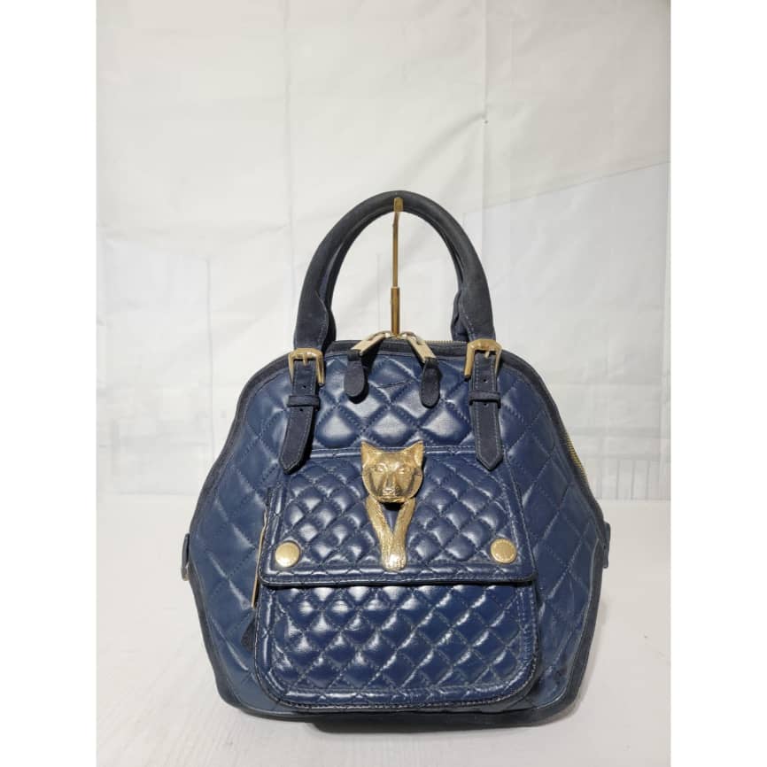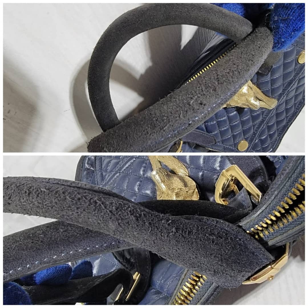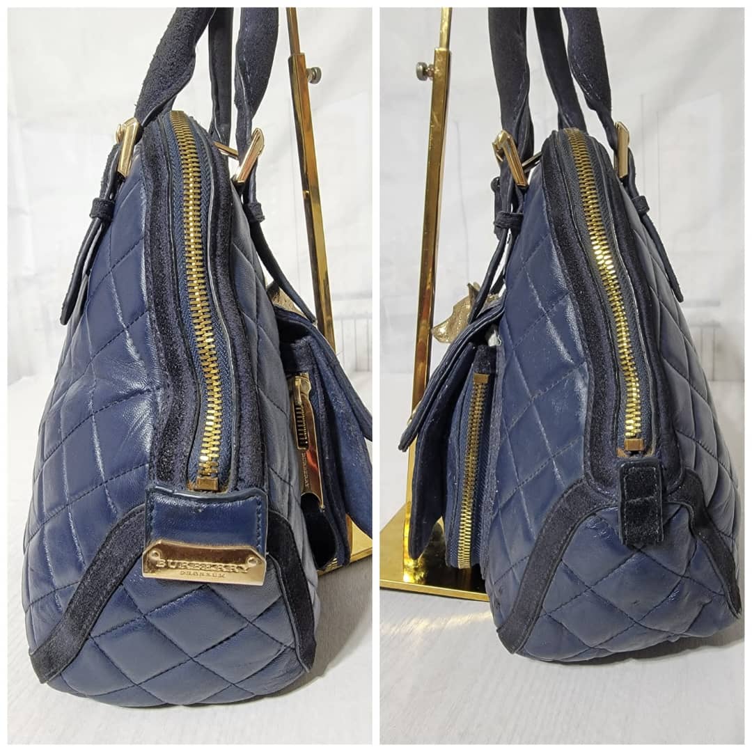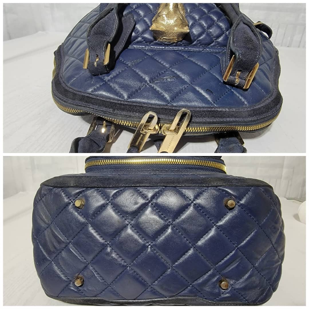 This authentic Burberry Prorsum Dark Navy Blue Quilted Nappa Leather Country Animal Orchard Bag is in it’s good pre-owned condition. The exterior is clean and beautiful. However there is a little scratch curve at the top of the bag not so obvious and by the side.