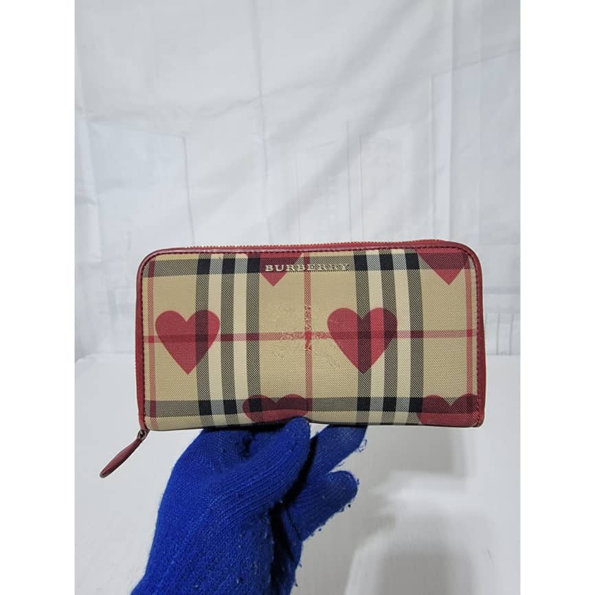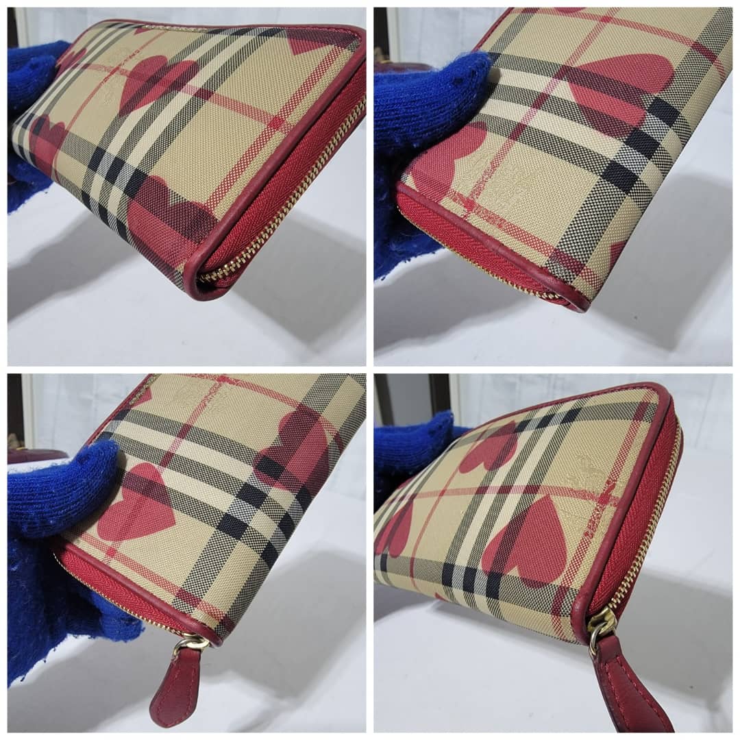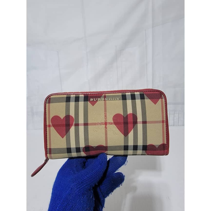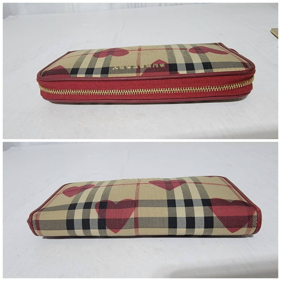 This authentic BURBERRY Red Leather Hay Market Check Canvas Heart Elmore Wallet is in it’s good pre-owned condition the exterior is clean and beautiful. Interior is clean.