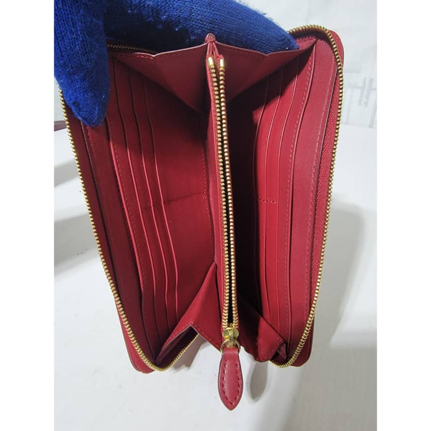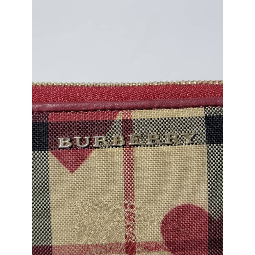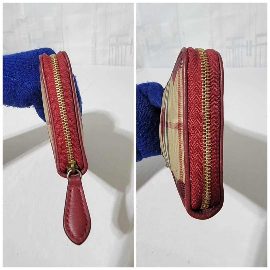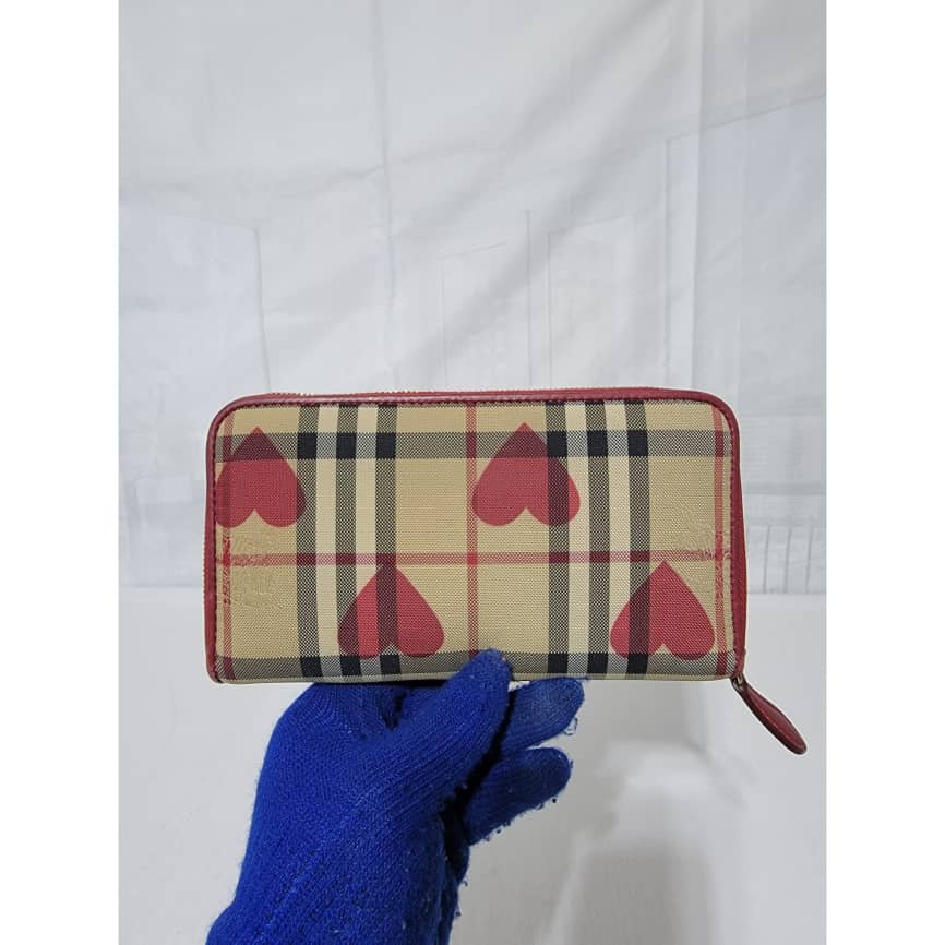 This authentic BURBERRY Red Leather Hay Market Check Canvas Heart Elmore Wallet is in it’s good pre-owned condition the exterior is clean and beautiful. Interior is clean.