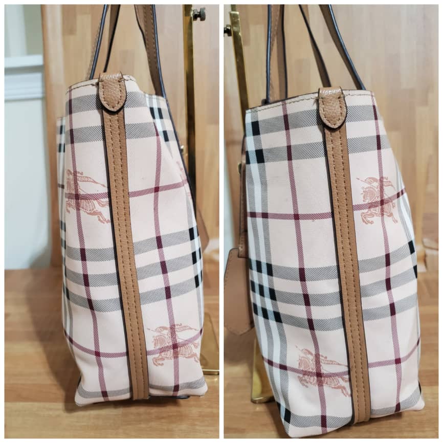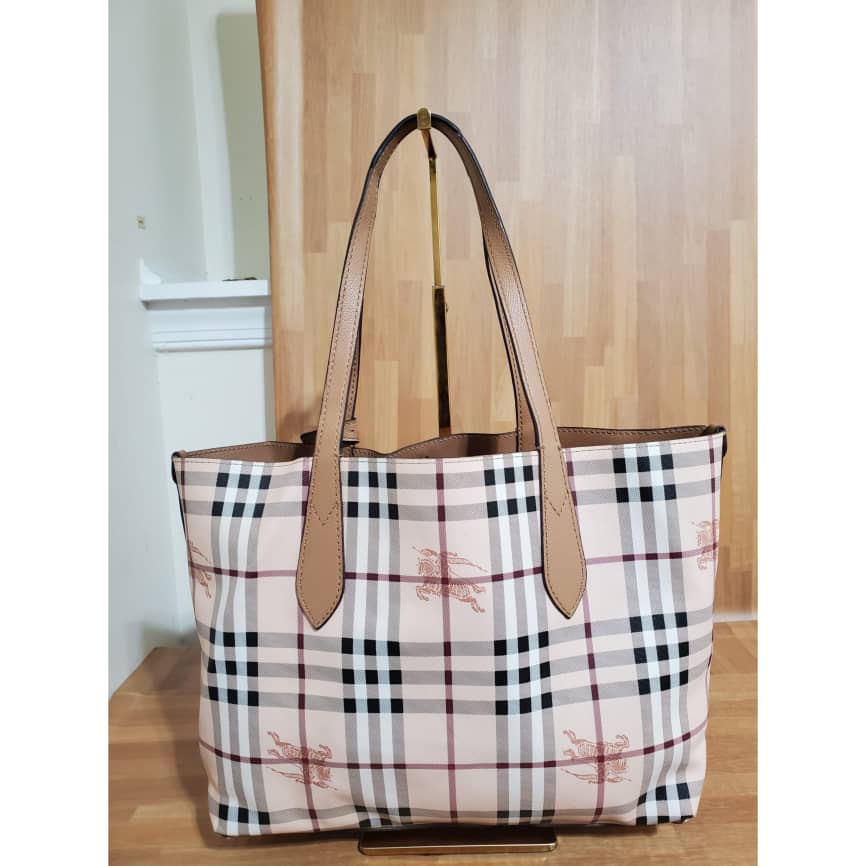 This authentic Burberry Reversible Tote Haymarket Coated Canvas and Leather Medium Print is in it’s pre-owned good condition.has sign of use. The exterior coated canvas is clean and beautiful. Interior is clean.