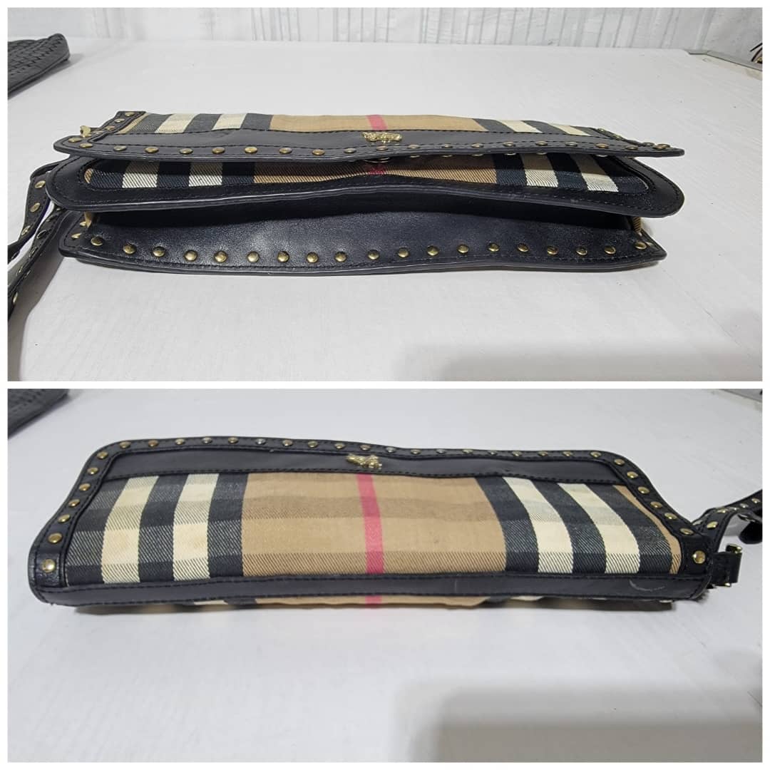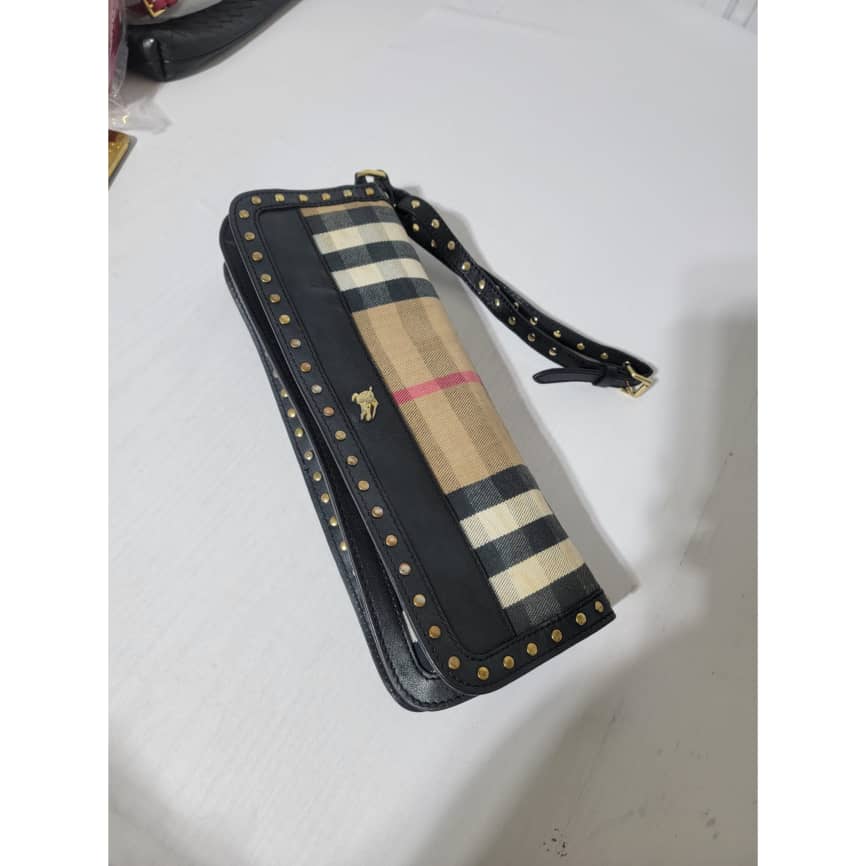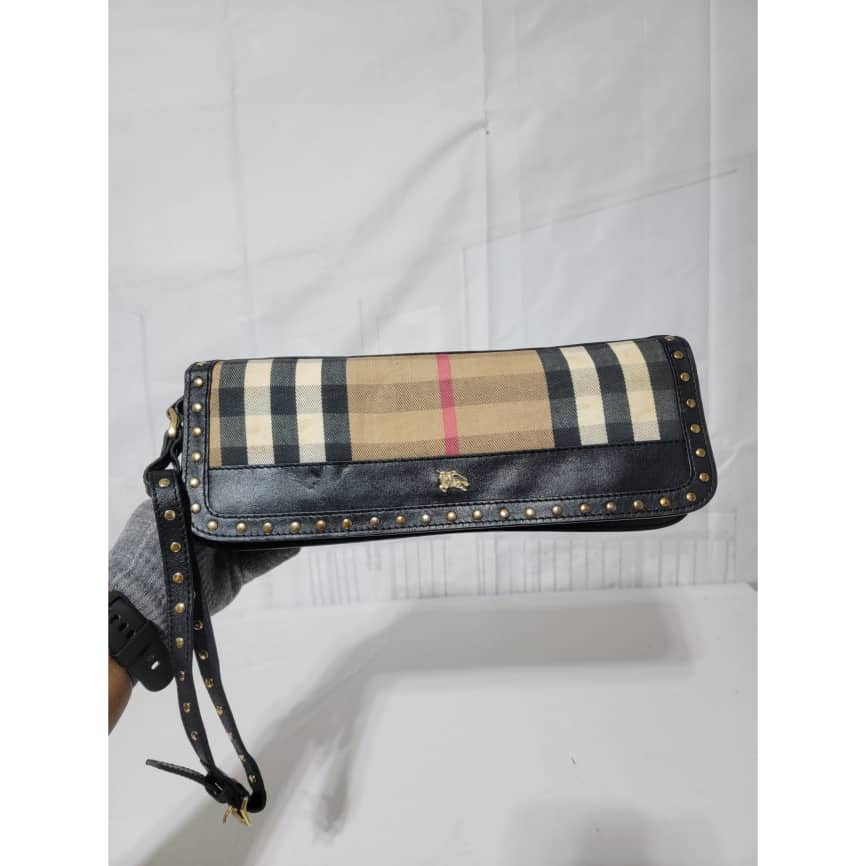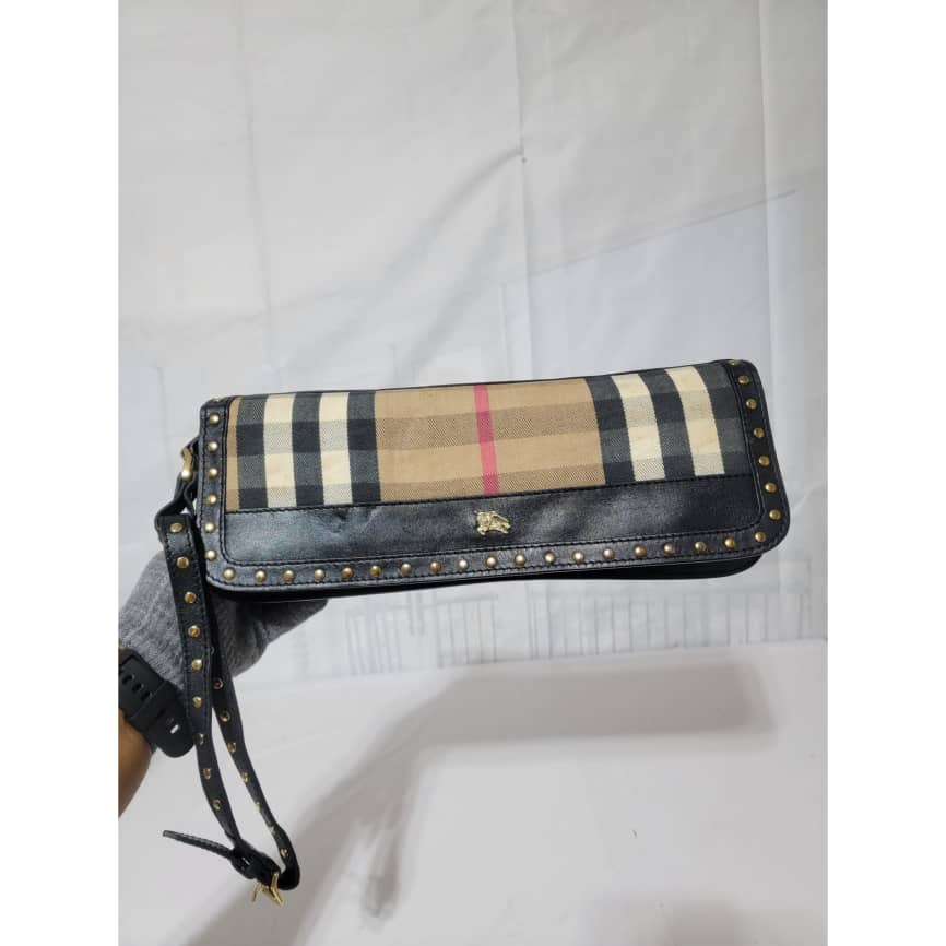 This authentic BURBERRY LEATHER HOUSE CHECK CANVAS CLUTCH/WRISTLET BLACK is in it’s pre-owned condition. The exterior is clean however, it shows some sign of use. The interior is clean. It comes with a detachable wristlet strap, you can also run a long strap in between the bag across the flap and make it a crossbody or a shoulder bag. It is a very beautiful rectangle clutch.