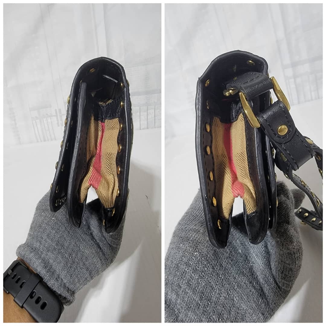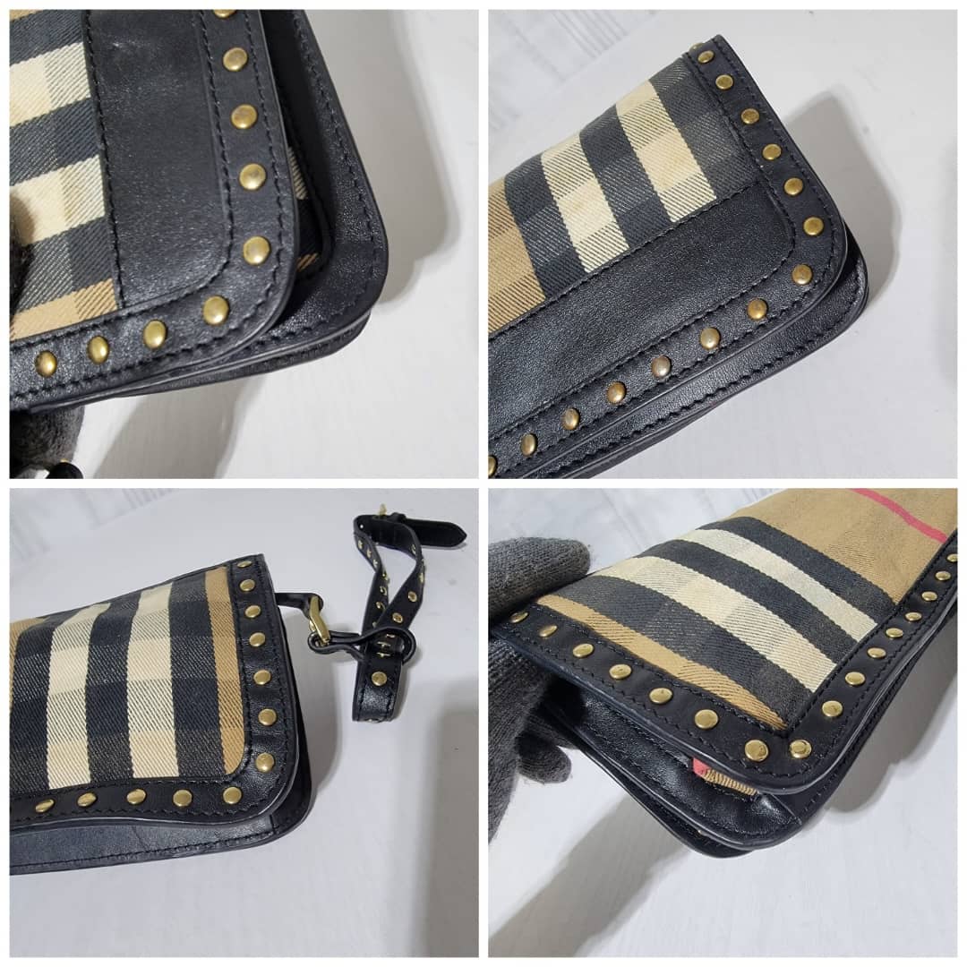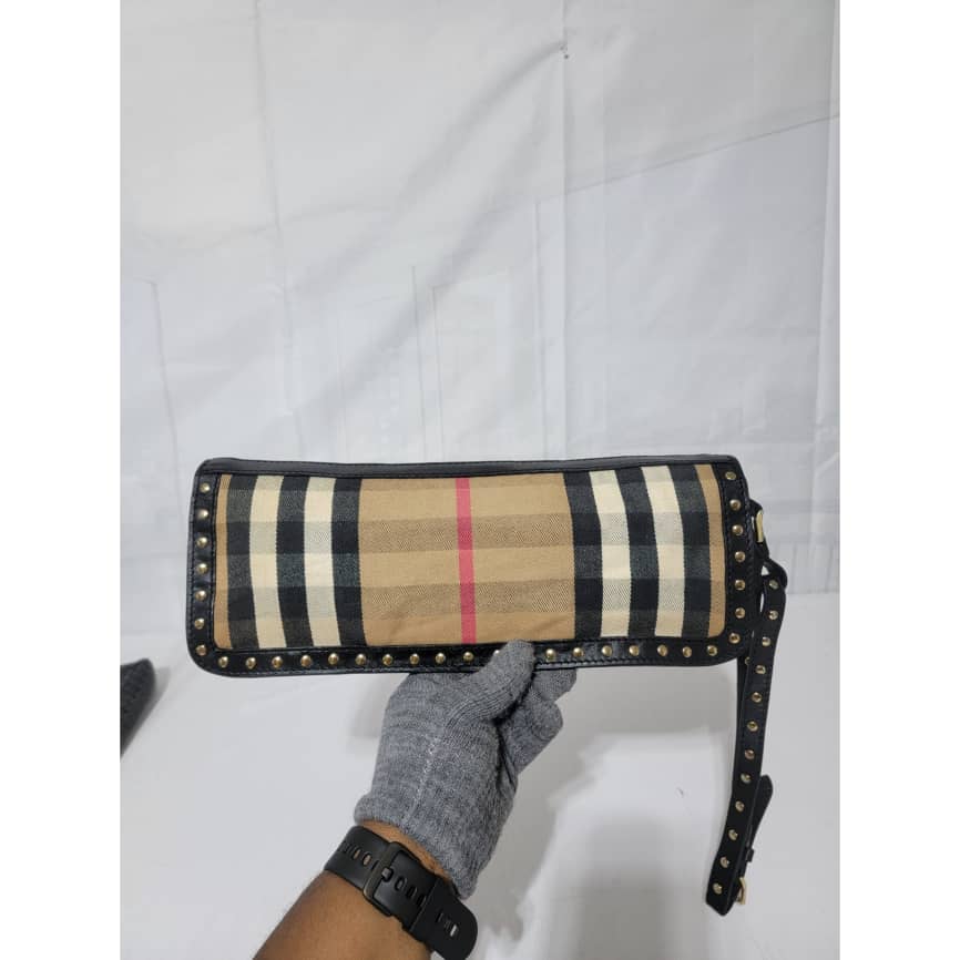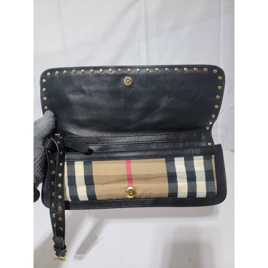 This authentic BURBERRY LEATHER HOUSE CHECK CANVAS CLUTCH/WRISTLET BLACK is in it’s pre-owned condition. The exterior is clean however, it shows some sign of use. The interior is clean. It comes with a detachable wristlet strap, you can also run a long strap in between the bag across the flap and make it a crossbody or a shoulder bag. It is a very beautiful rectangle clutch.