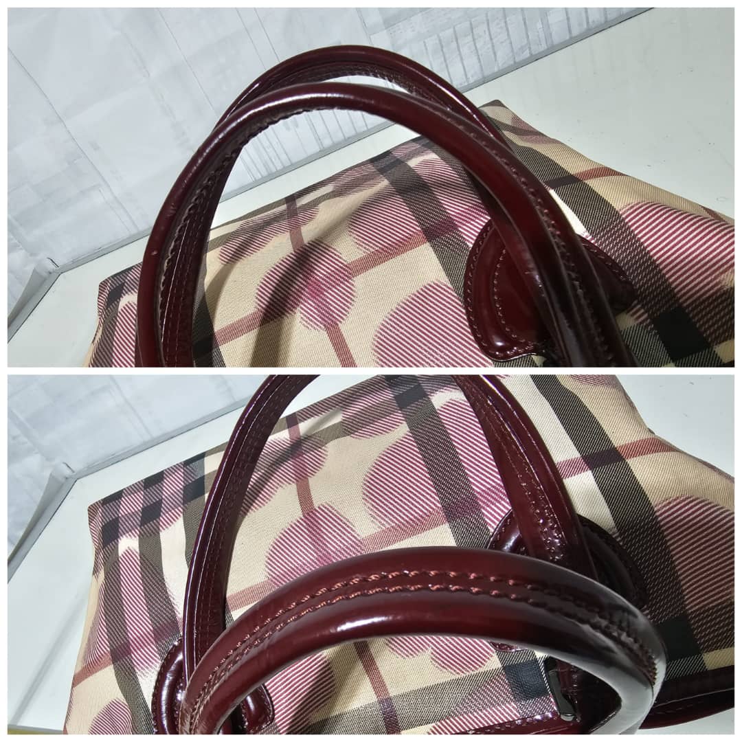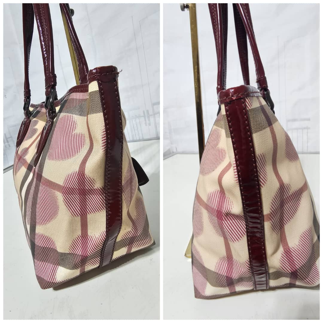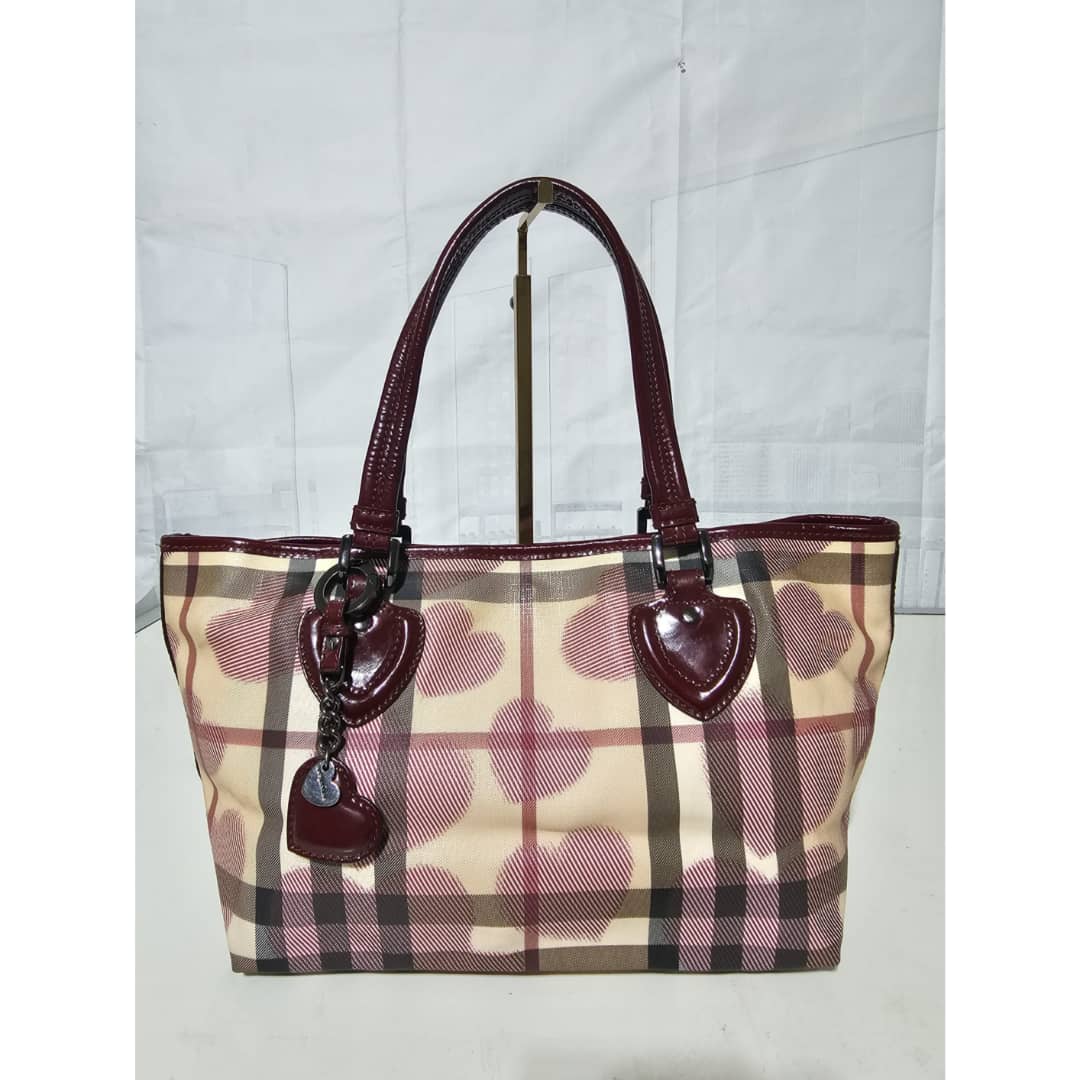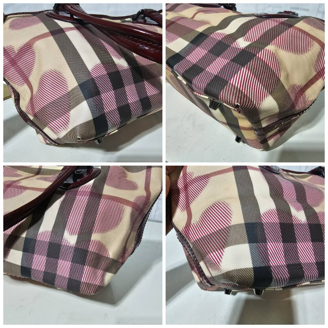 This authentic Burberry House Check Hearts Gracie Tote Bag Burgundy/Beige is in it’s good pre-owned condition. The exterior is clean and beautiful. Limited edition. Burgundy trim leather. Interior is clean.