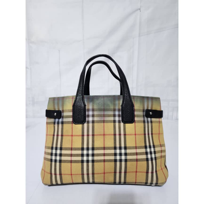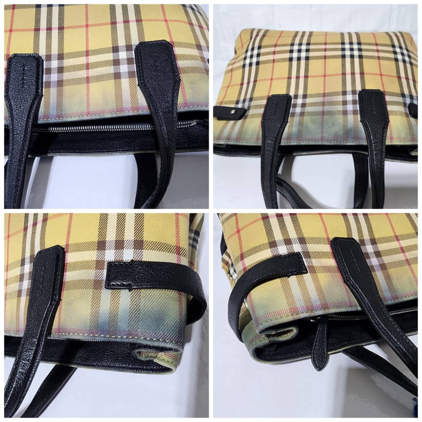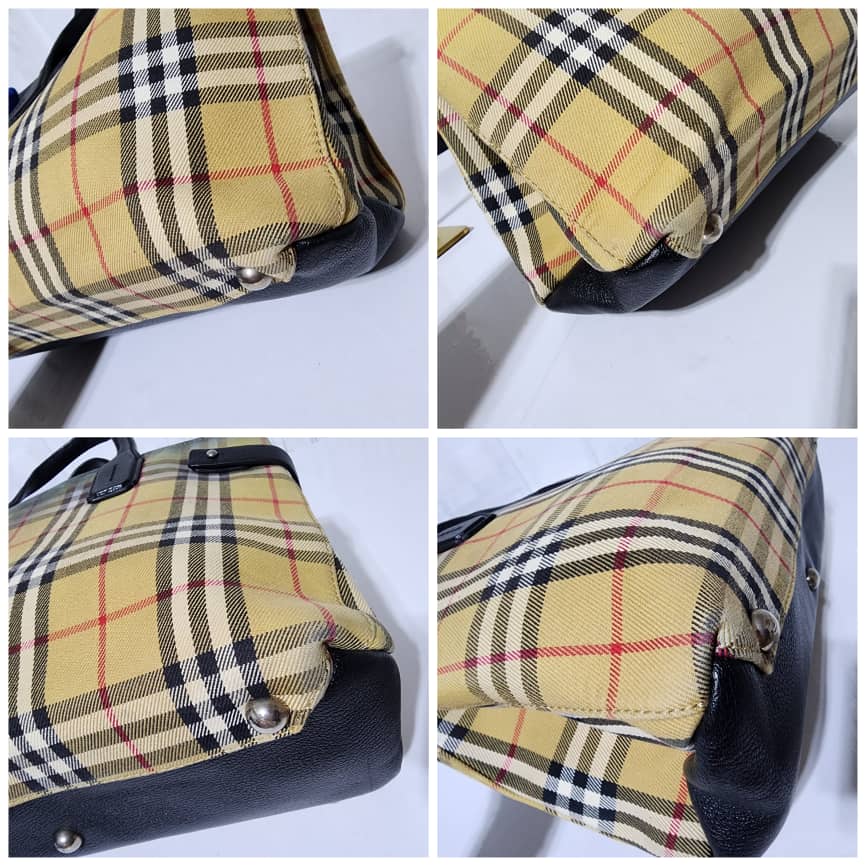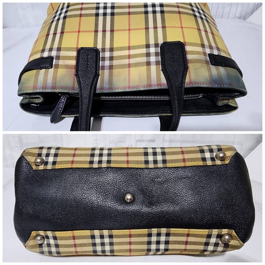 This authentic BURBERRY Vintage Check Medium Banner Tote Bag Black/Beige is in it’s pre-owned condition. The exterior is clean however, there is a color transfer stain at the top of the bag, it also affects the interior. The interior is clean but it also shows the color transfer to the fabric (Kindly look at pictures above). No long strap