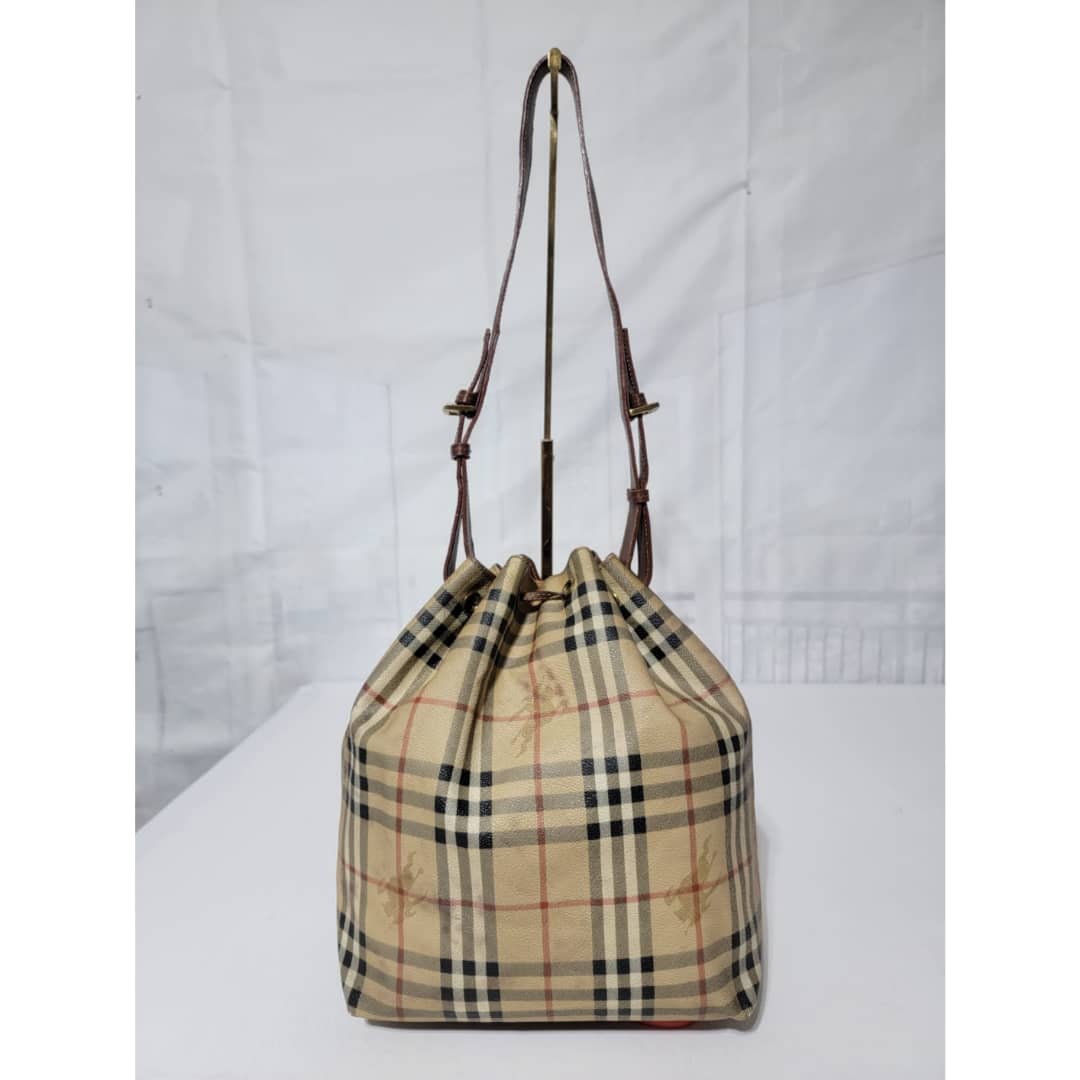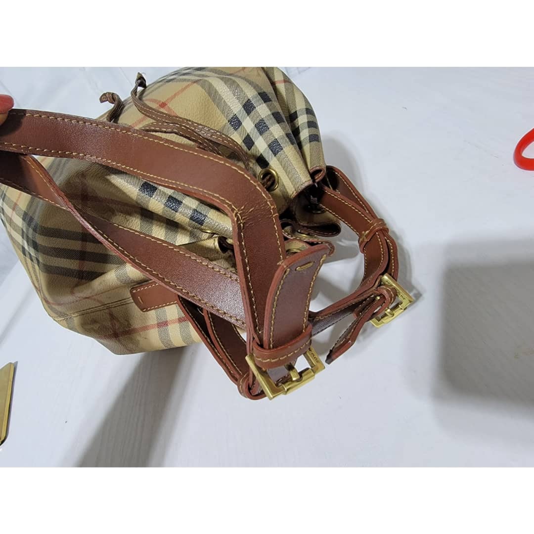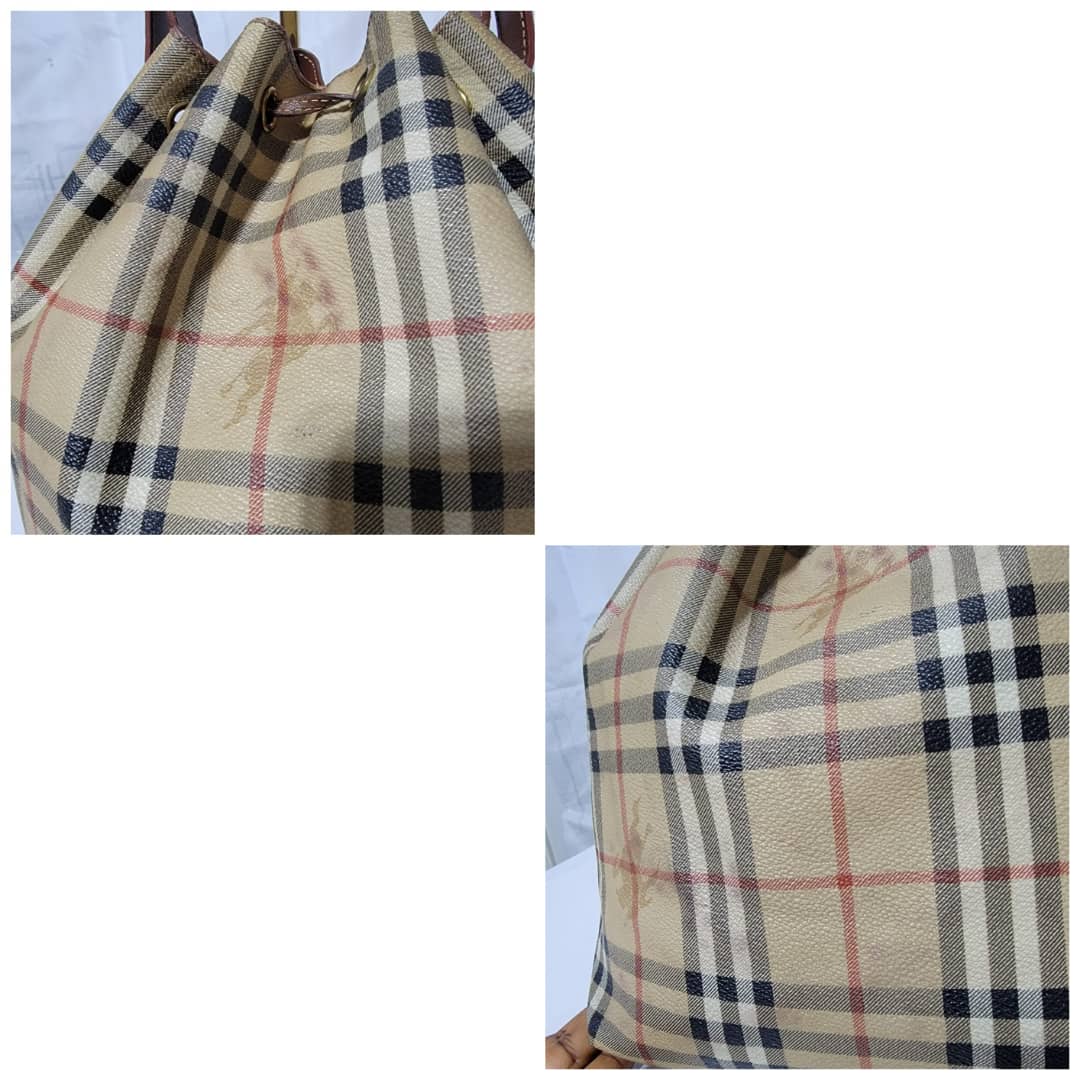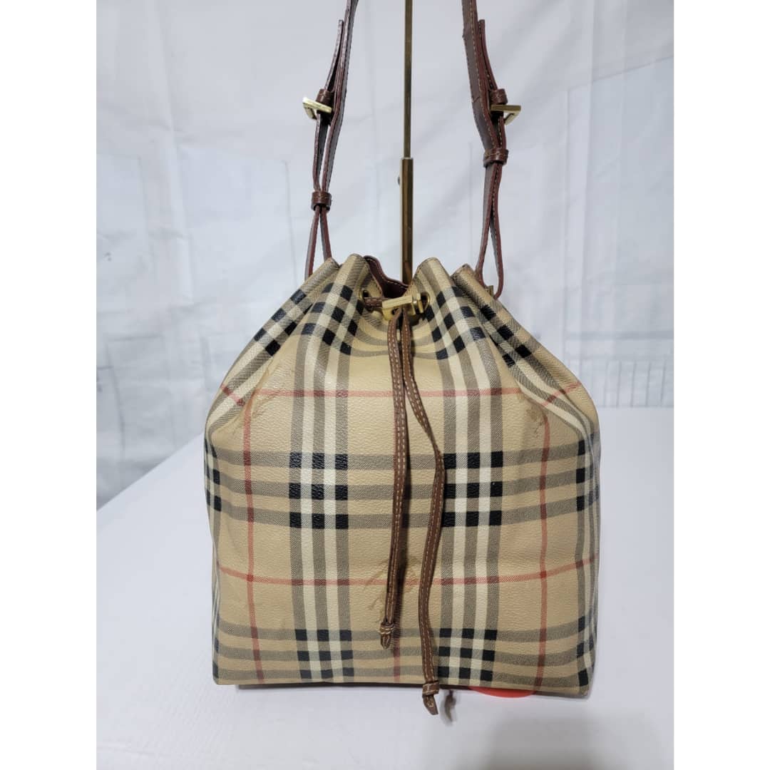 This authentic BURBERRY Vintage Drawstring Bucket Bag is in it’s good pre-owned condition. The exterior canvas is clean and beautiful. The back exterior shows little color transfer (Kindly look at pictures above). Base edges shows light scratches. Interior is clean. The strap handle is adjustable.