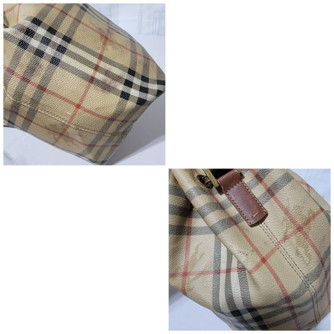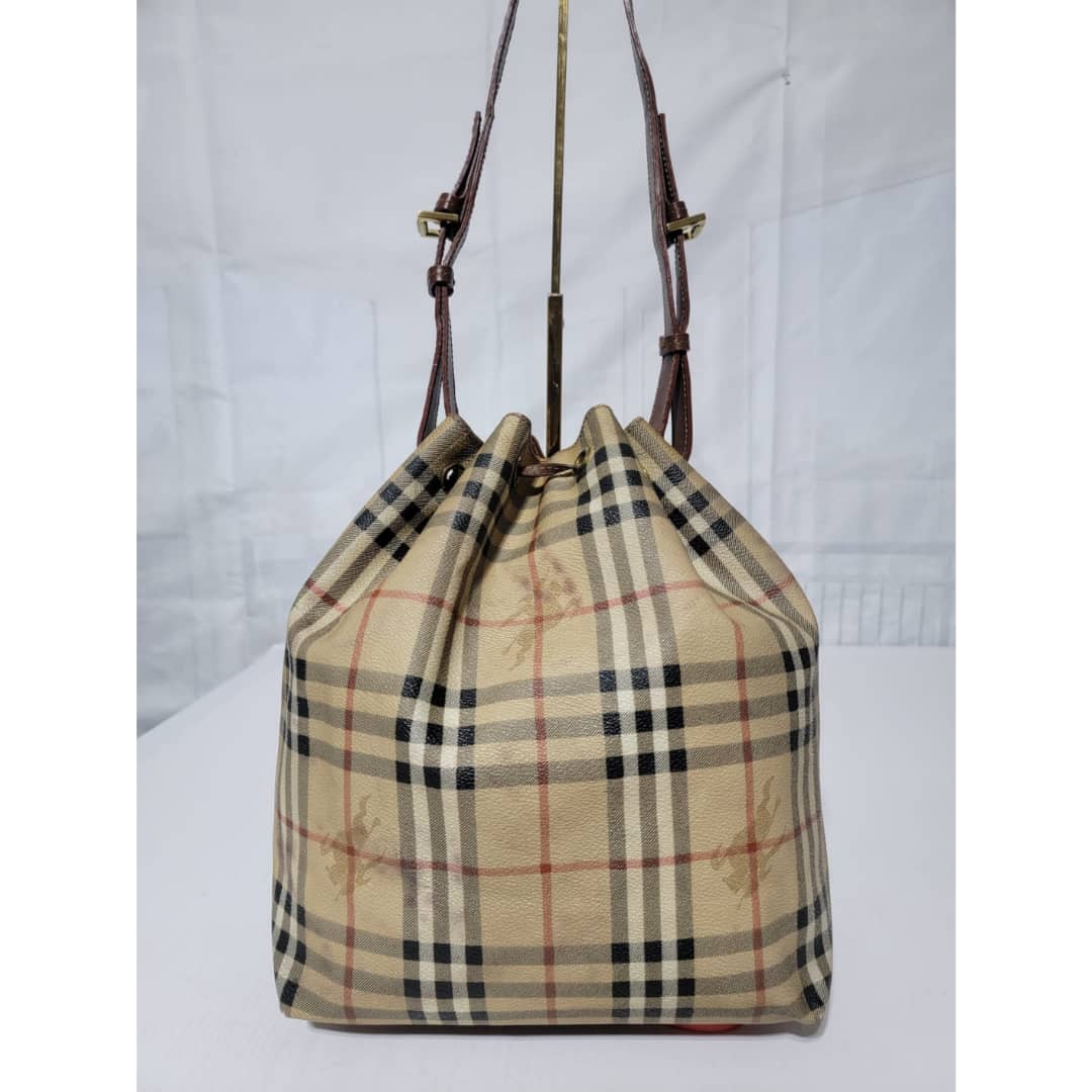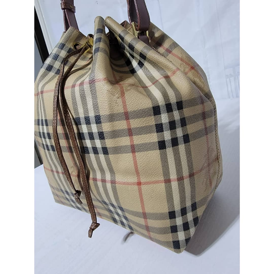 This authentic BURBERRY Vintage Drawstring Bucket Bag is in it’s good pre-owned condition. The exterior canvas is clean and beautiful. The back exterior shows little color transfer (Kindly look at pictures above). Base edges shows light scratches. Interior is clean. The strap handle is adjustable.