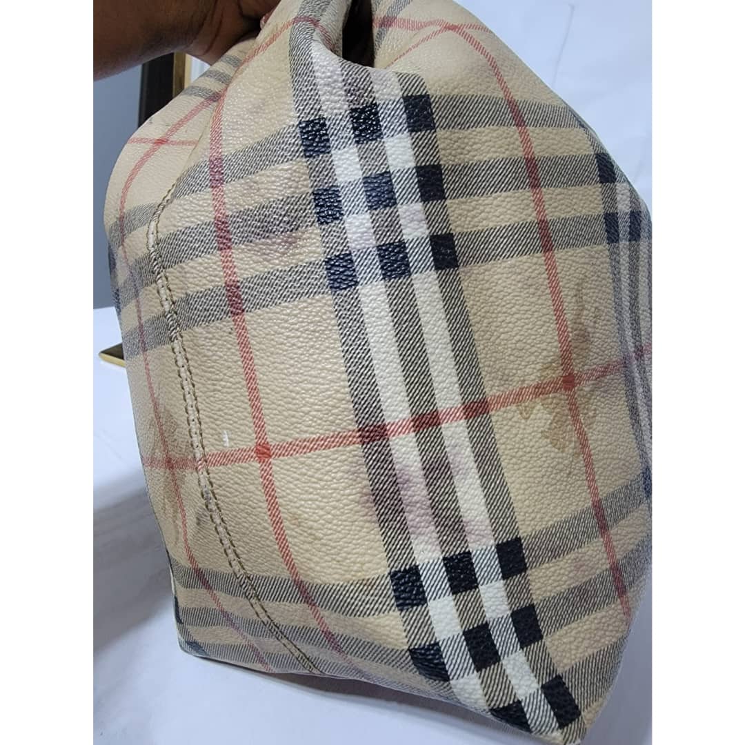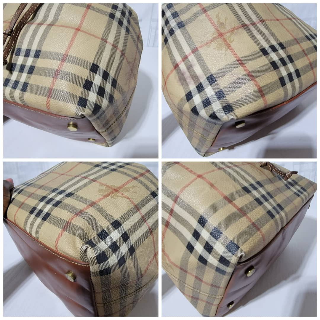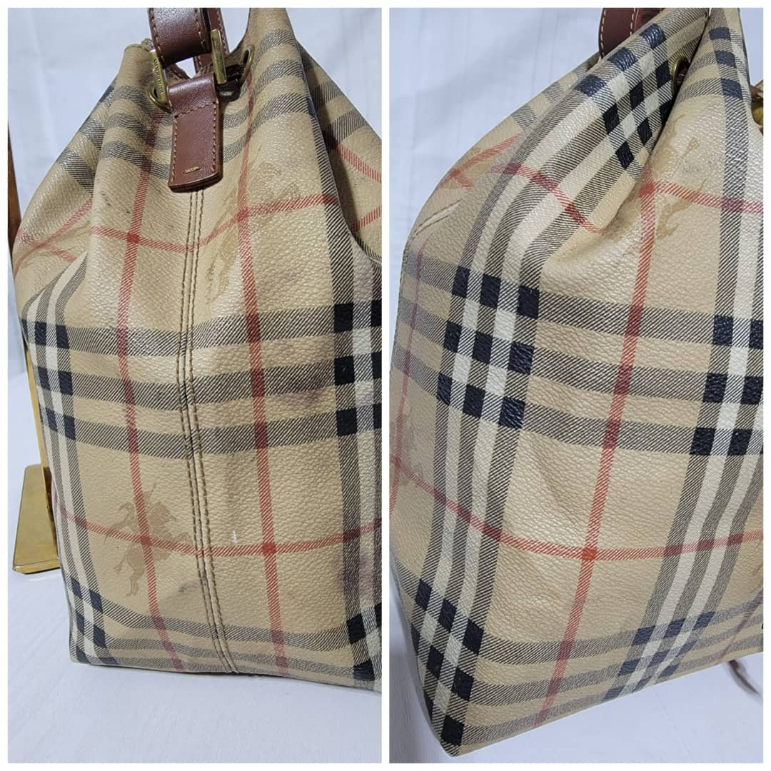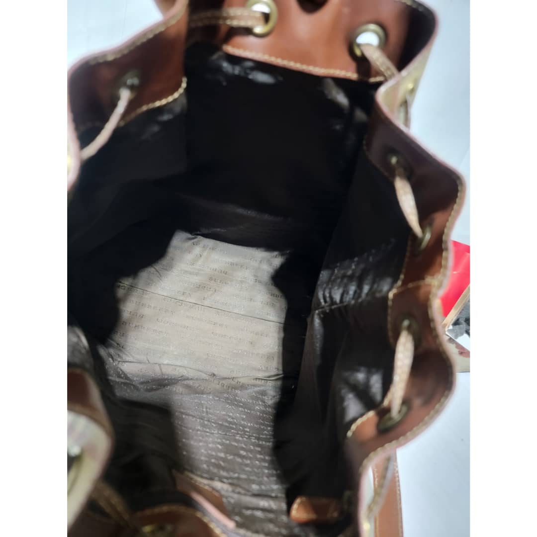 This authentic BURBERRY Vintage Drawstring Bucket Bag is in it’s good pre-owned condition. The exterior canvas is clean and beautiful. The back exterior shows little color transfer (Kindly look at pictures above). Base edges shows light scratches. Interior is clean. The strap handle is adjustable.