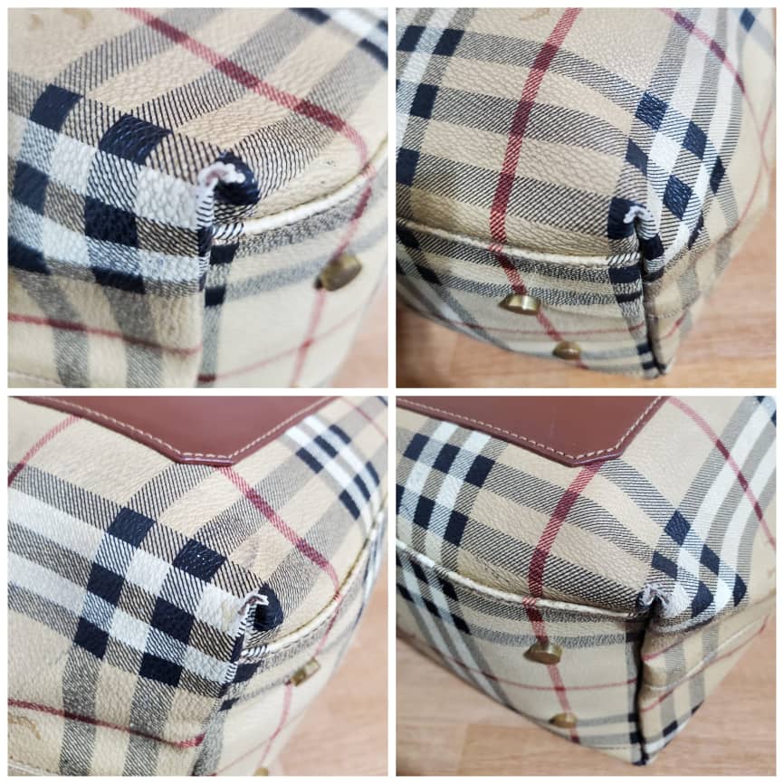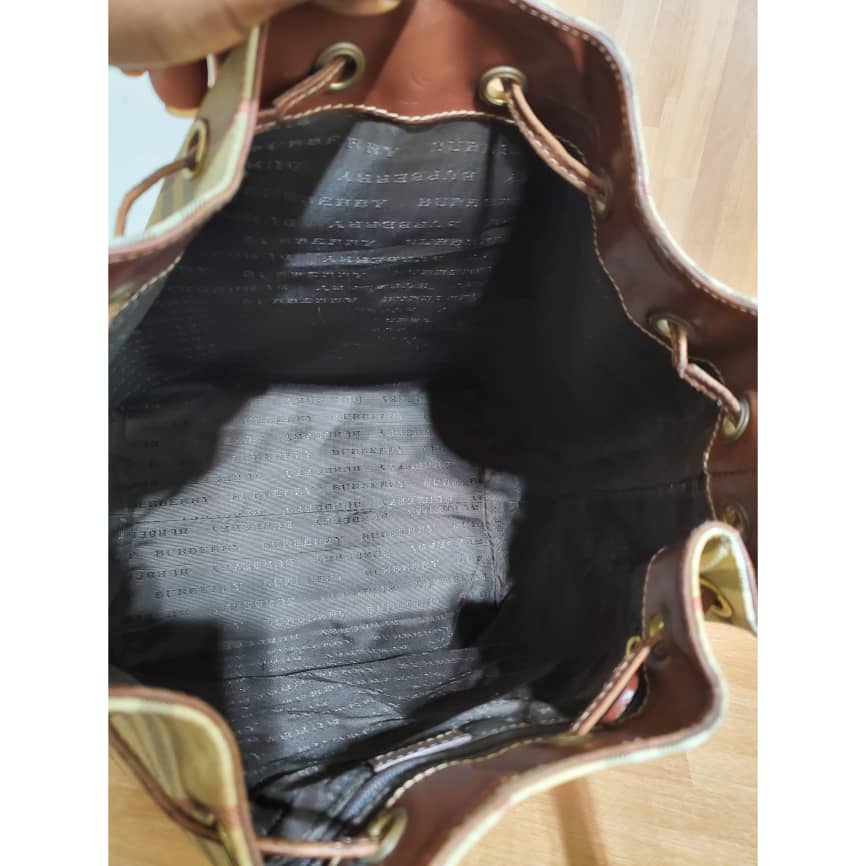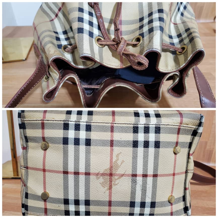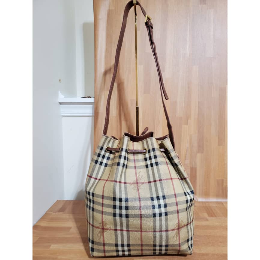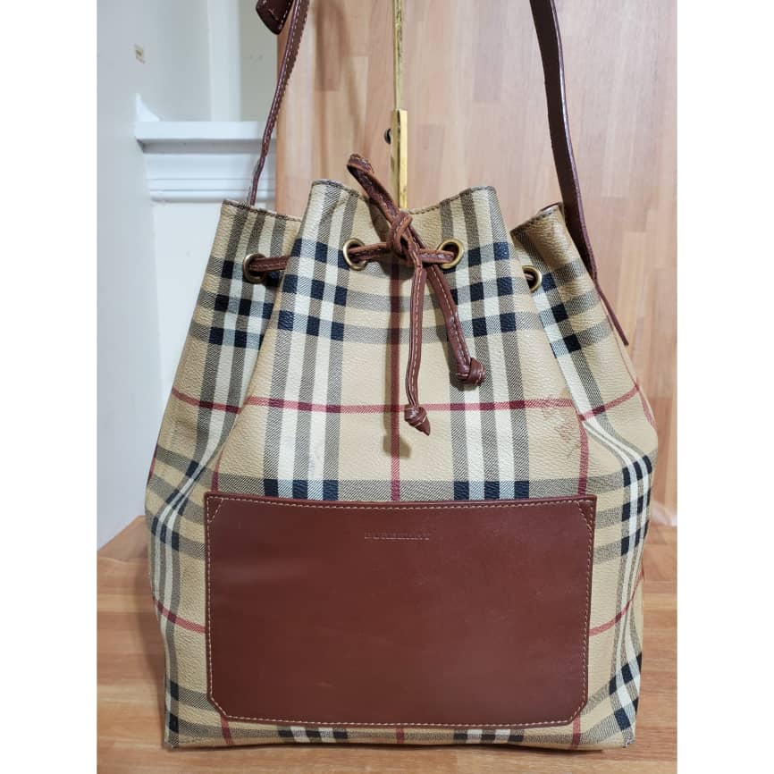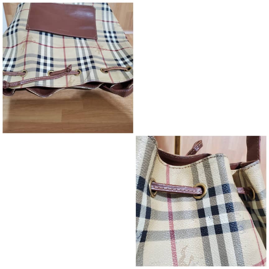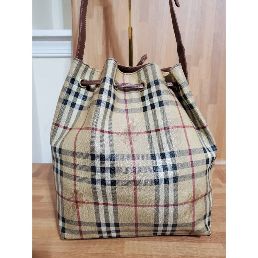 This authentic Burberry Vintage Haymarket Check Bucket Bag is in it’s pre-owned condition.has sign of use. The exterior coated canvas is clean. The base edges shows scuffing . The interior is clean.