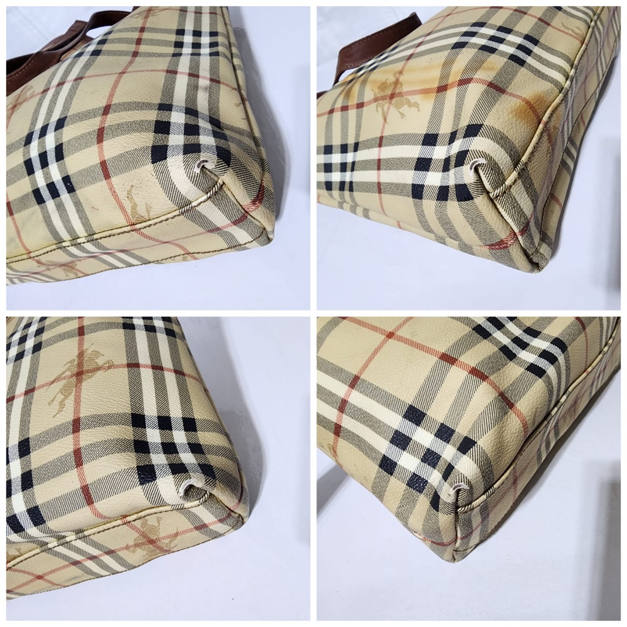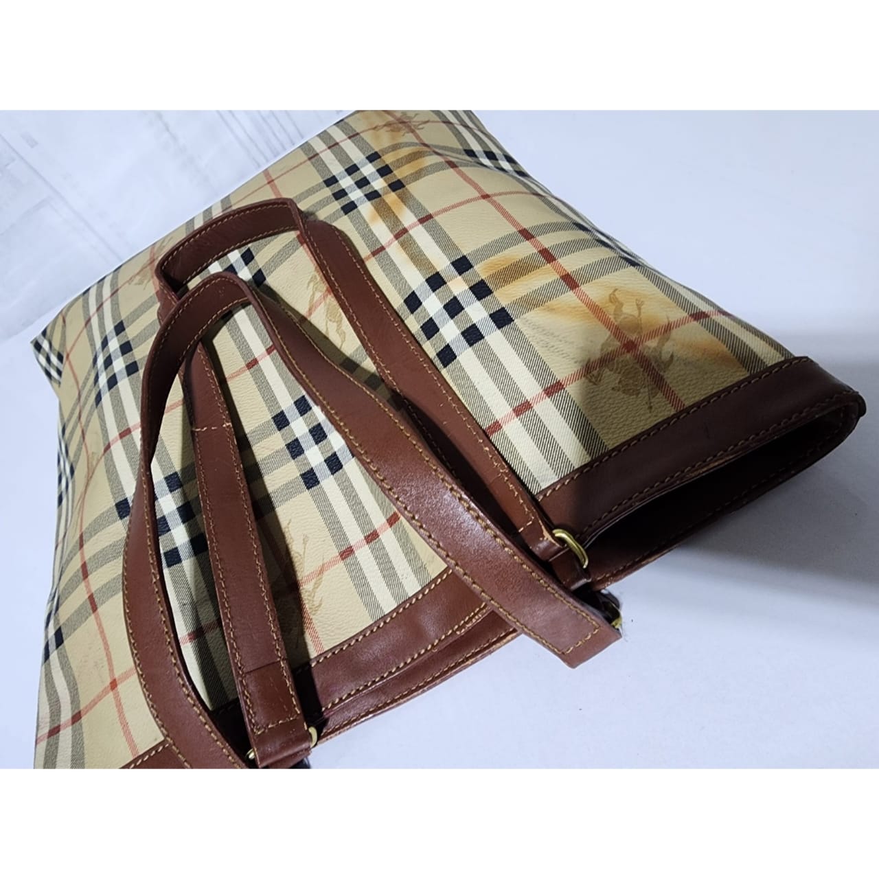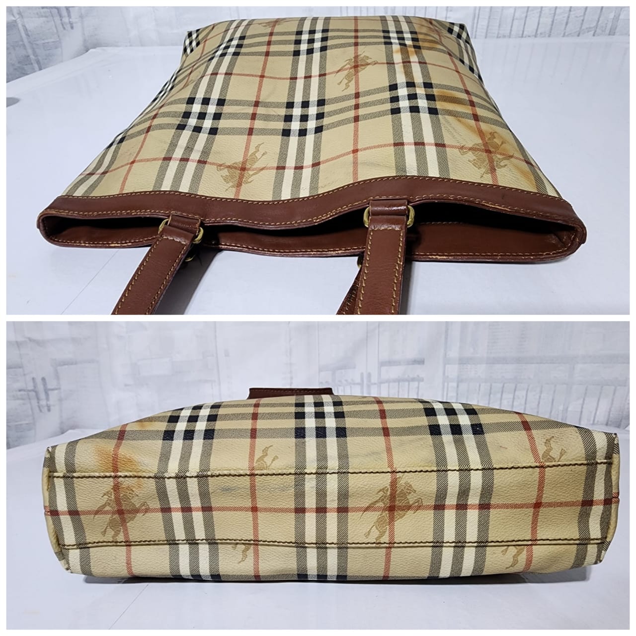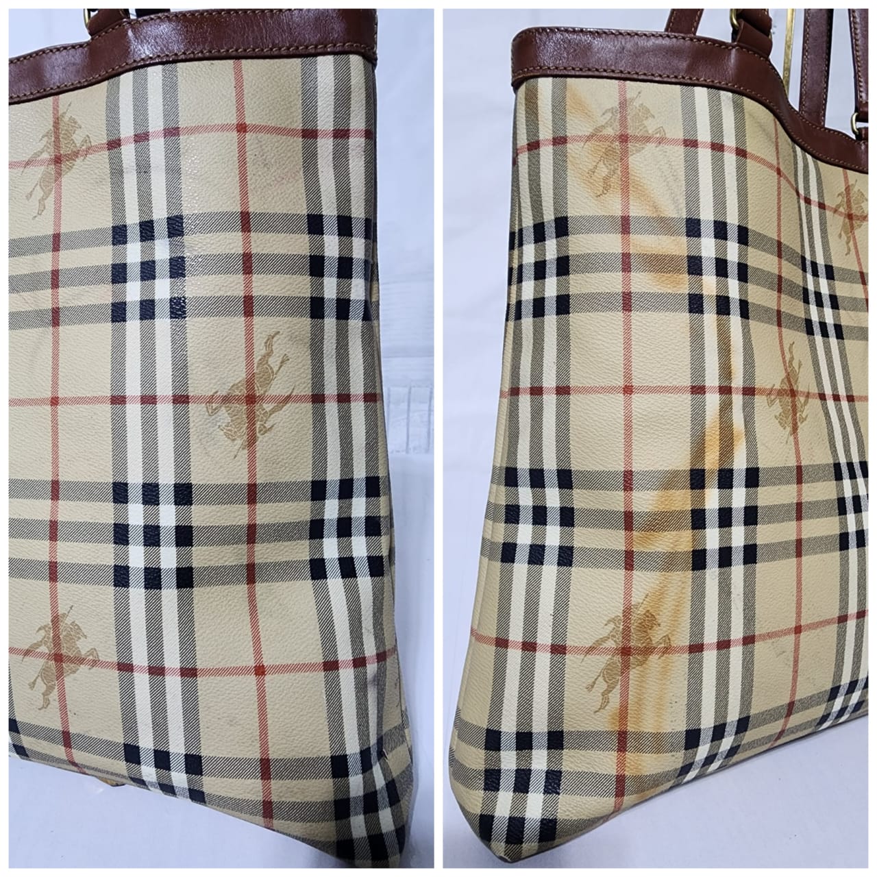 This authentic Burberry Vintage Tote is in it’s pre-owned condition. The exterior shows sign of stains on the exterior. Interior is clean. Base edges shows scuffing.