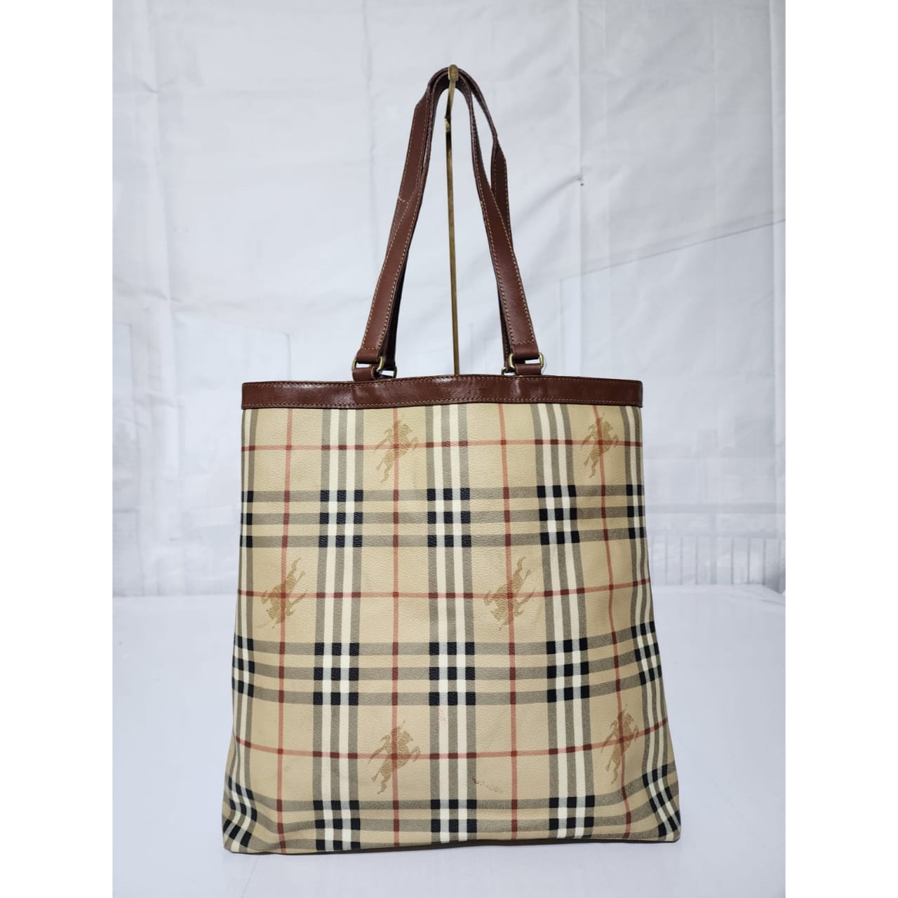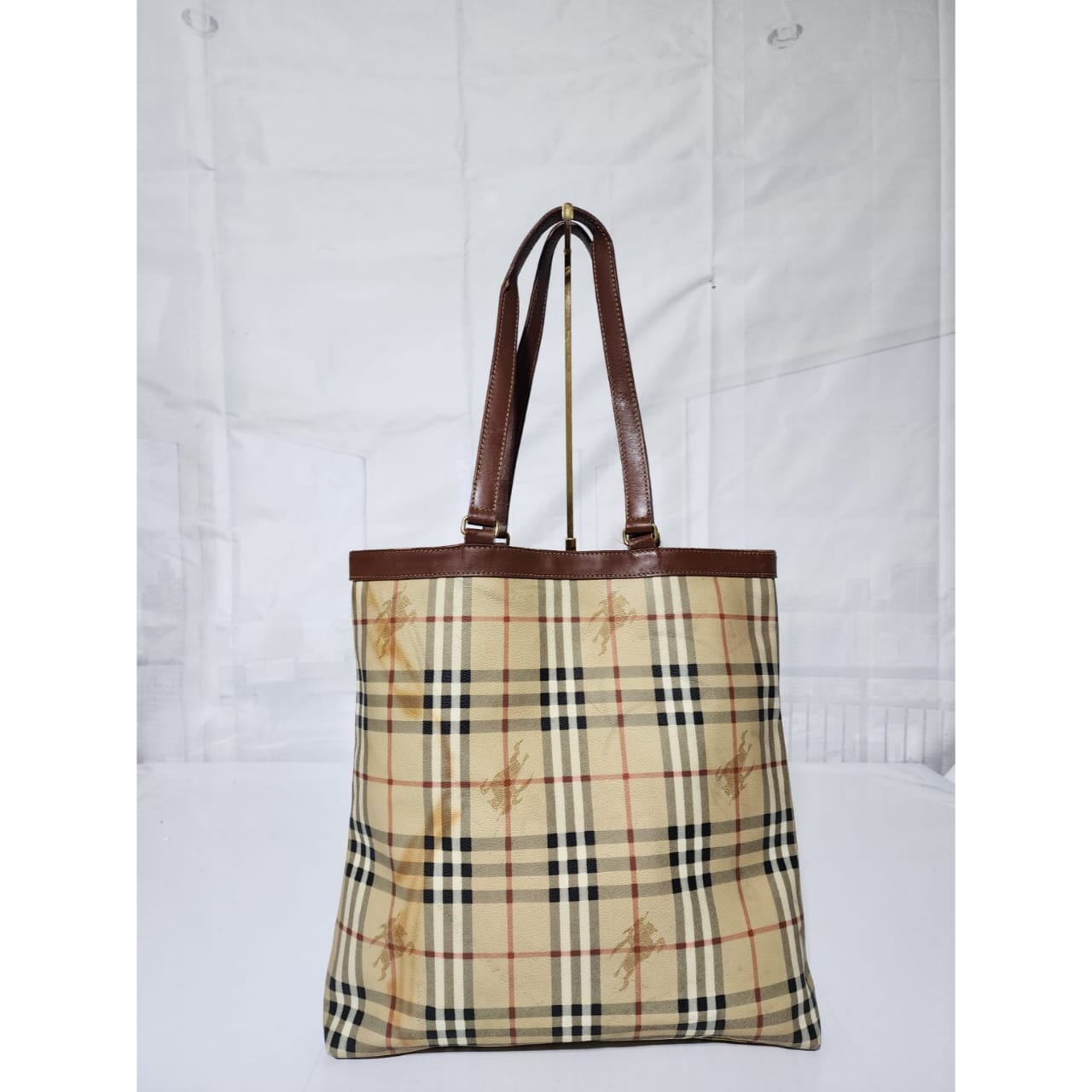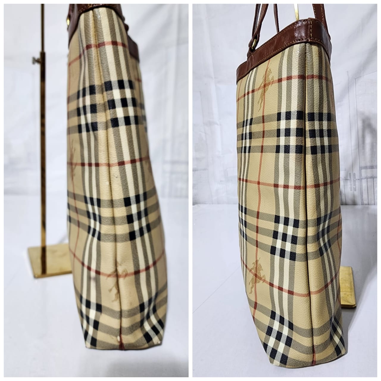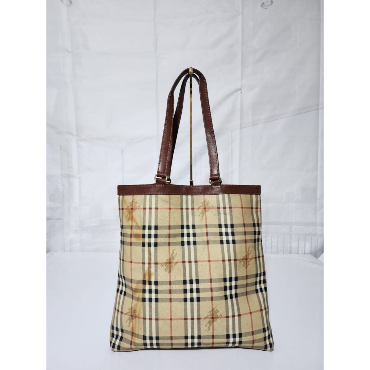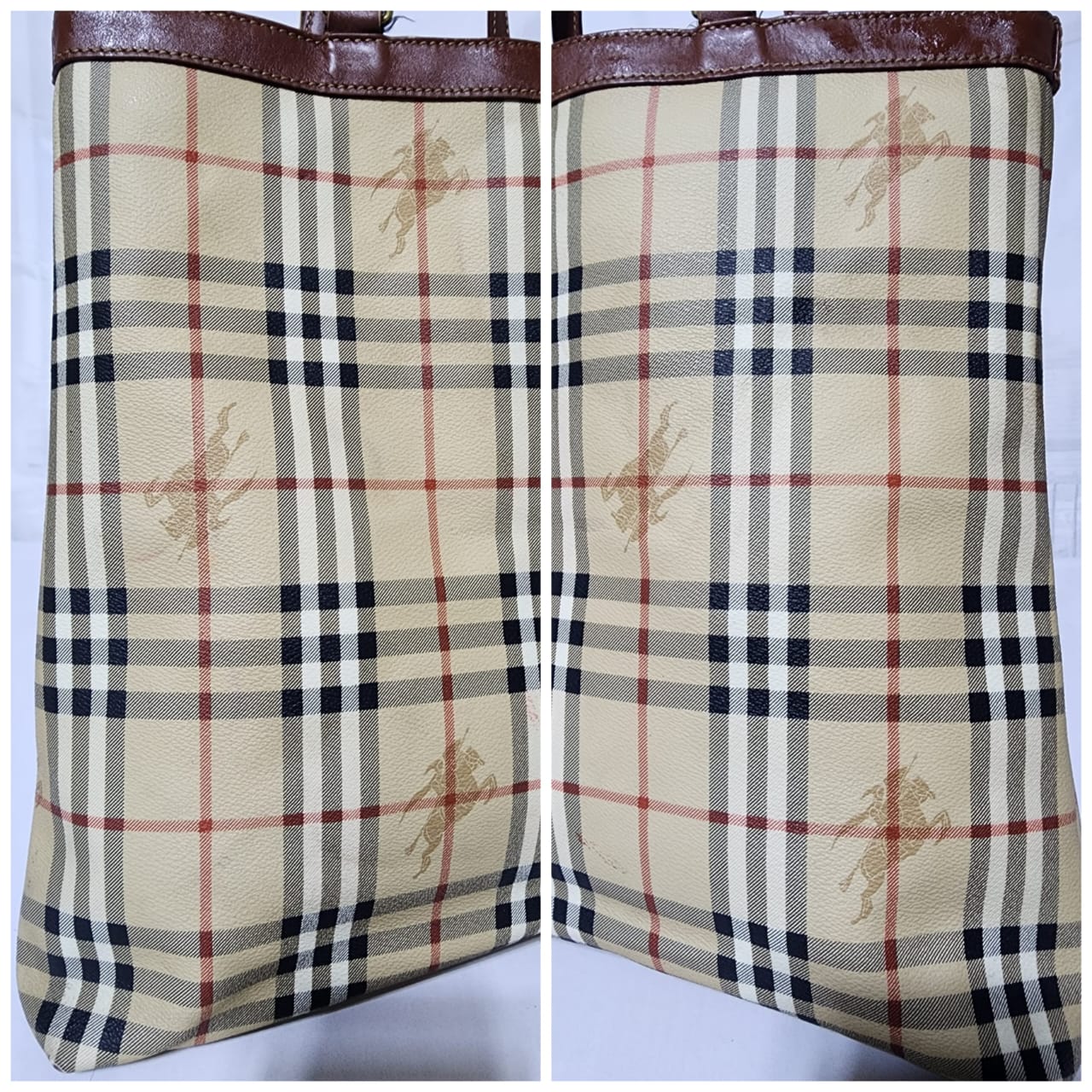 This authentic Burberry Vintage Tote is in it’s pre-owned condition. The exterior shows sign of stains on the exterior. Interior is clean. Base edges shows scuffing.