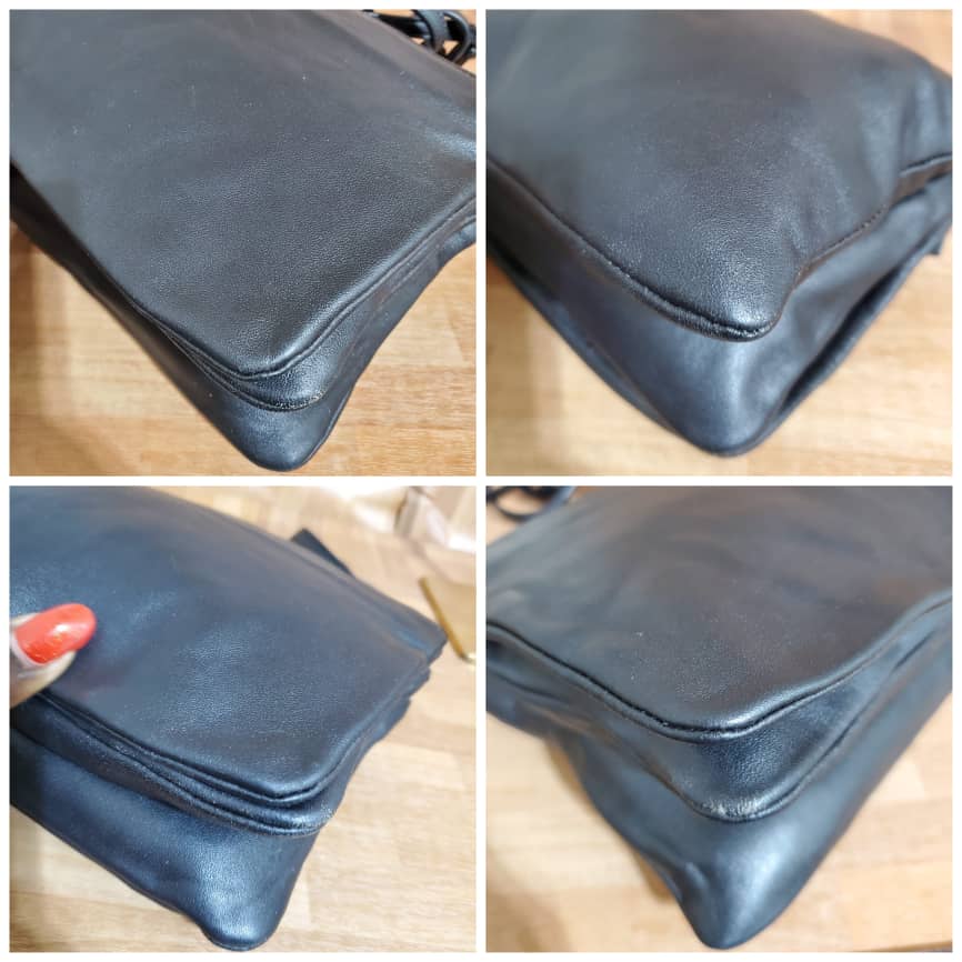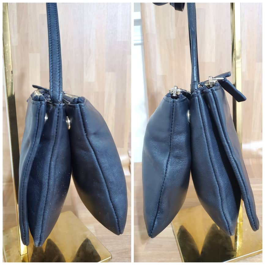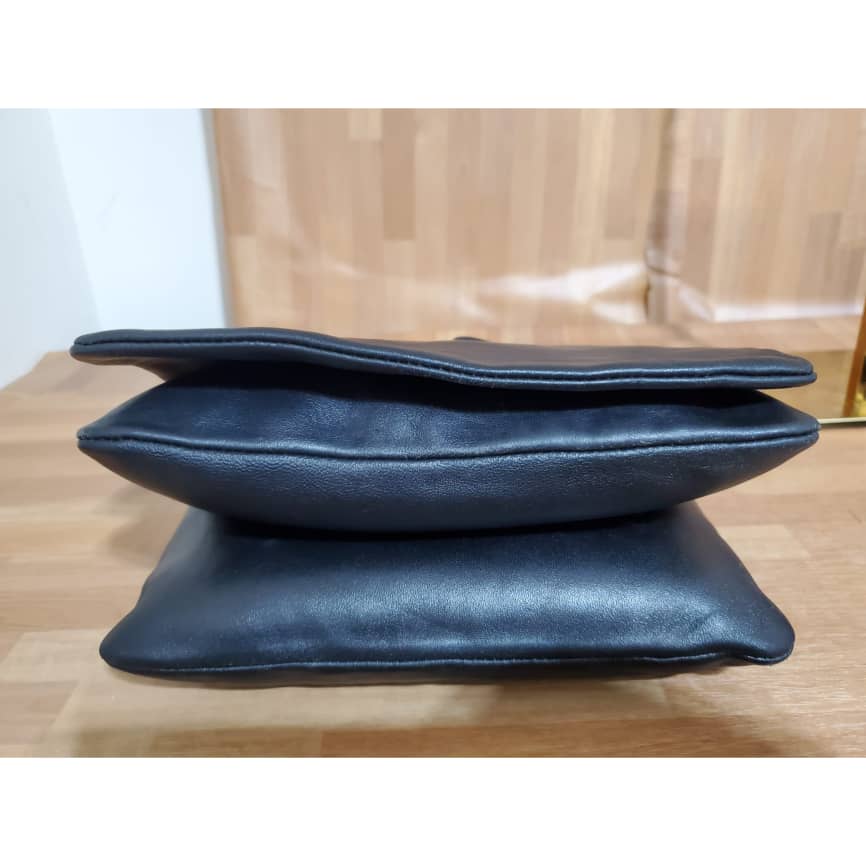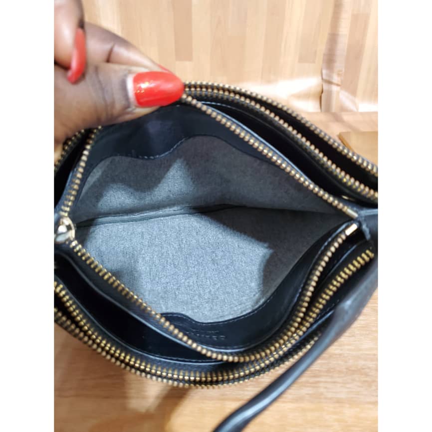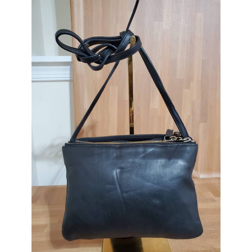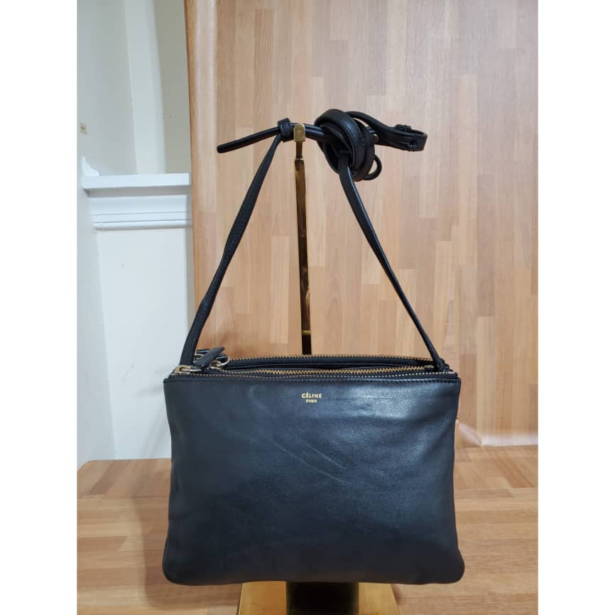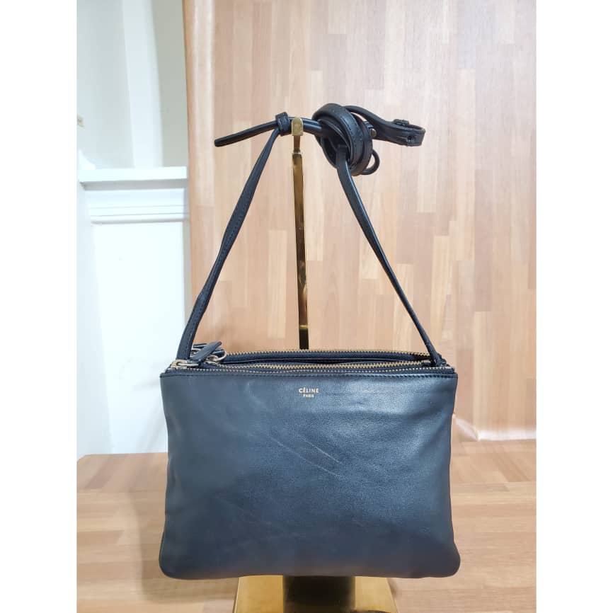 Black Lambskin Leather Trio Small Crossbody Bag is in it preowned condition. The exterior leather is clean and beautiful. Soft Lambskin leather. Interior is clean