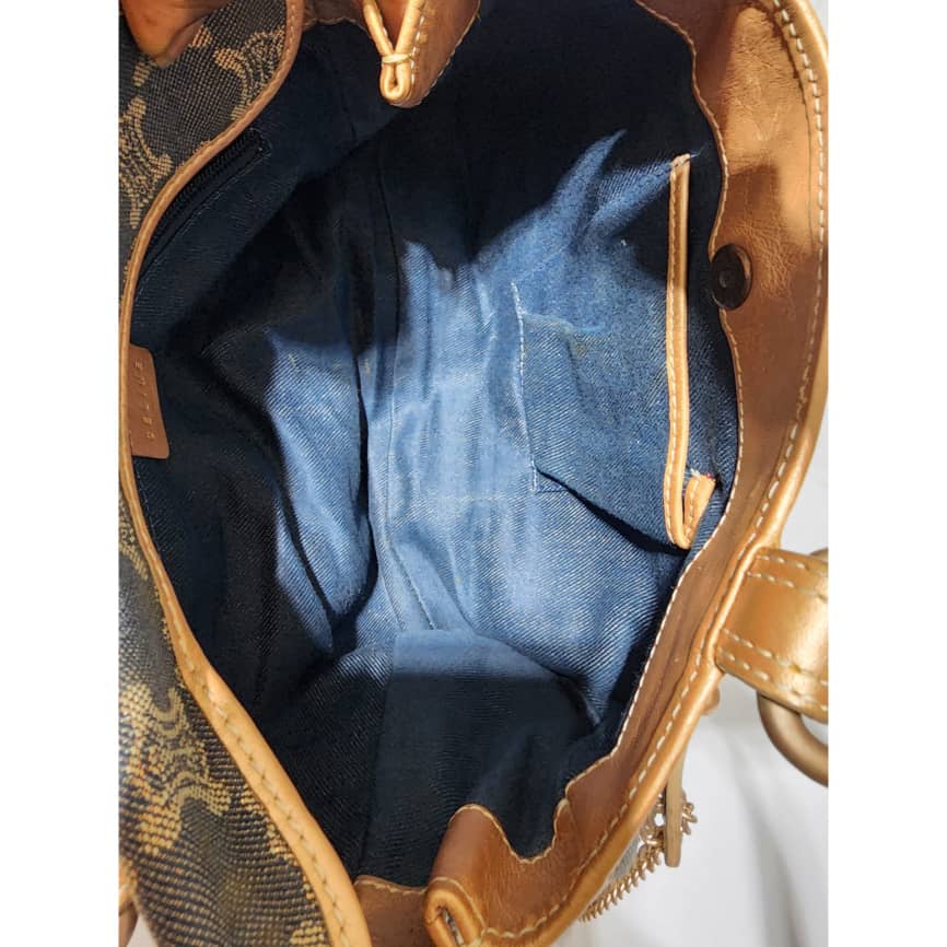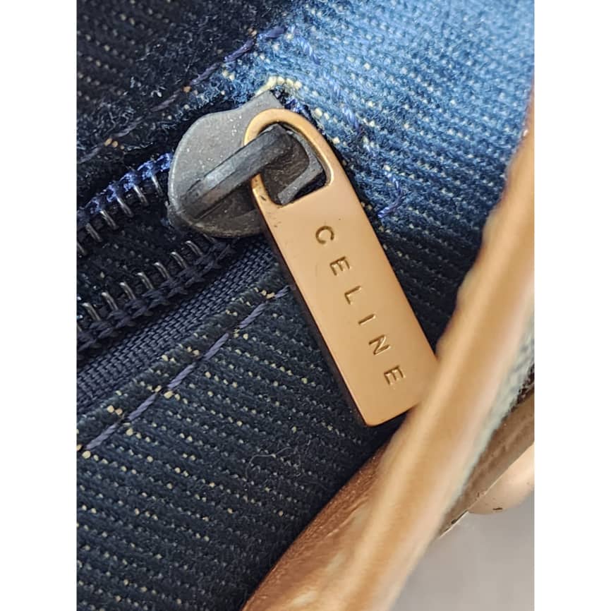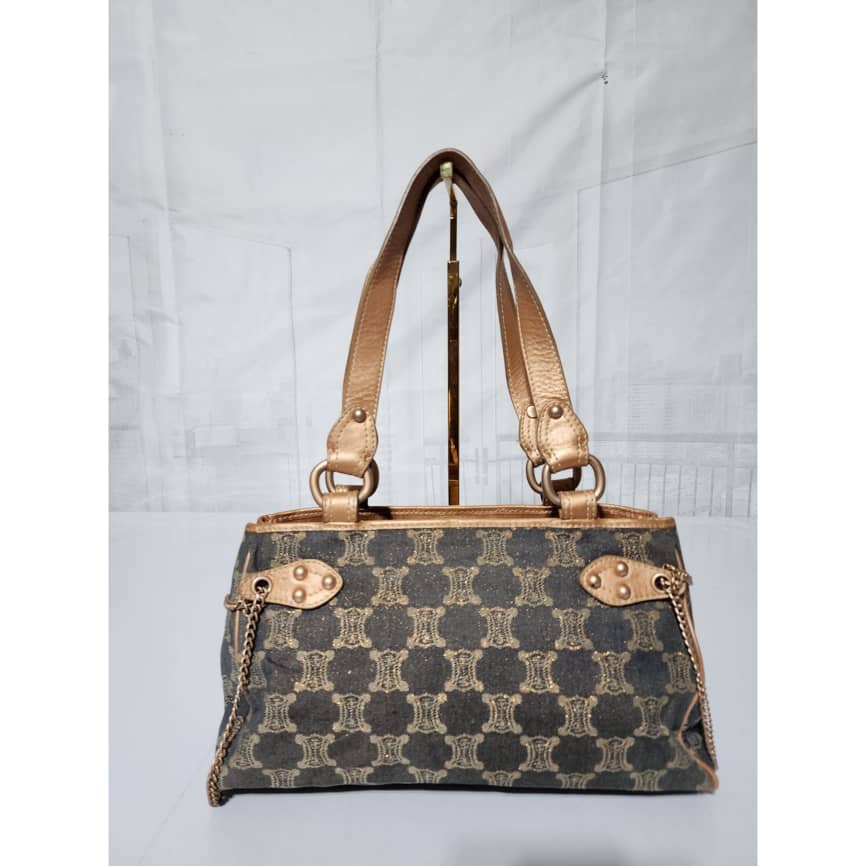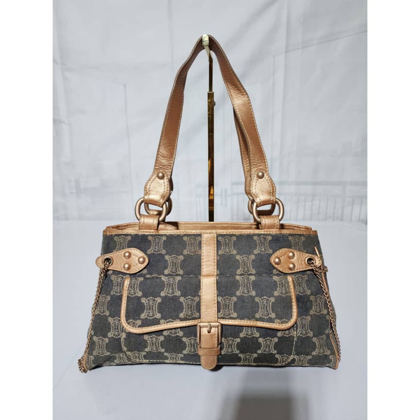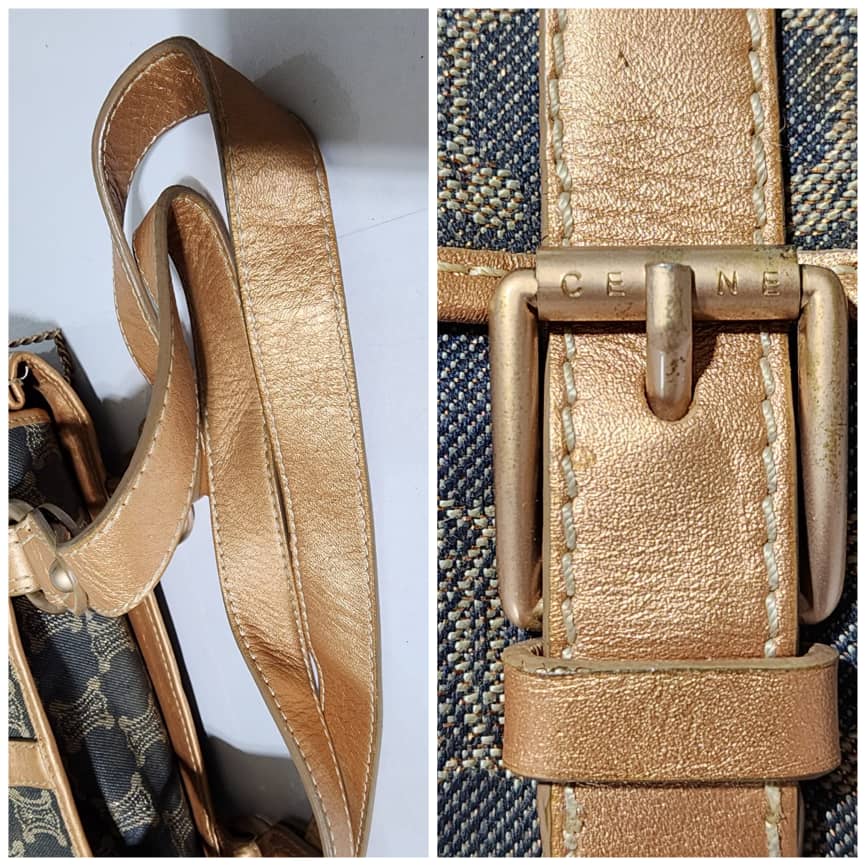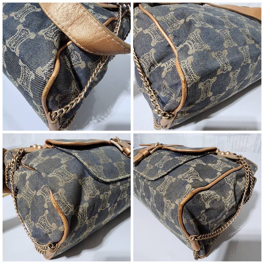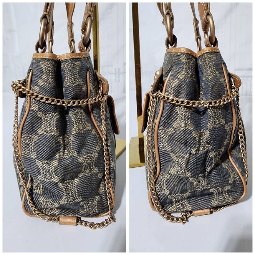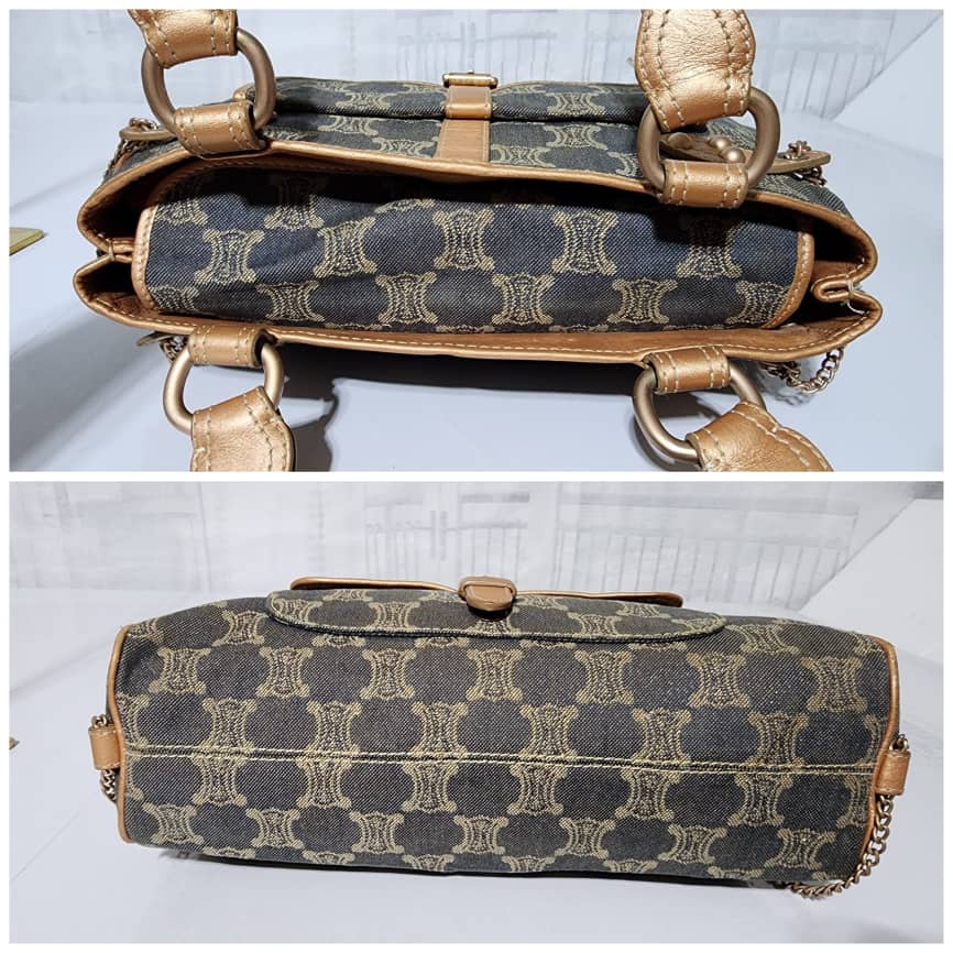 This authentic Celine Macadam Denim Handbag Brown/Gold is in it’s good pre-owned vintage condition. The exterior is clean and beautiful, shiny denim logo imprinted on the denim. Interior is clean. The edges of the bag shows scratches to it.