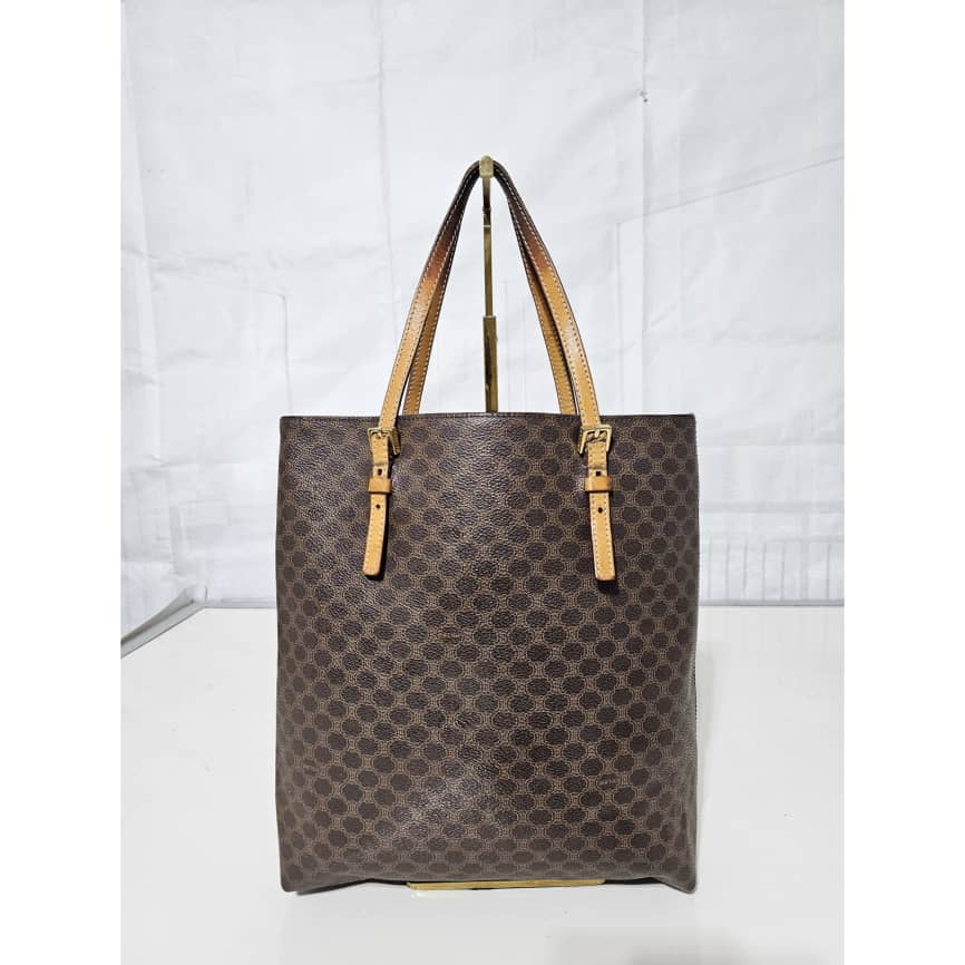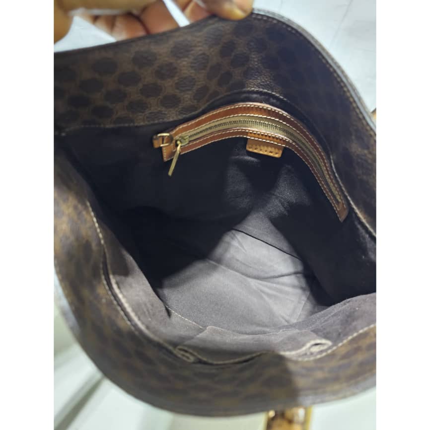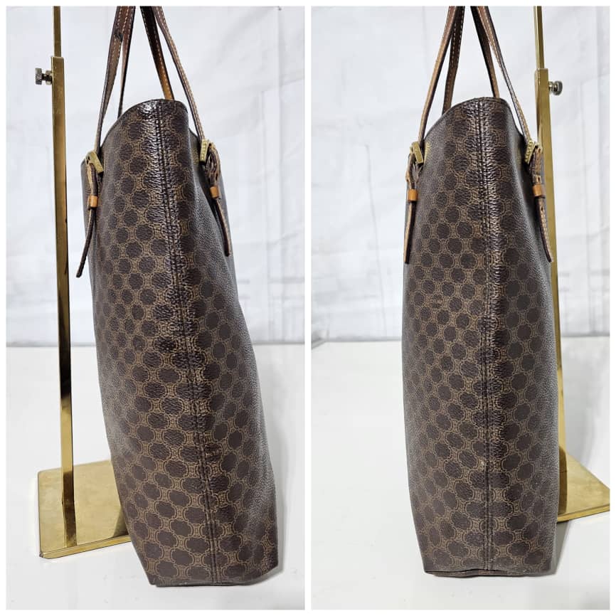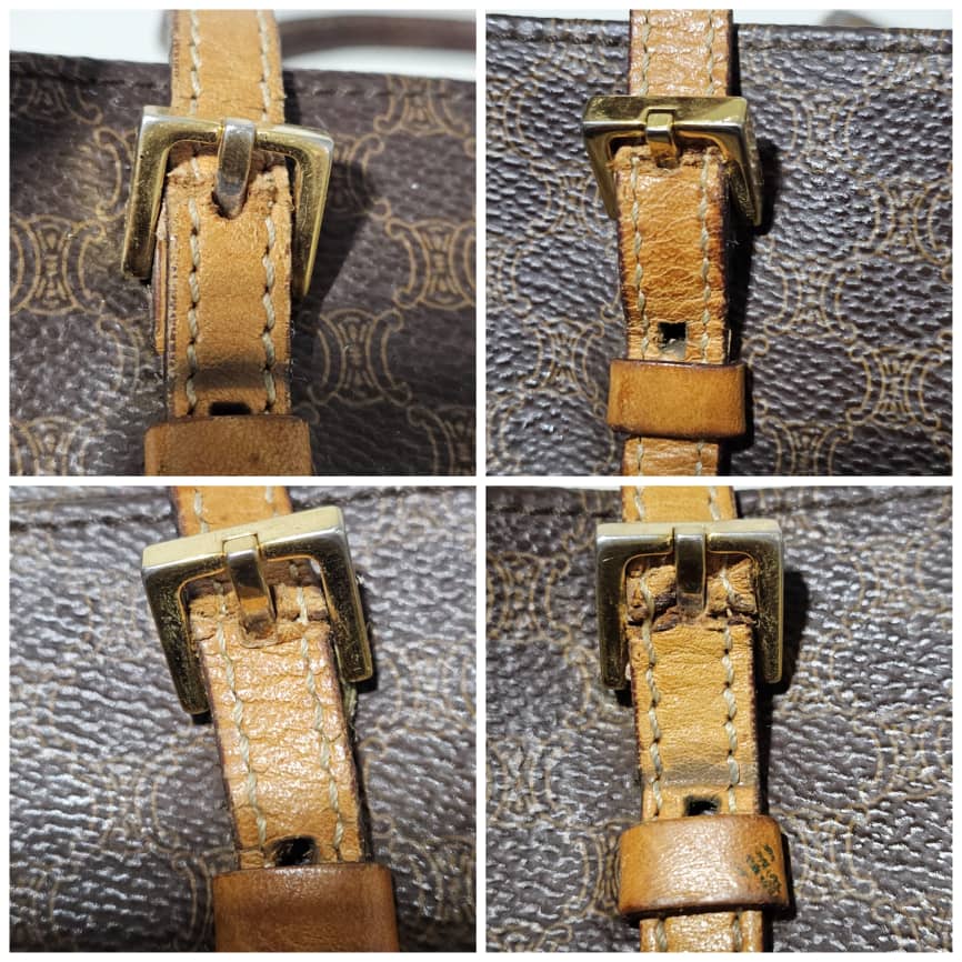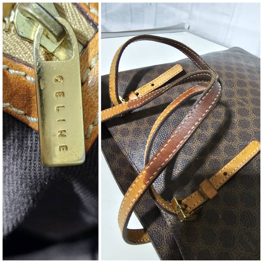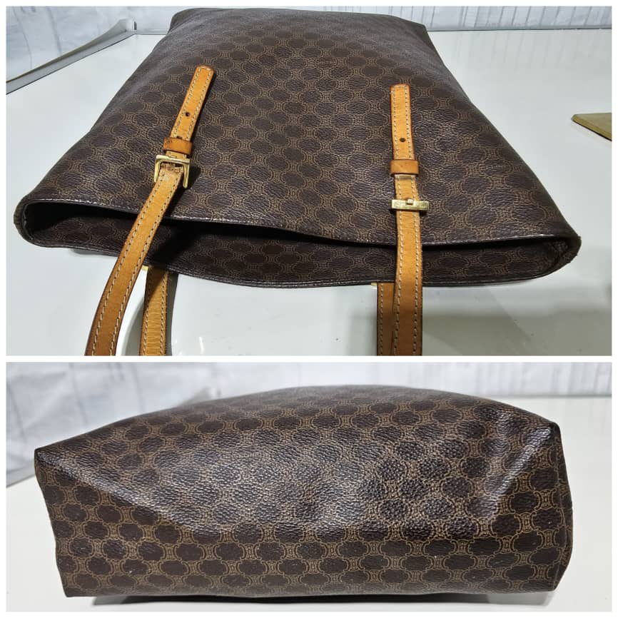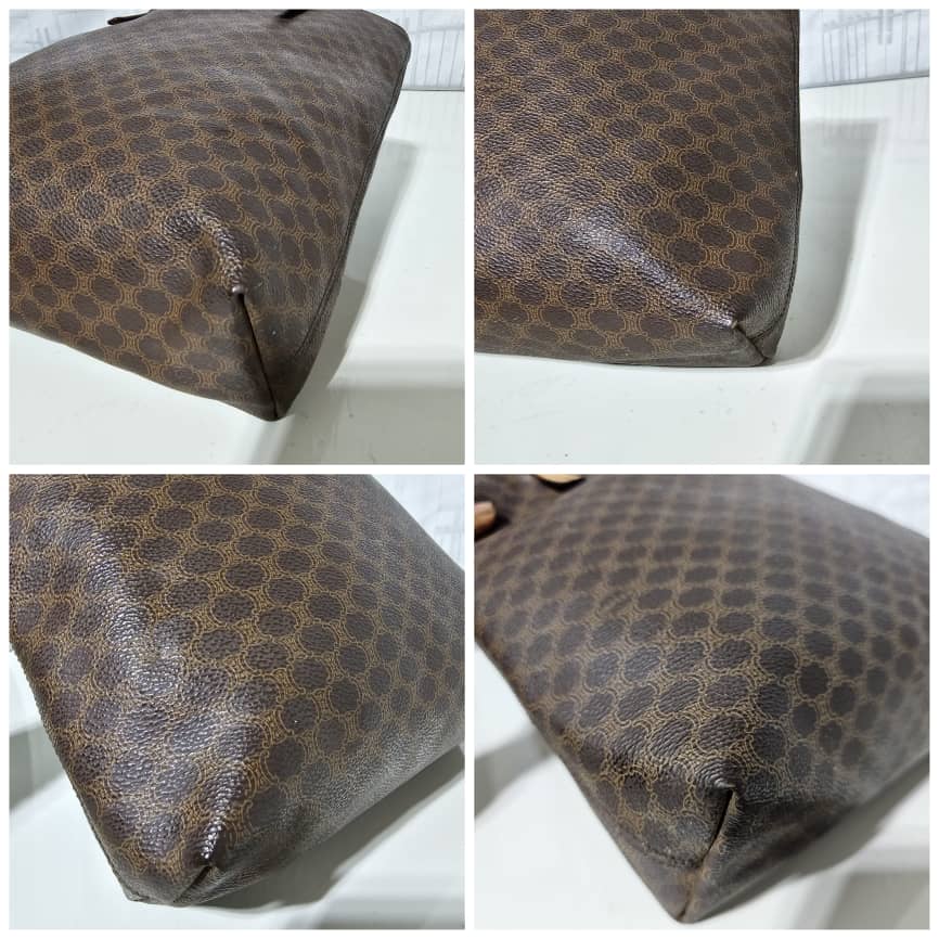 This authentic Céline Macadam Vintage Tote Bag Brown is in it’s good pre-owned condition. The exterior canvas leather is clean and beautiful. The interior is clean. The handle shows some soiling and patina wear, it shows a little bit of crack on the buckle leather (Kindly refer to pictures above). However the handle leather is very strong.