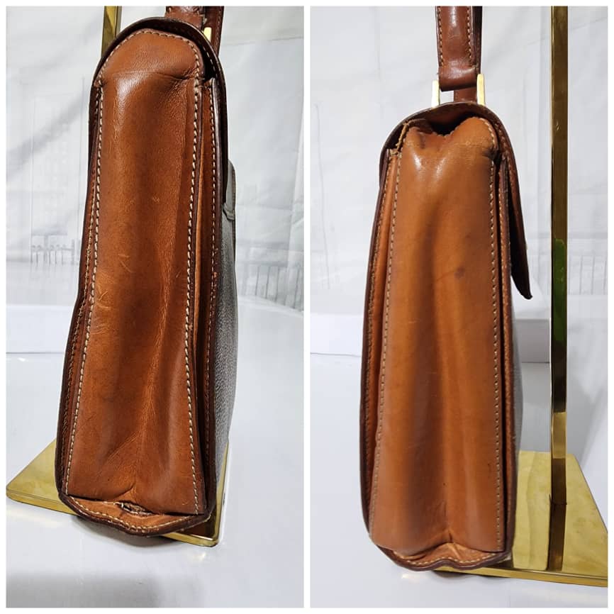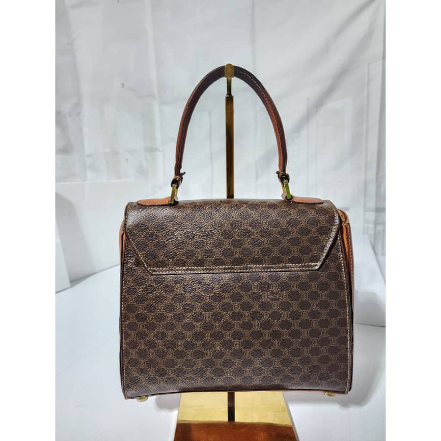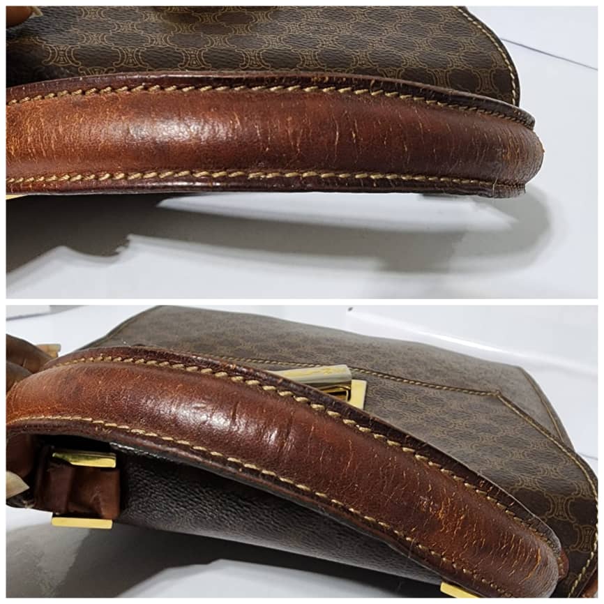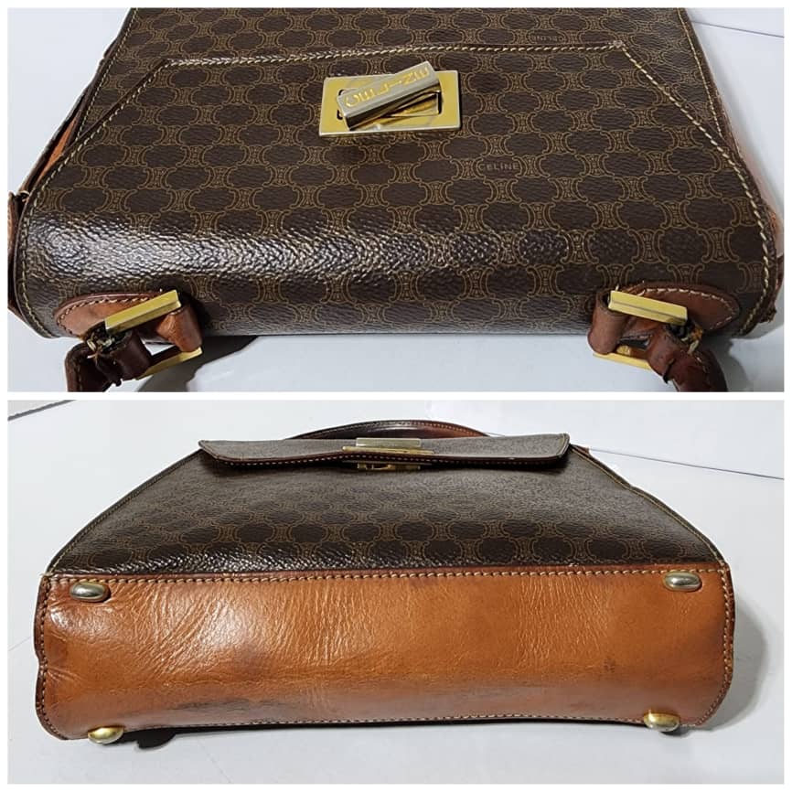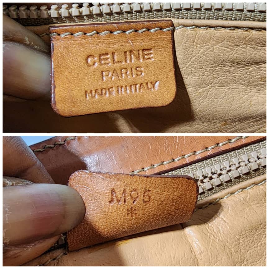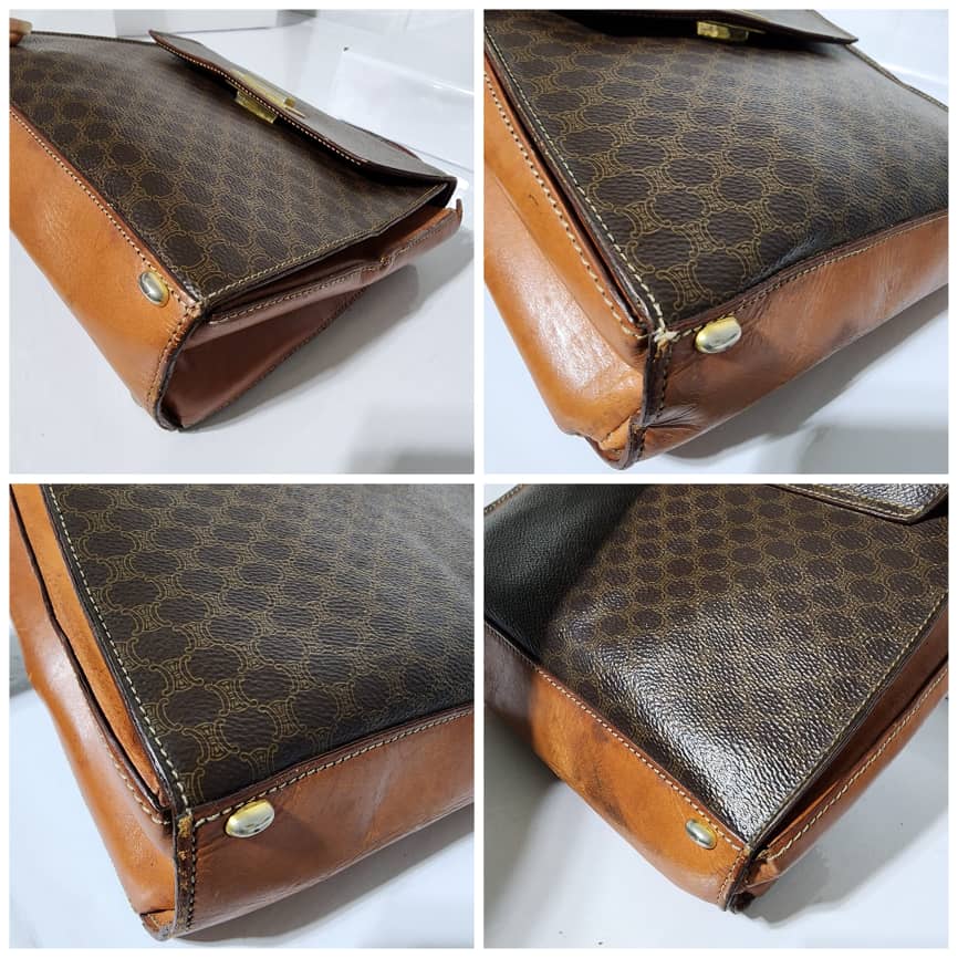 This authentic Celine Vintage Macadam Turn Lock 2WAY Top Handle Bag Brown is in it’s vintage condition. The exterior Celine canvas is clean however the vachatte leather that runs across the bag shows watermark, dryness and honey patina wear to it (Kindly look at pictures above). The interior is clean, it is in it’s vintage condition with markings. Gold hardware shows rubbing and scratches to it.