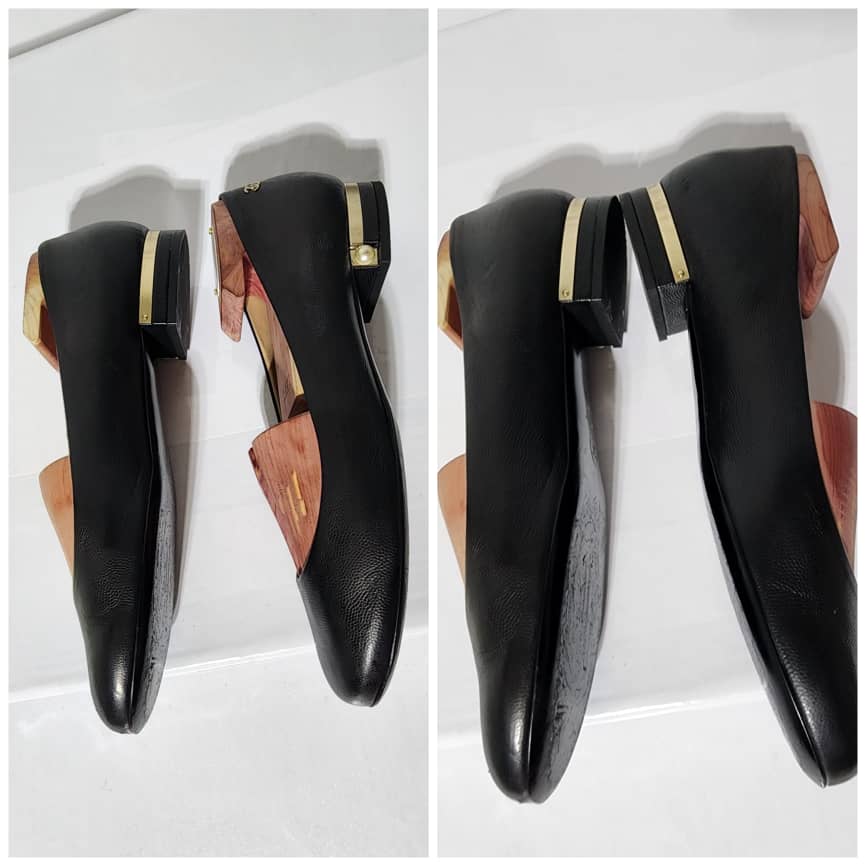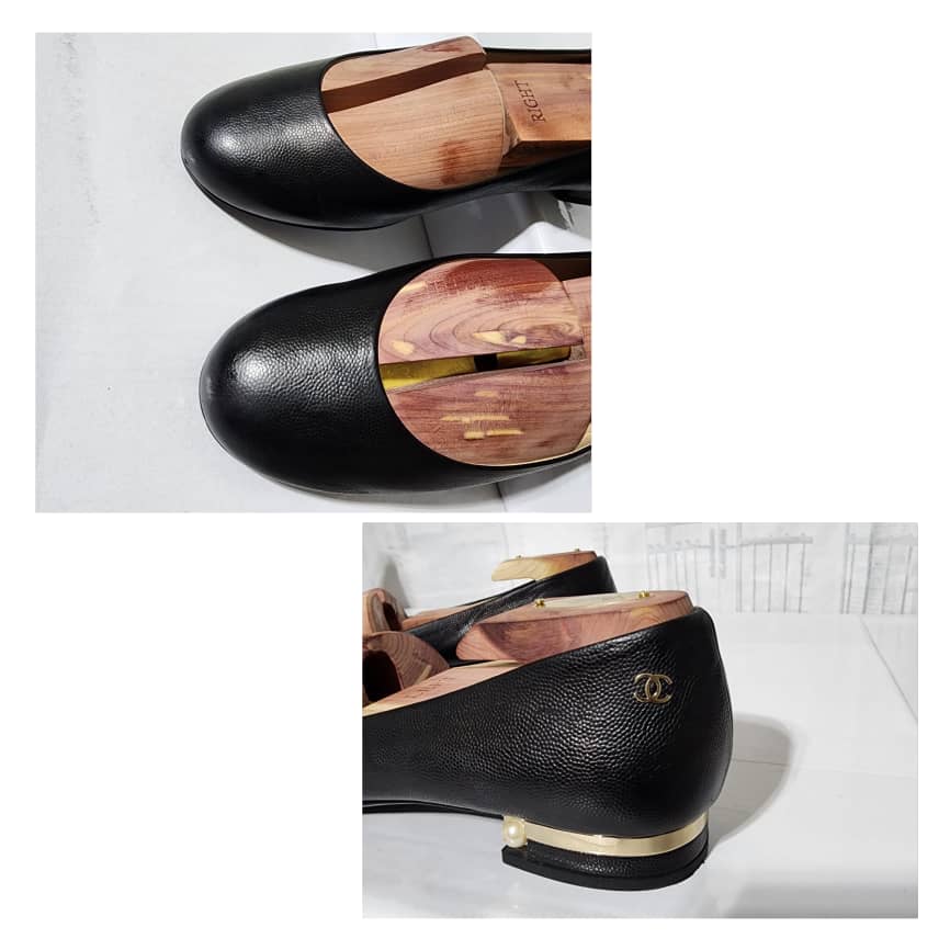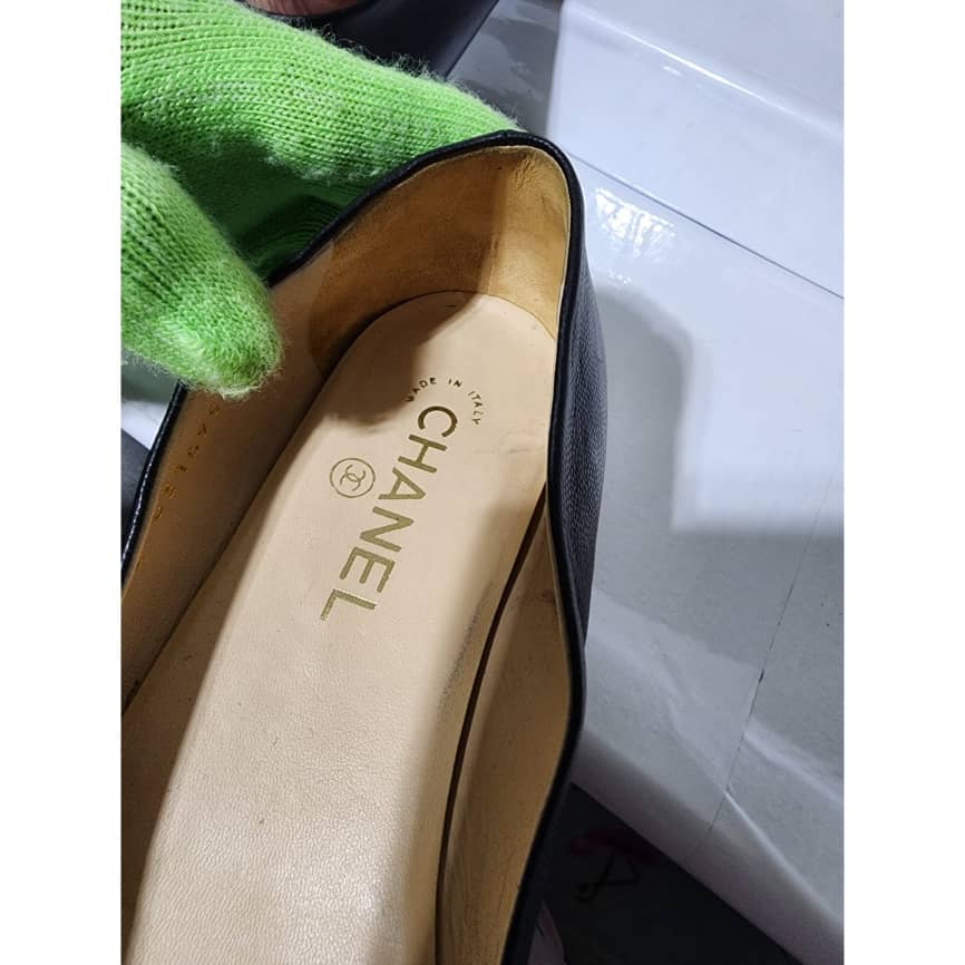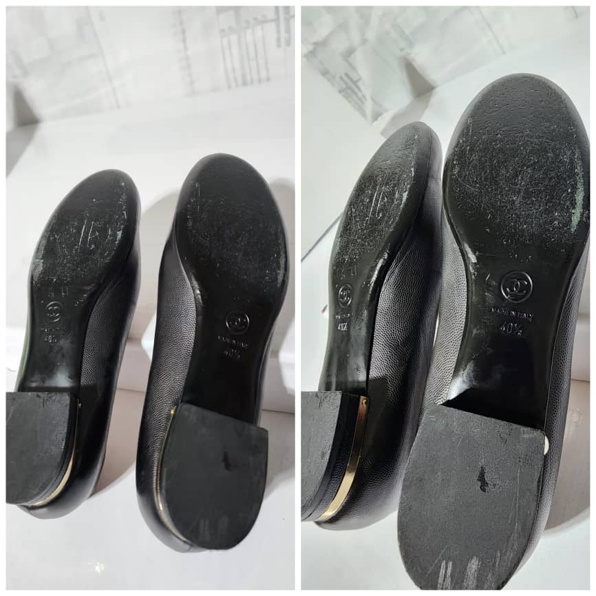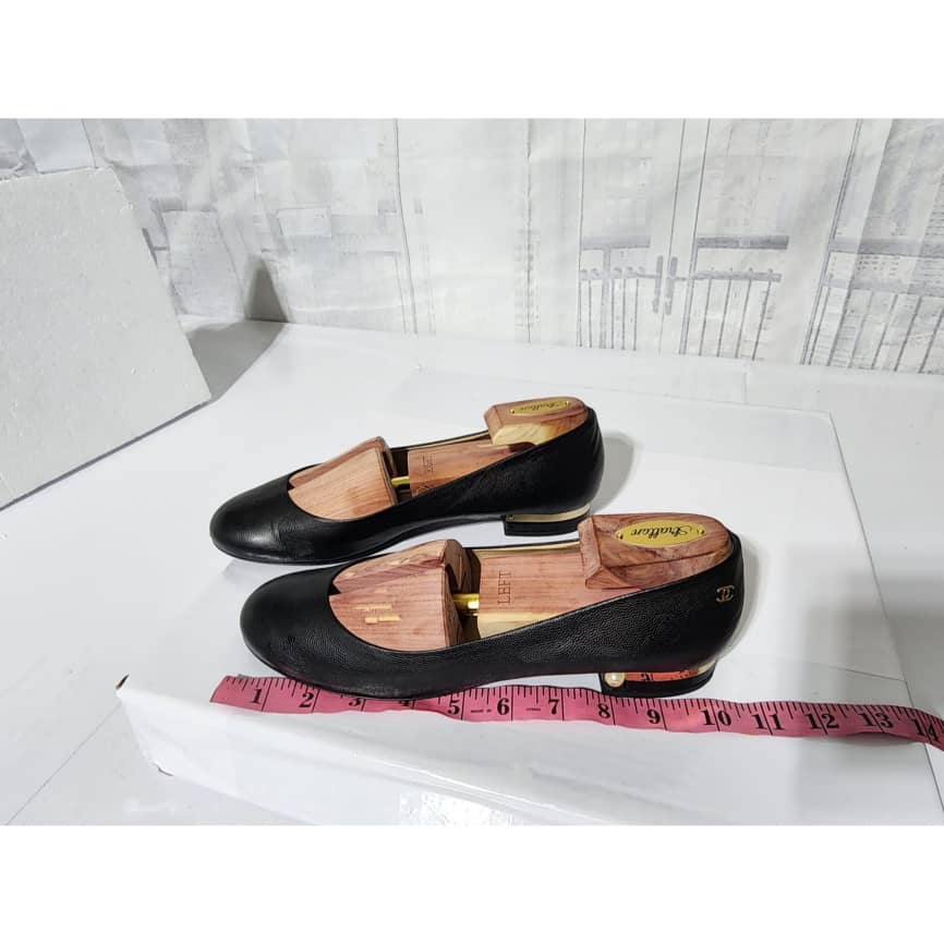 This authentic Chanel Leather Ballerina Flat Shoe Black Size 40 is in it’s good pre-owned condition. The exterior leather is clean and beautiful. Interior is clean. Beneath the shoe shows some scratches.