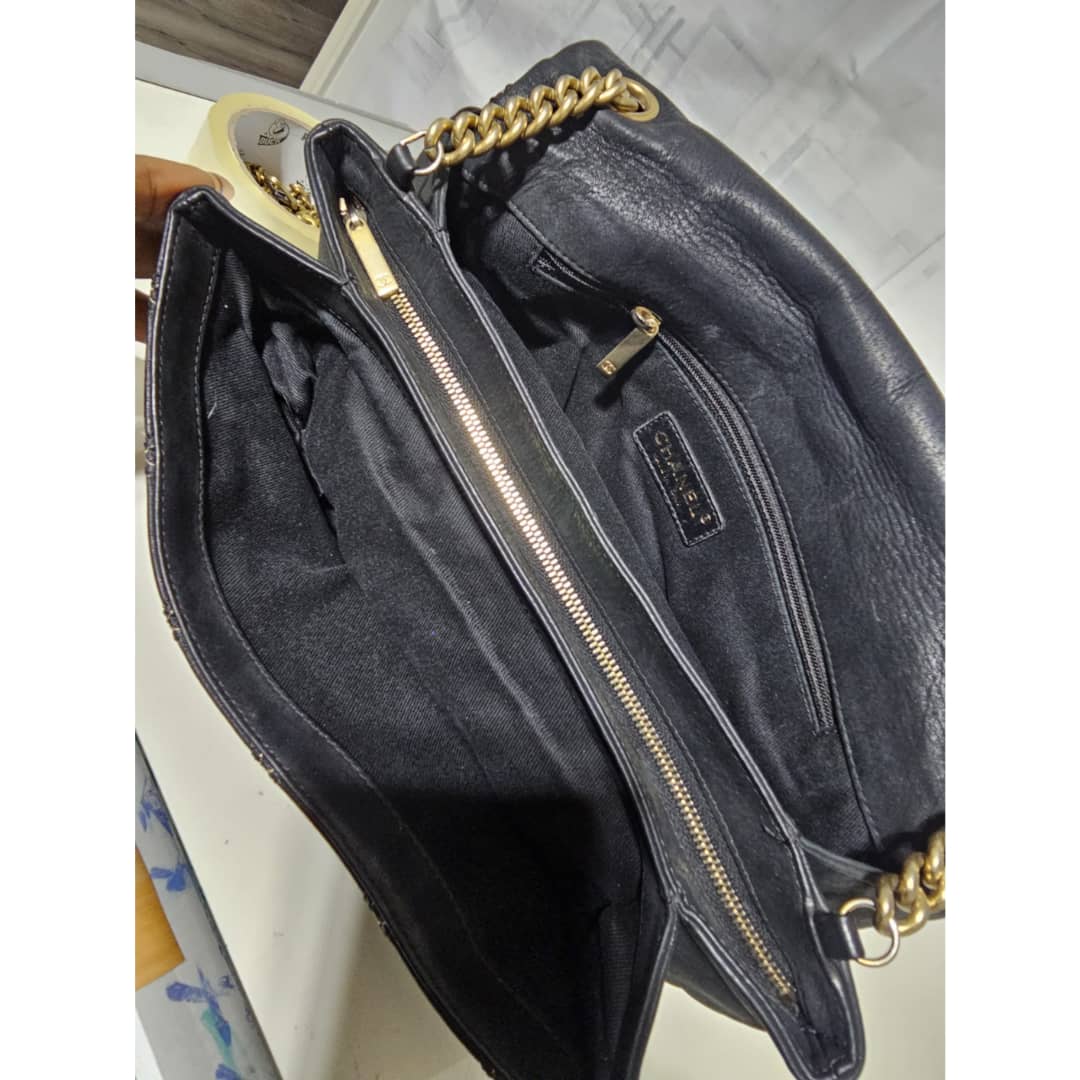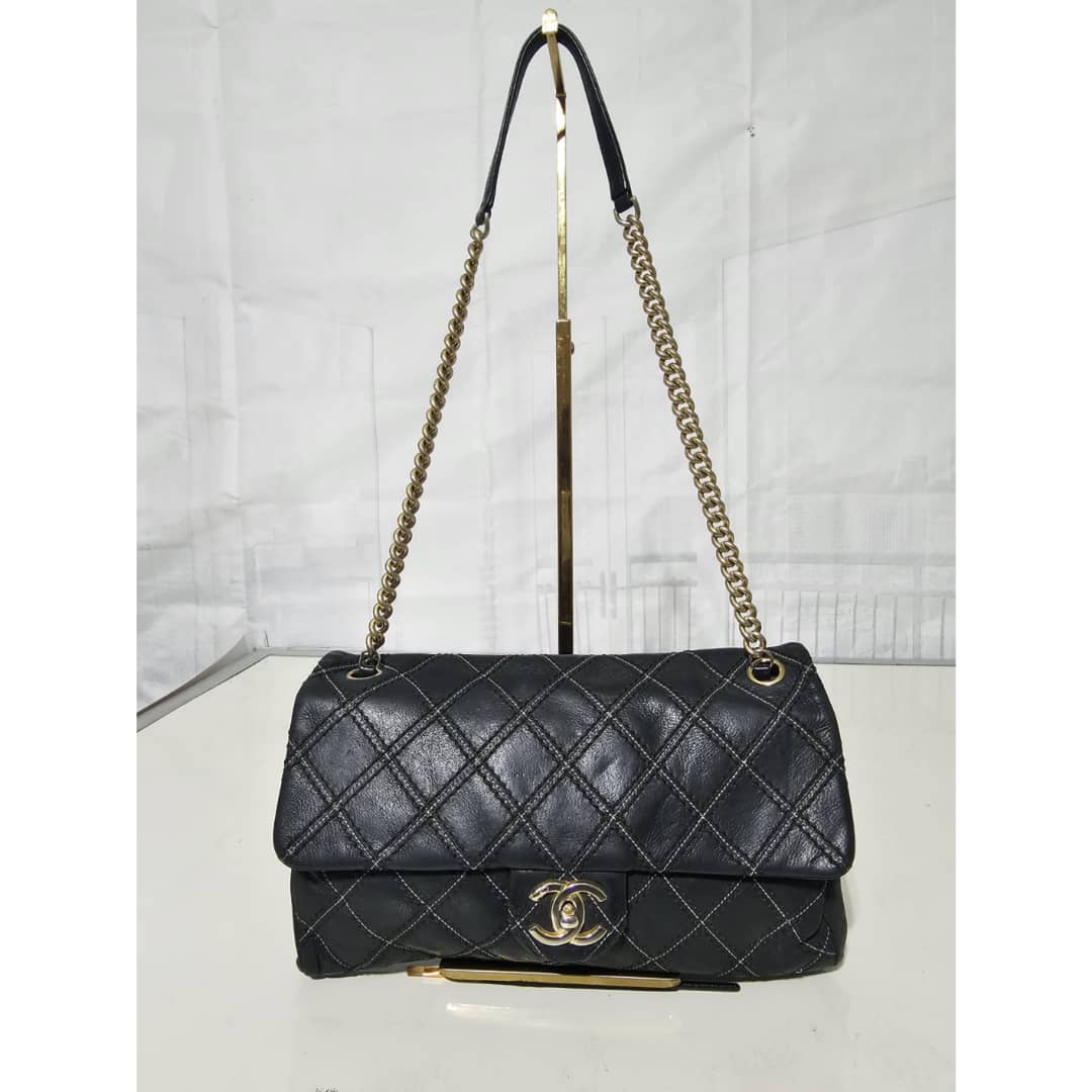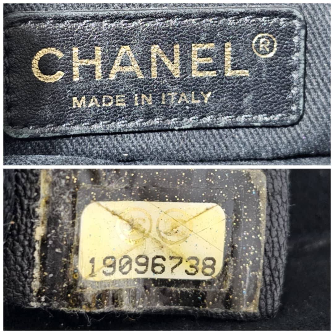 This authentic Chanel Iridescent Stitch Flap Bag Black Quilted Leather Medium handbag/ Shoulder Bag is in its good preowned condition. The exterior leather is clean and beautiful interior is clean and beautiful. Great Shoulder Bag. This Chanel Iridescent Stitch Flap Bag Quilted Leather Medium, crafted in black quilted leather, features chain link strap with leather pad and gold-tone hardware. Its CC turn-lock closure opens to a blue fabric interior.