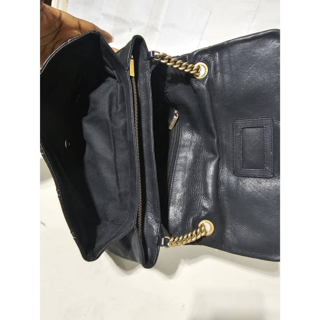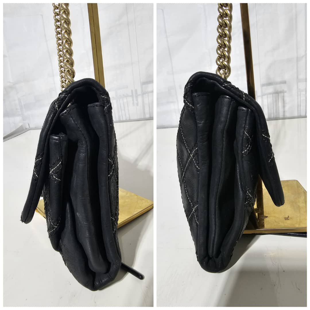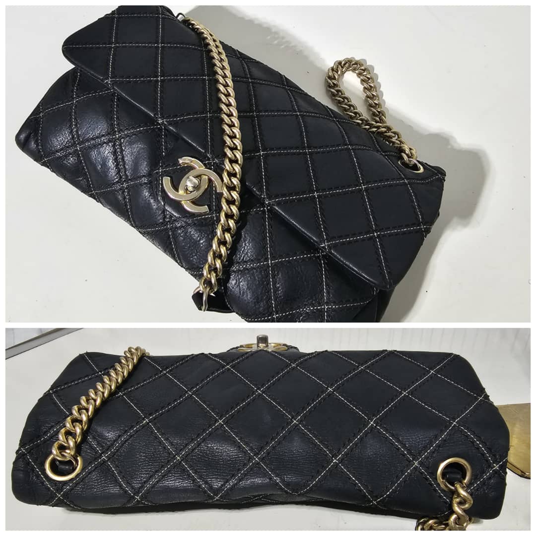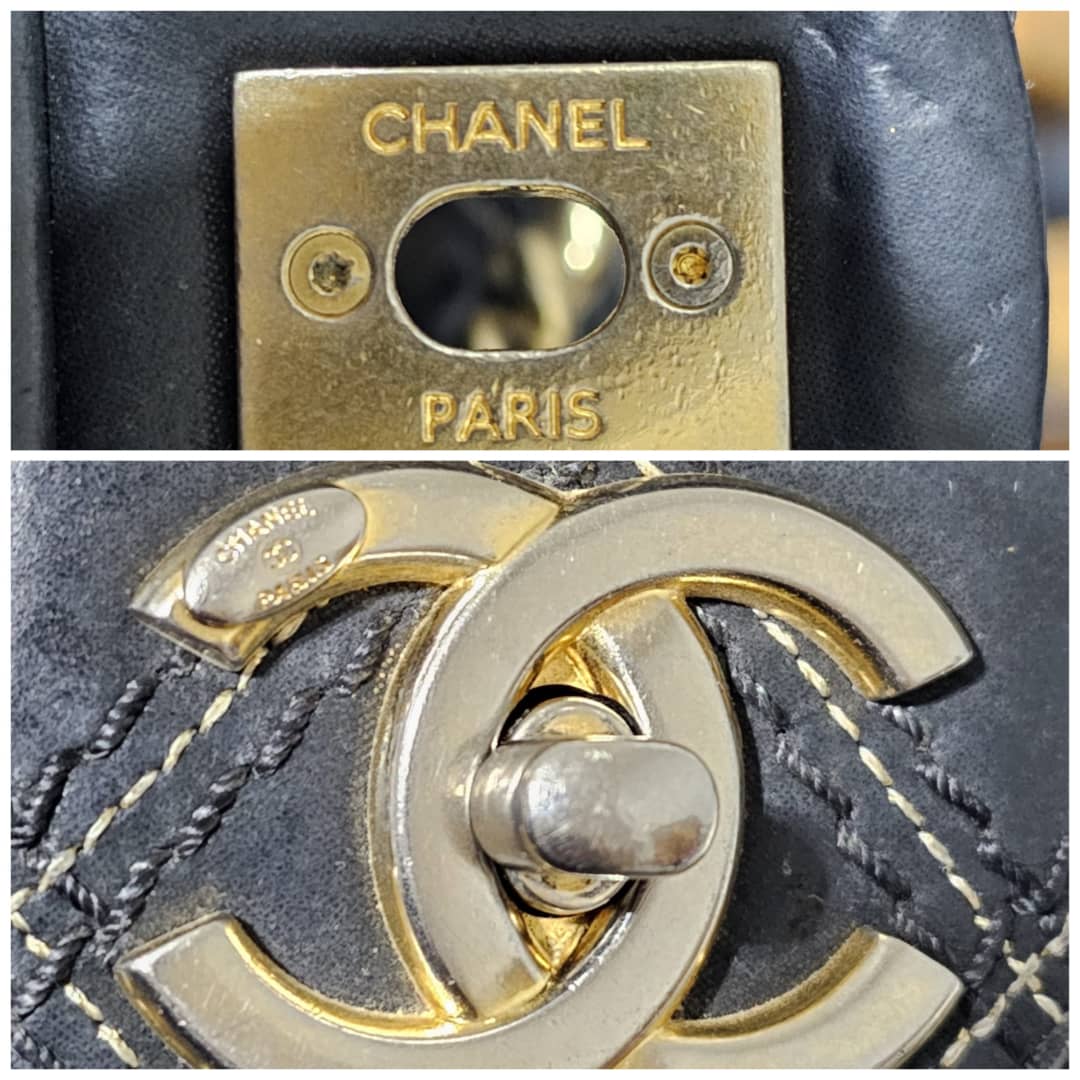 This authentic Chanel Iridescent Stitch Flap Bag Black Quilted Leather Medium handbag/ Shoulder Bag is in its good preowned condition. The exterior leather is clean and beautiful interior is clean and beautiful. Great Shoulder Bag. This Chanel Iridescent Stitch Flap Bag Quilted Leather Medium, crafted in black quilted leather, features chain link strap with leather pad and gold-tone hardware. Its CC turn-lock closure opens to a blue fabric interior.