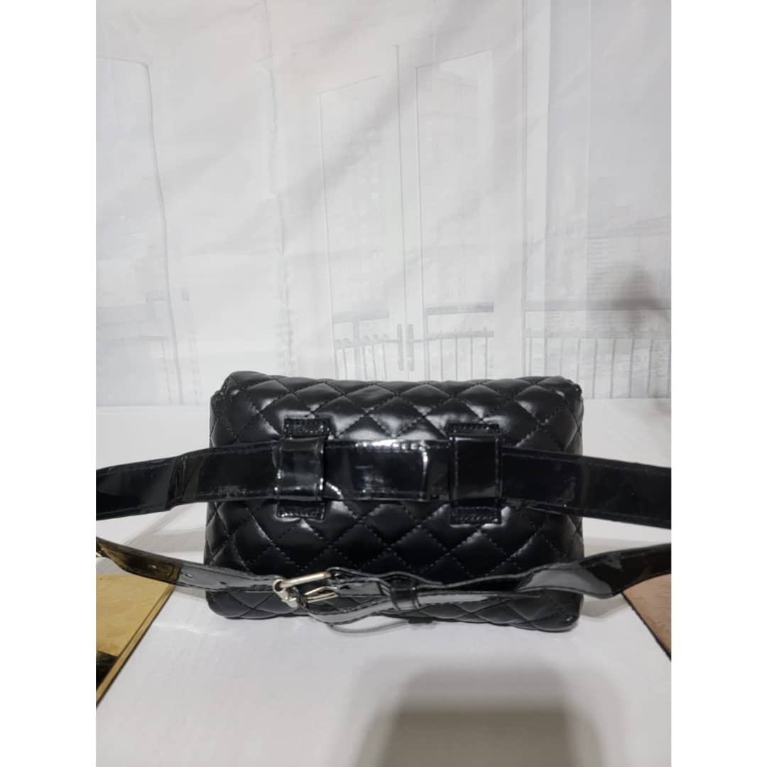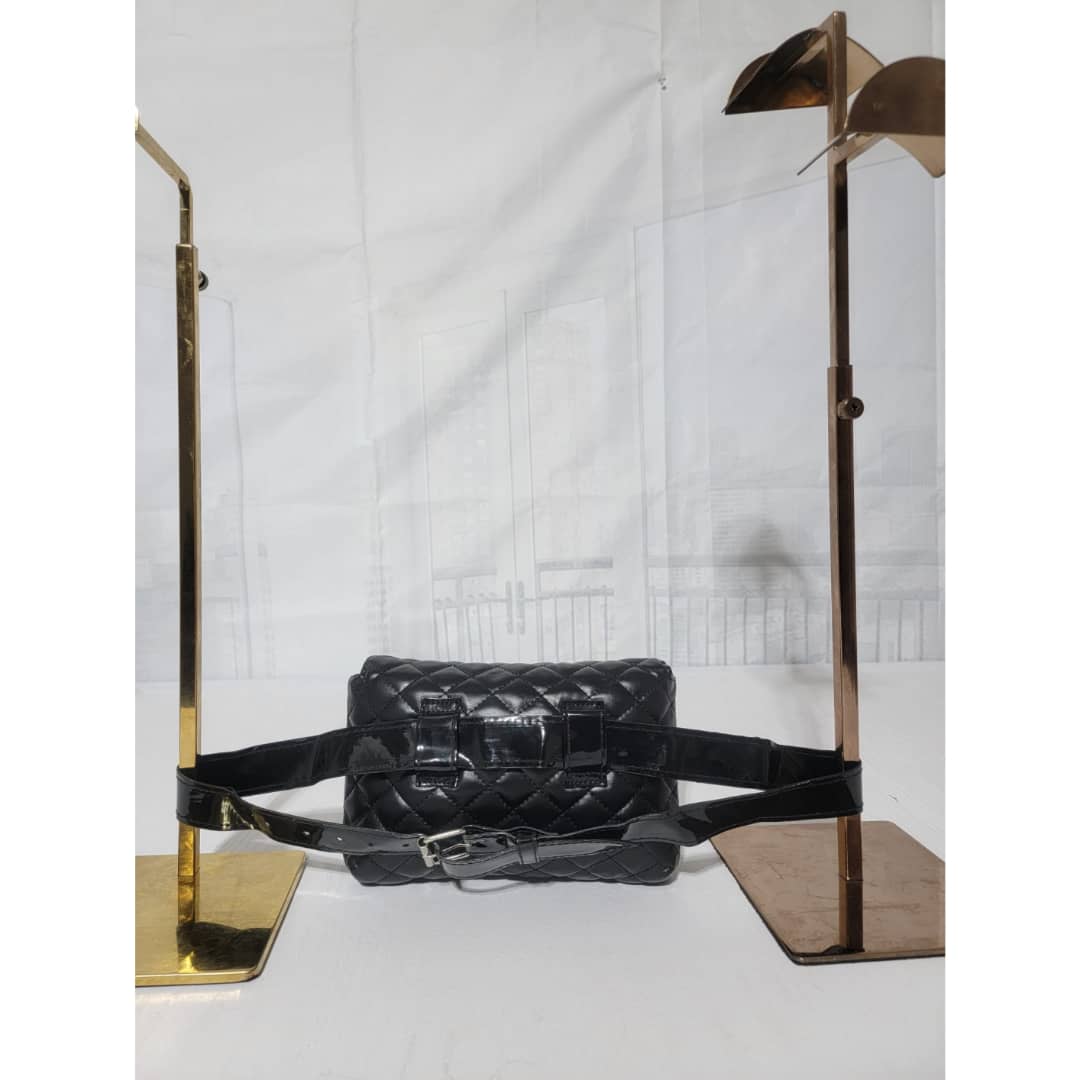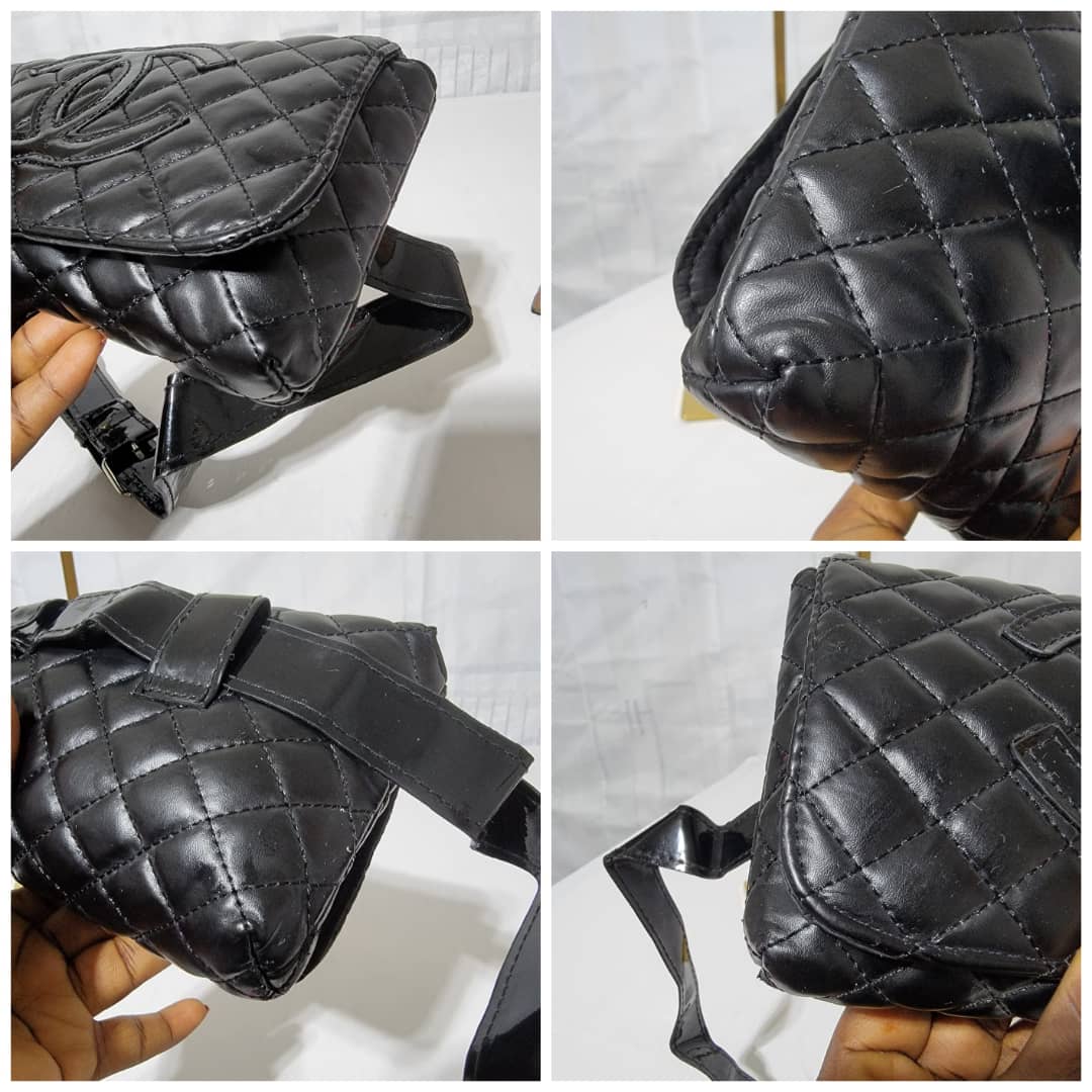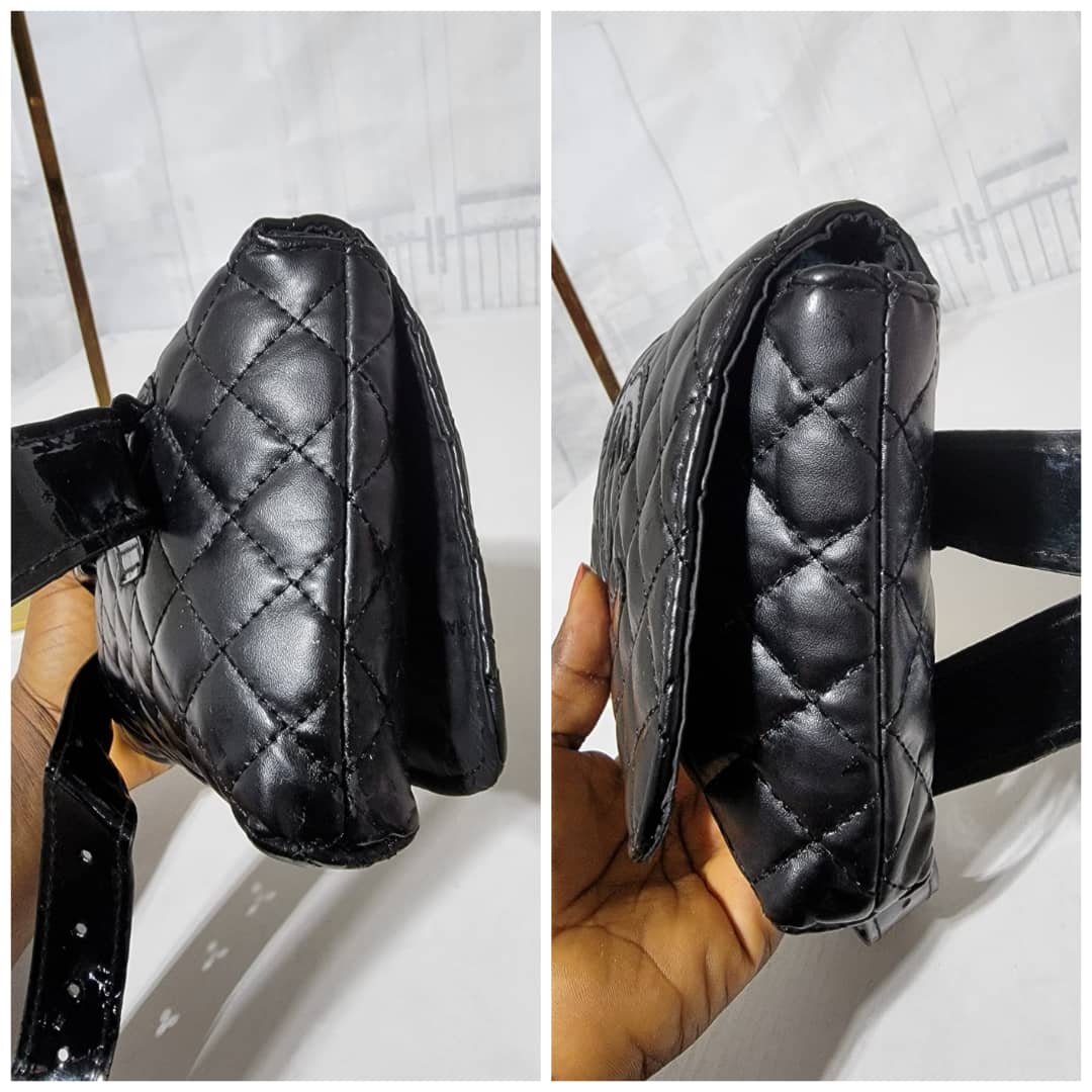 This authentic Chanel Lambskin and Patent Leather Strap Make-Up Accessory Belt Bag Black is in it’s good pre-owned condition. The exterior leather is clean and beautiful. Interior is clean.