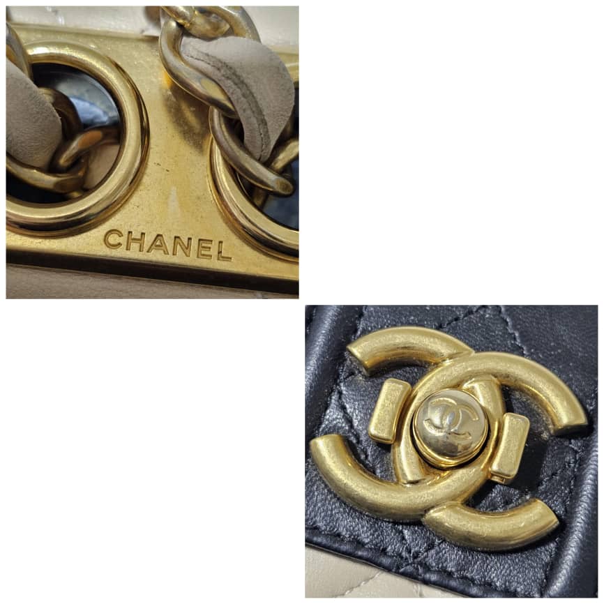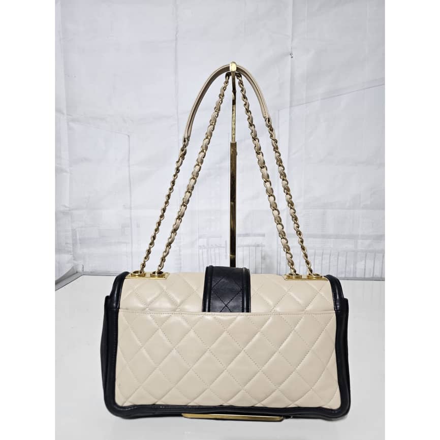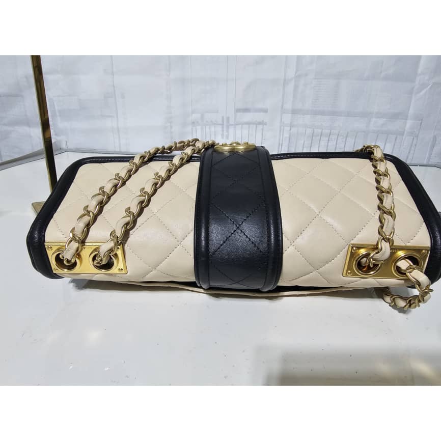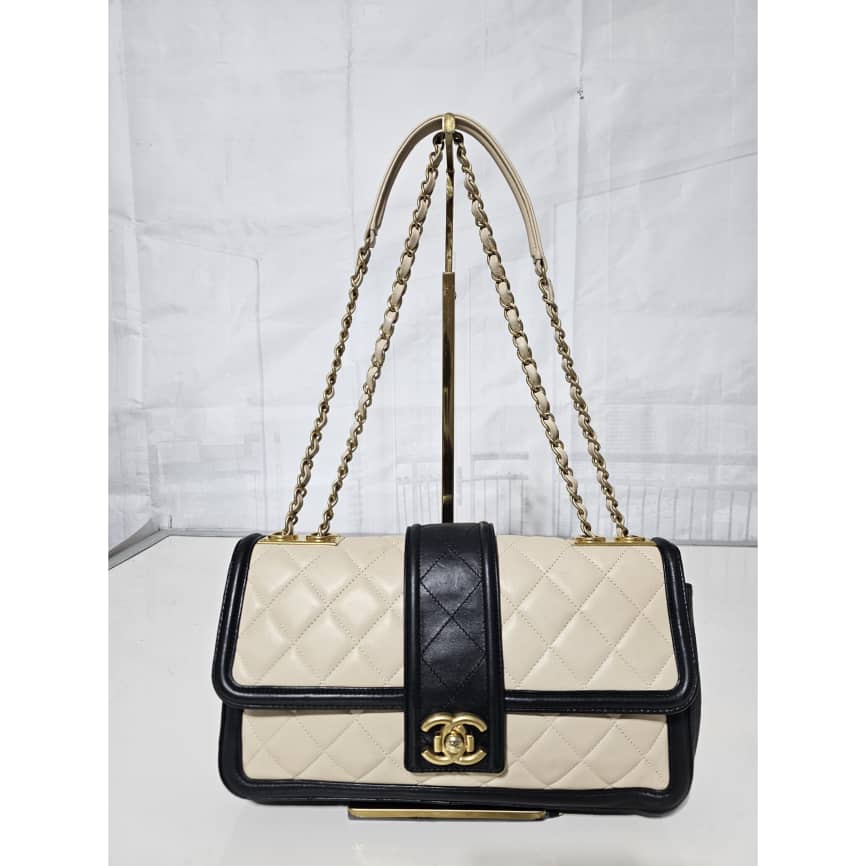 This authentic CHANEL Lambskin Quilted Medium Elegant CC Flap Beige Black is in it’s good pre-owned condition. The exterior lambskin leather is clean and beautiful. The interior is clean. Gold hardware. It can be worn as a shoulder/crossbody bag.