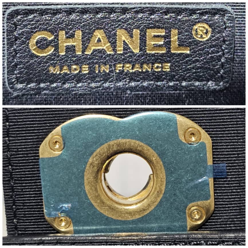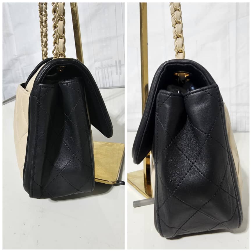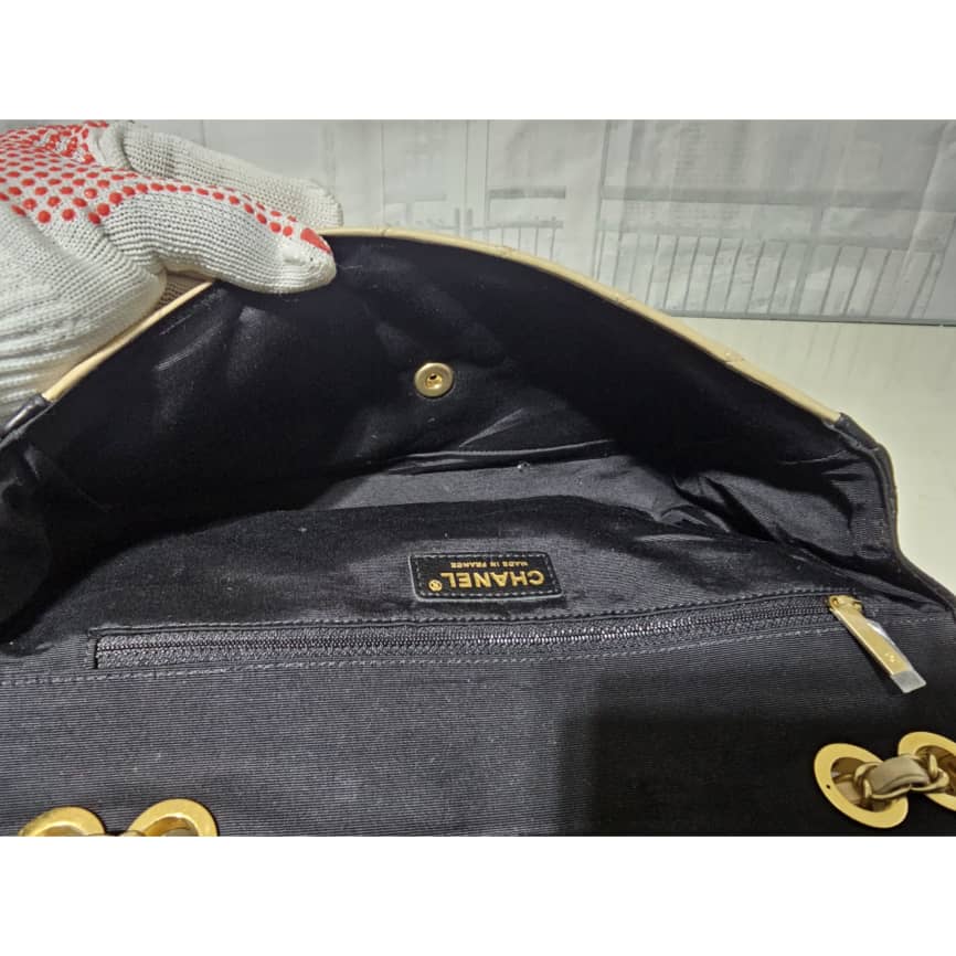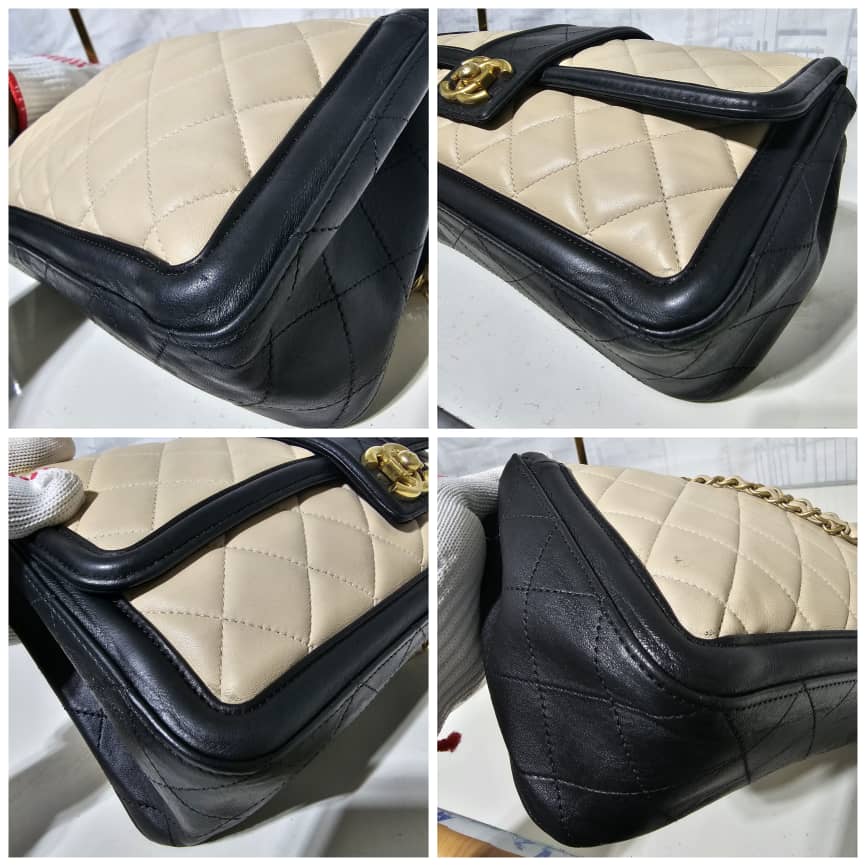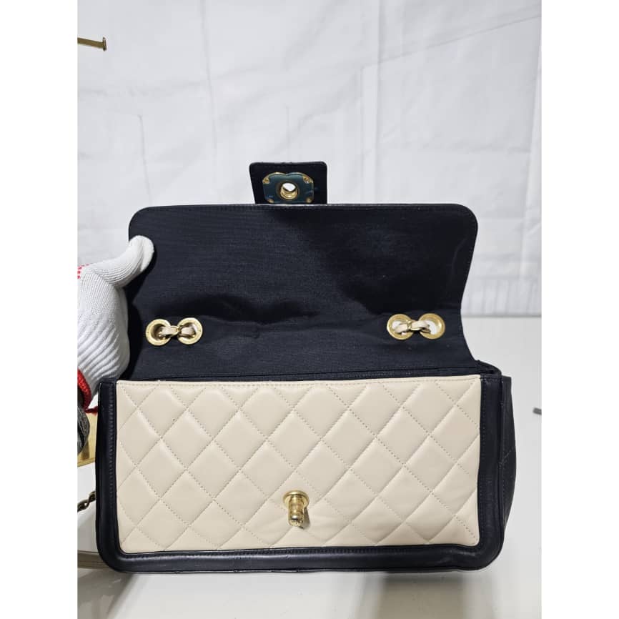 This authentic CHANEL Lambskin Quilted Medium Elegant CC Flap Beige Black is in it’s good pre-owned condition. The exterior lambskin leather is clean and beautiful. The interior is clean. Gold hardware. It can be worn as a shoulder/crossbody bag.